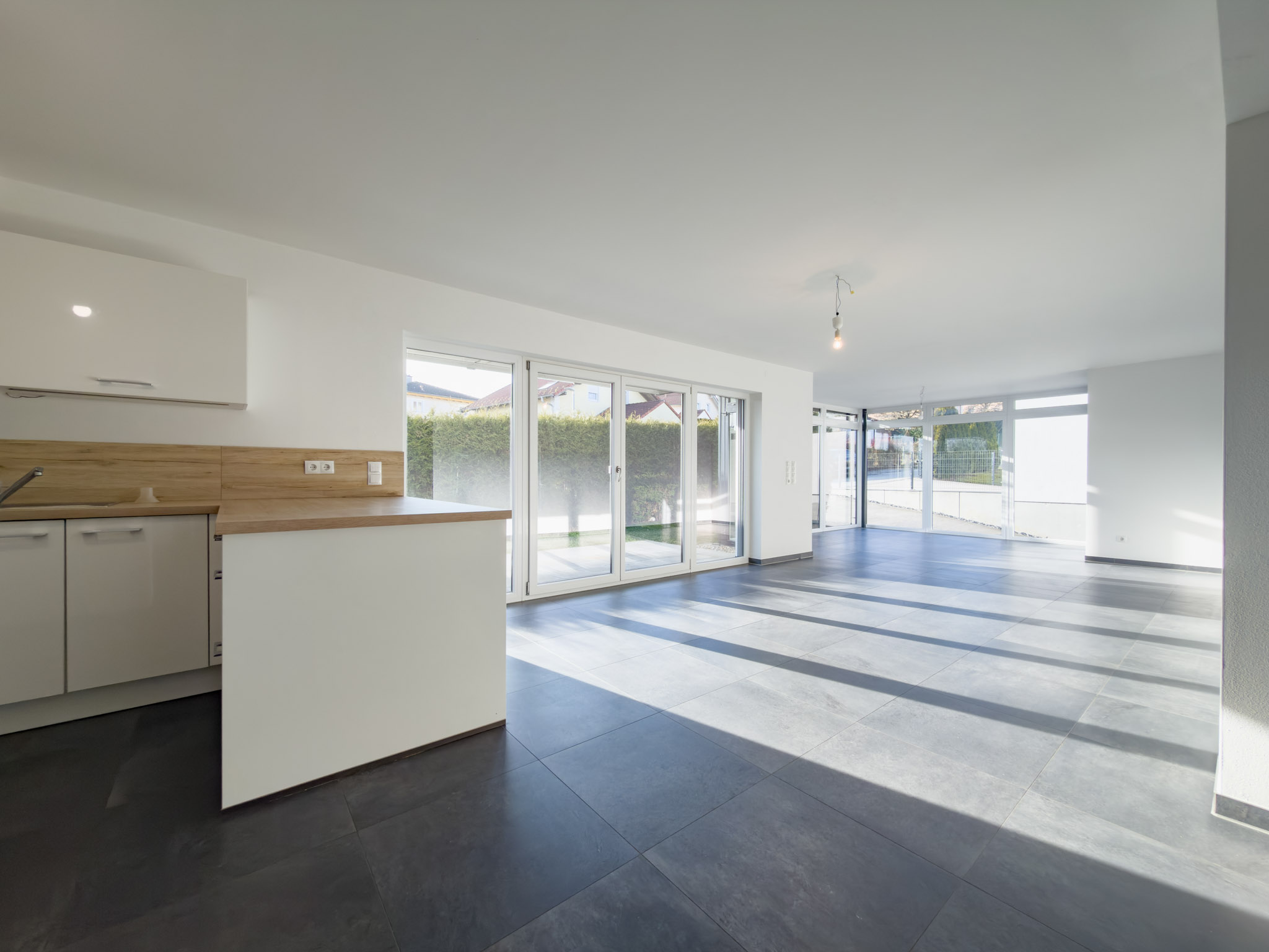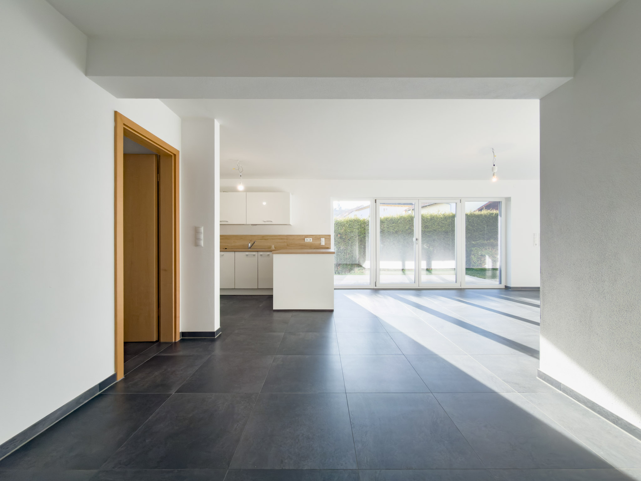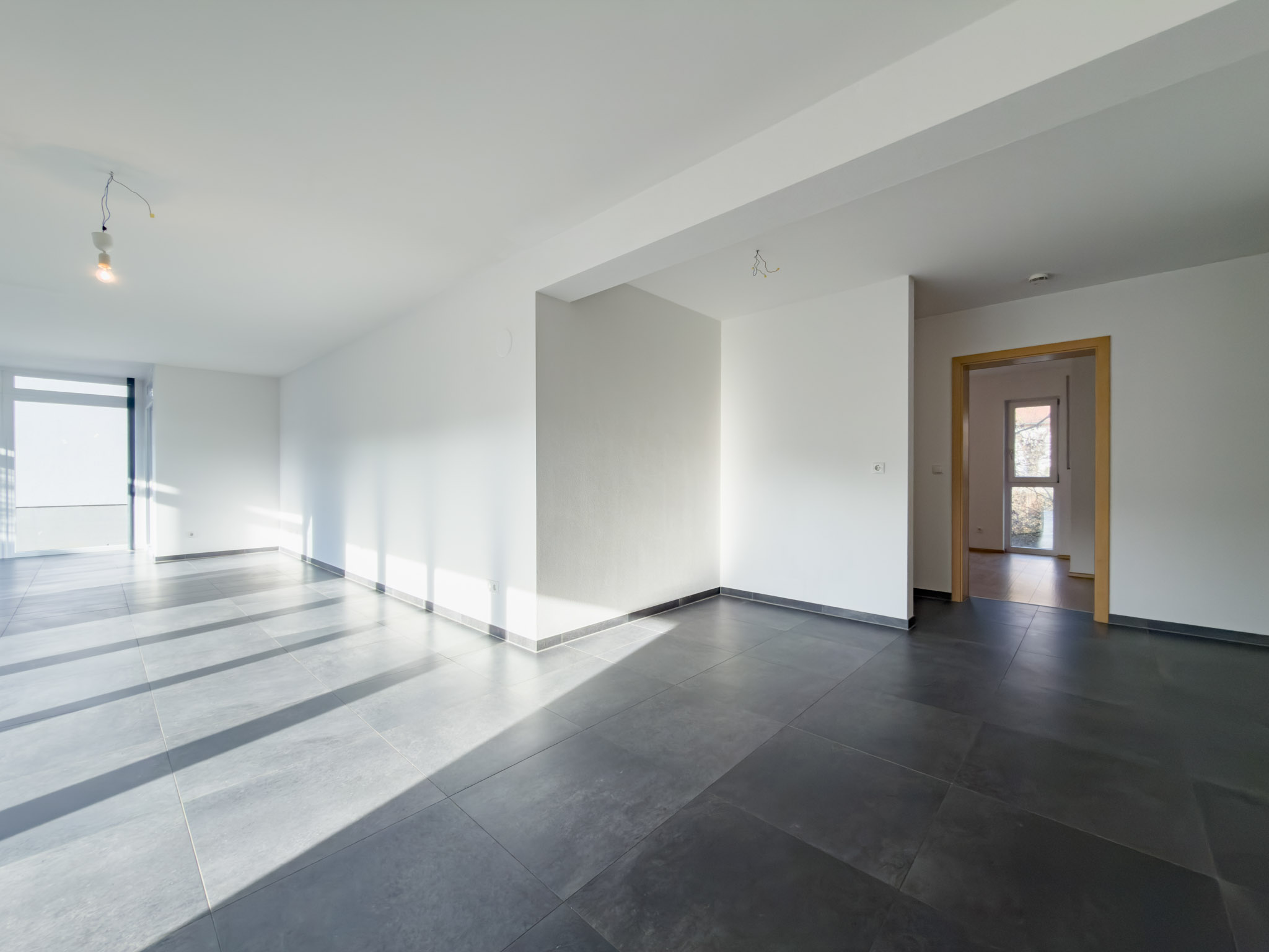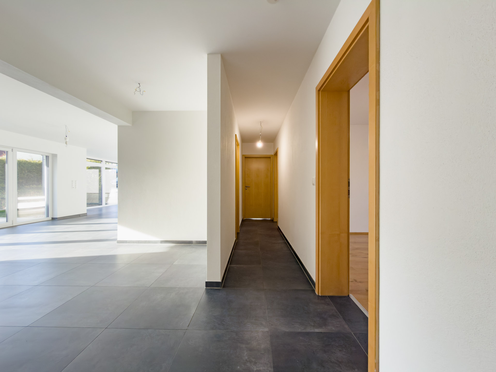 – anthrazitfarbene, großformatige Fliesen im Wohn-/Essbereich und im Flur
