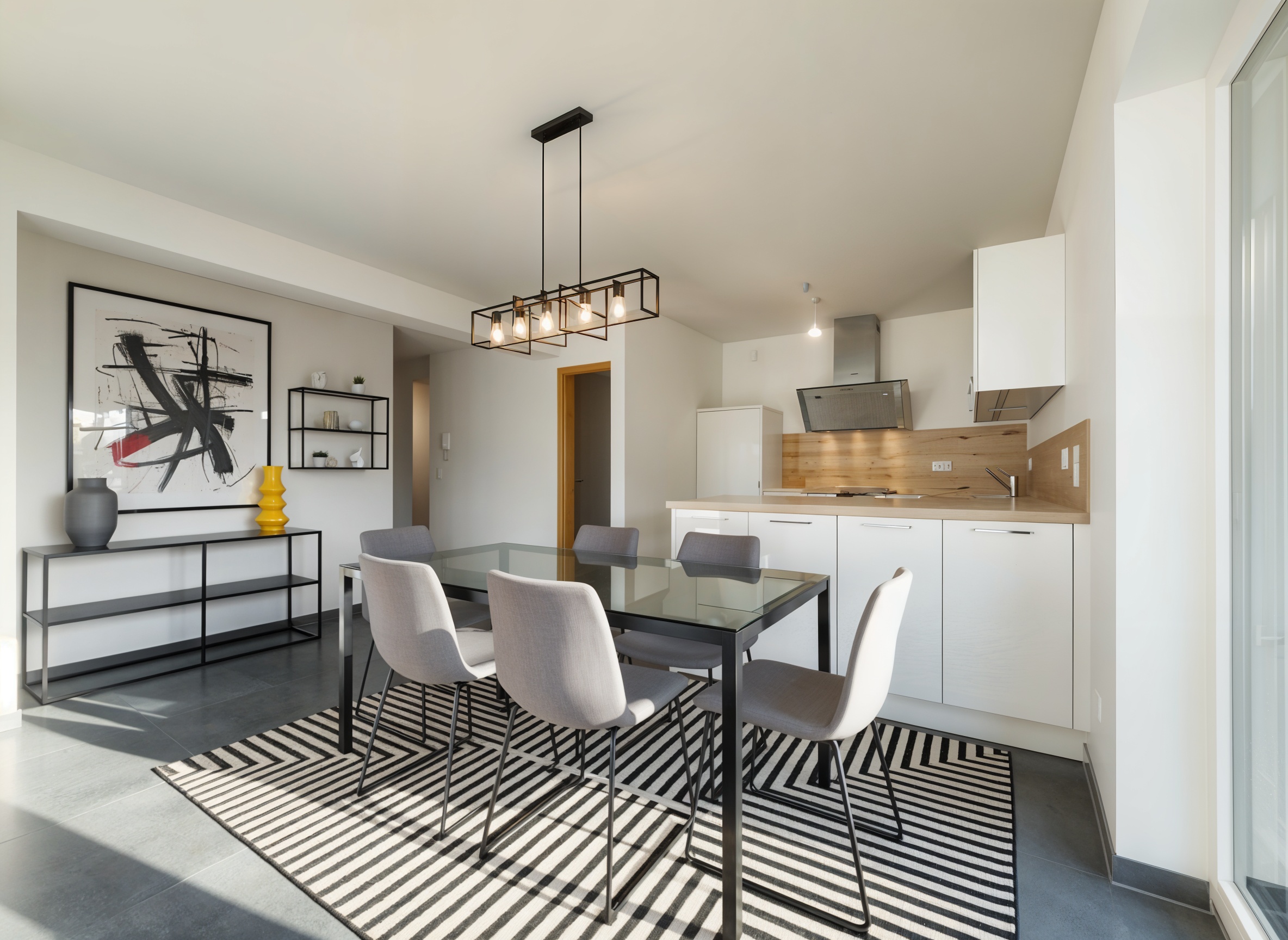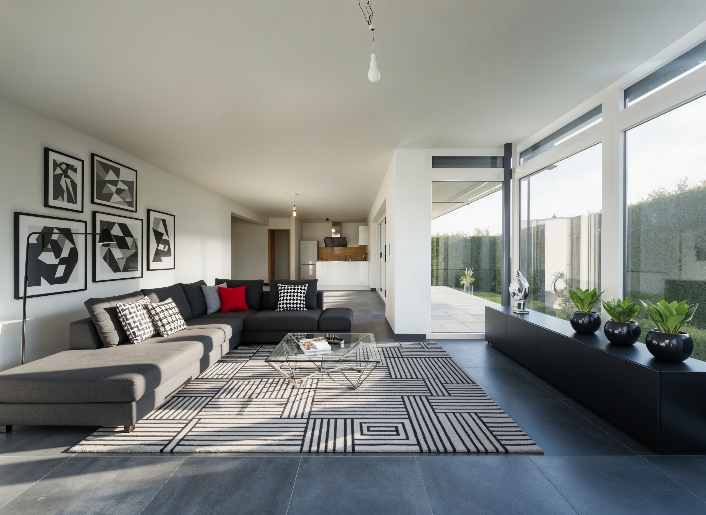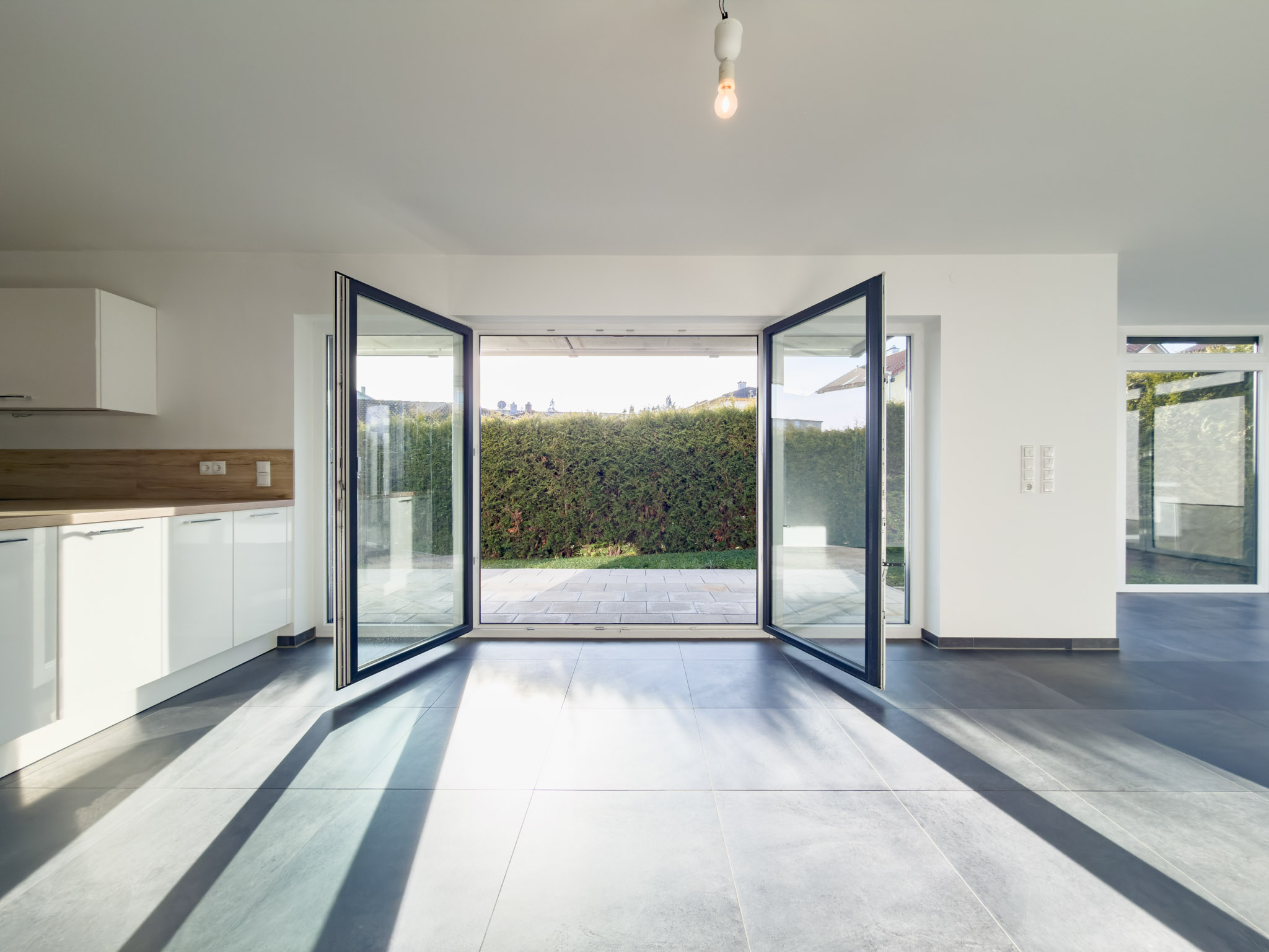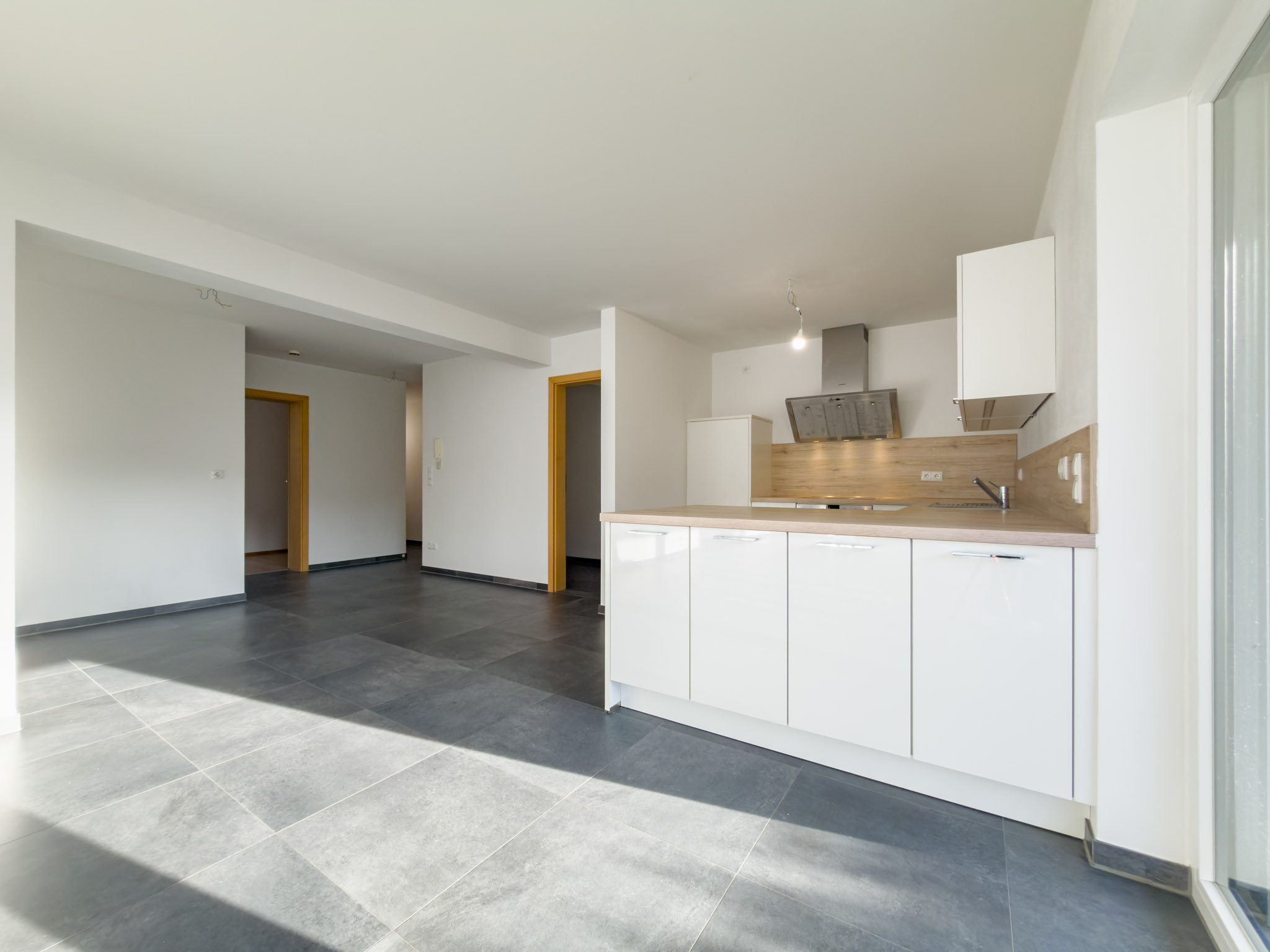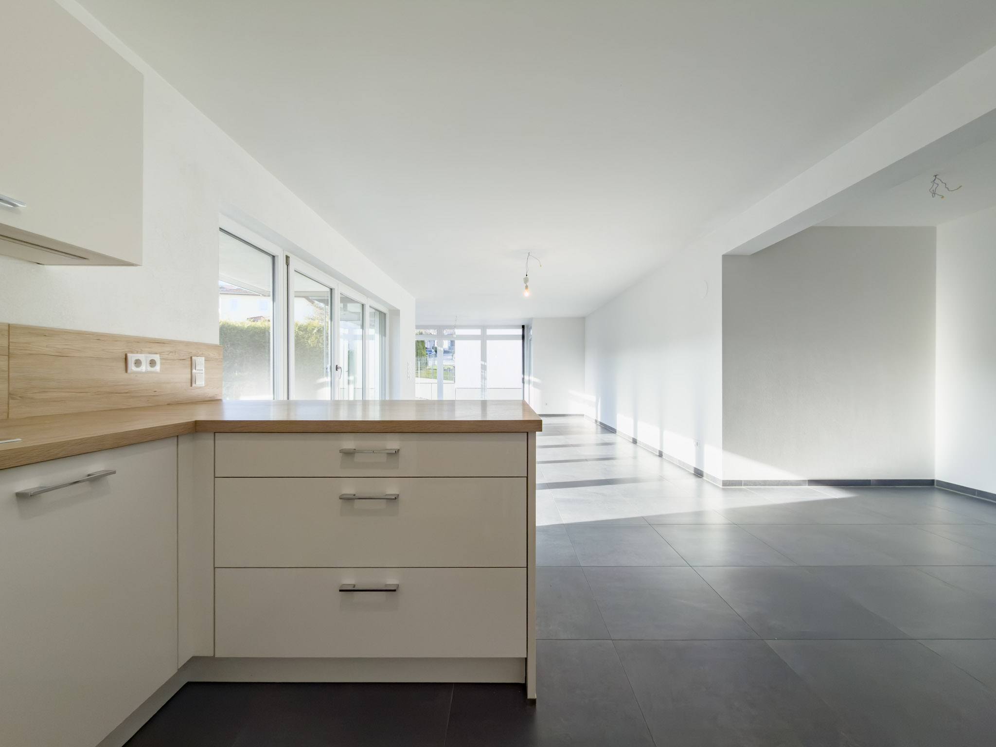 – anthrazitfarbene, großformatige Fliesen im Wohn-/Essbereich und im Flur