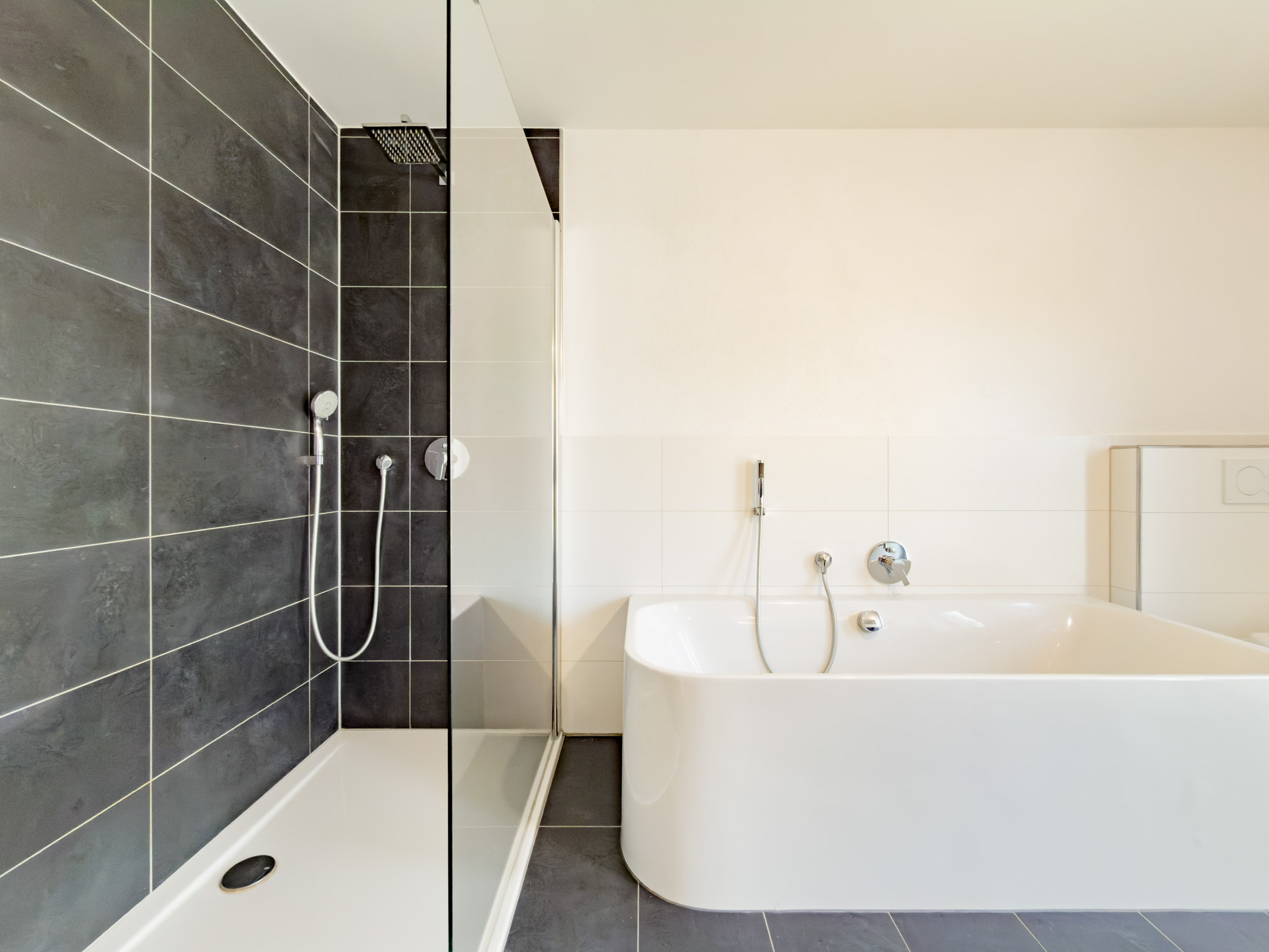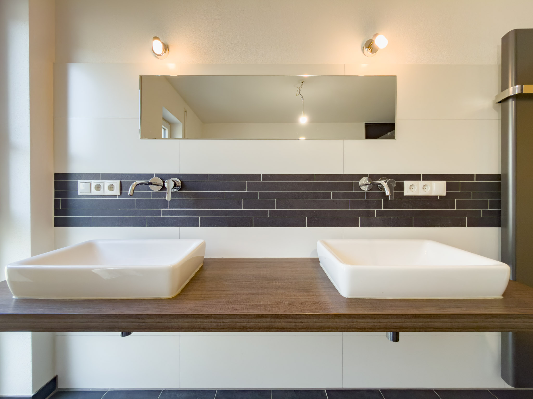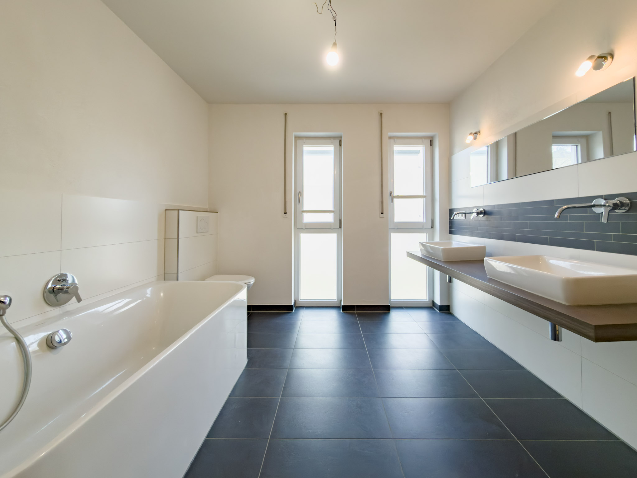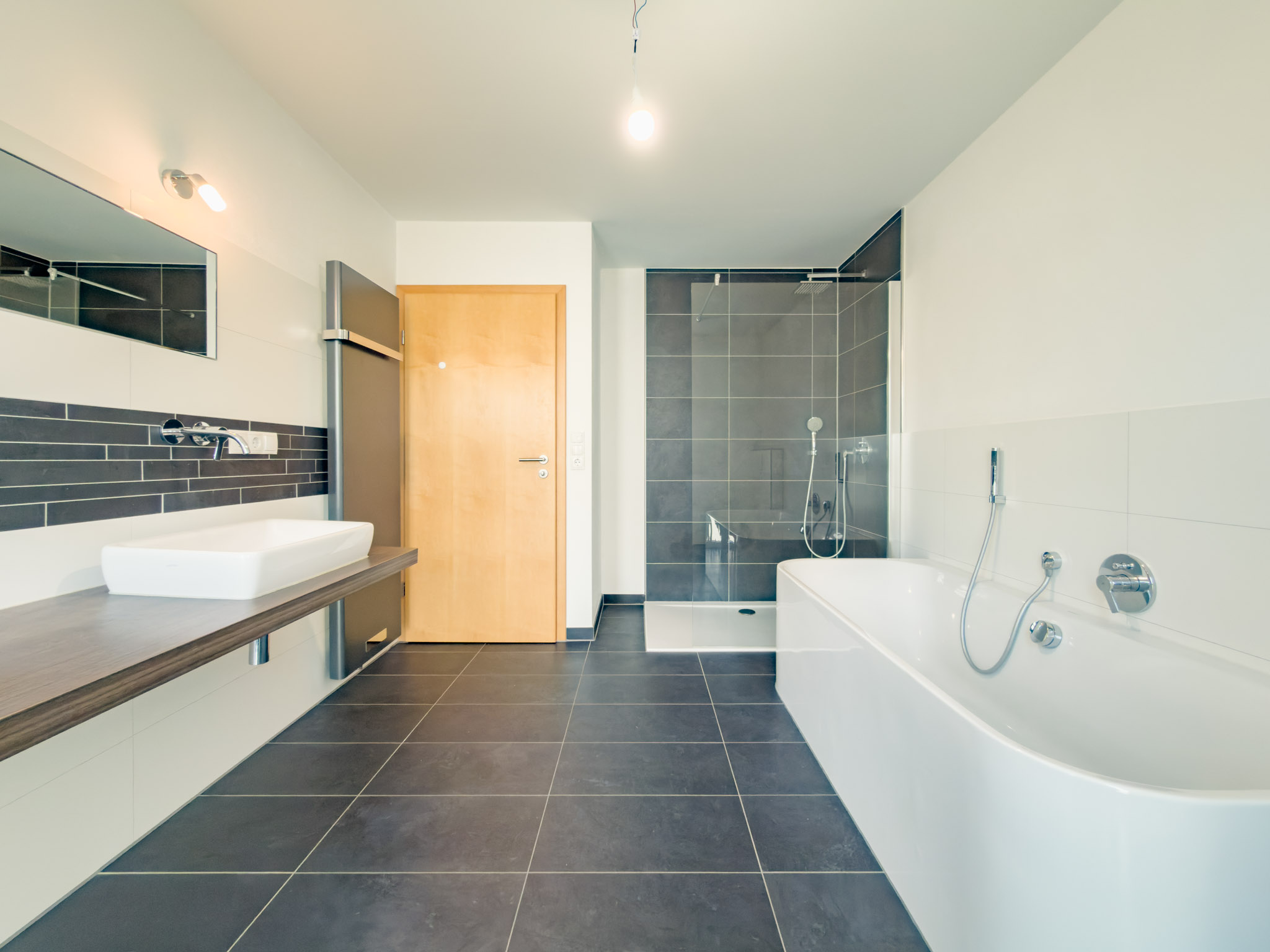 – Tageslichtbad mit XXL-Regendusche, halb freistehender Badewanne, Doppelwaschtisch, WC und Handtuchheizkörper