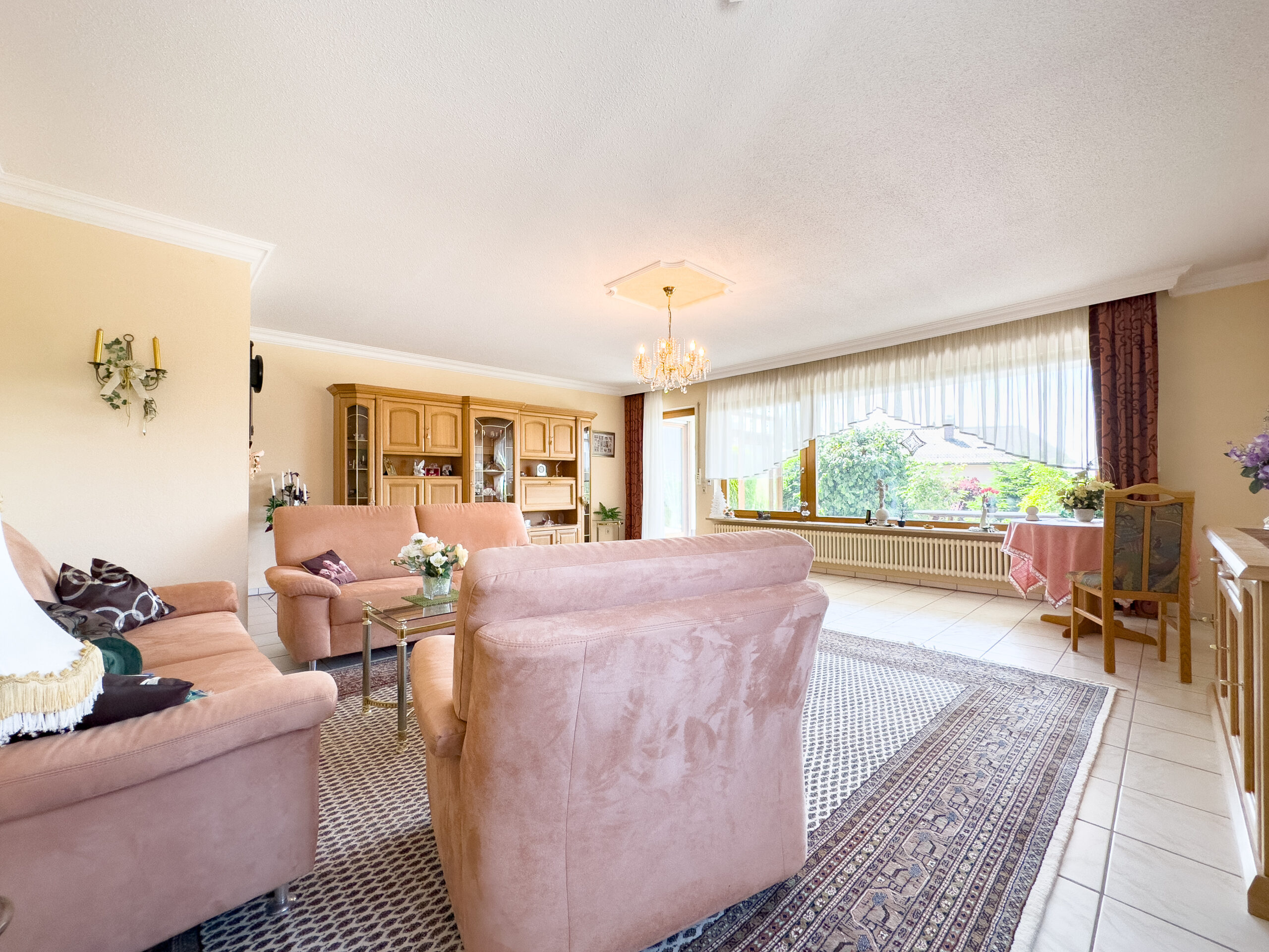 – großzügiges Wohnzimmer mit großer Fensterfront und schönem Blick in den Garten