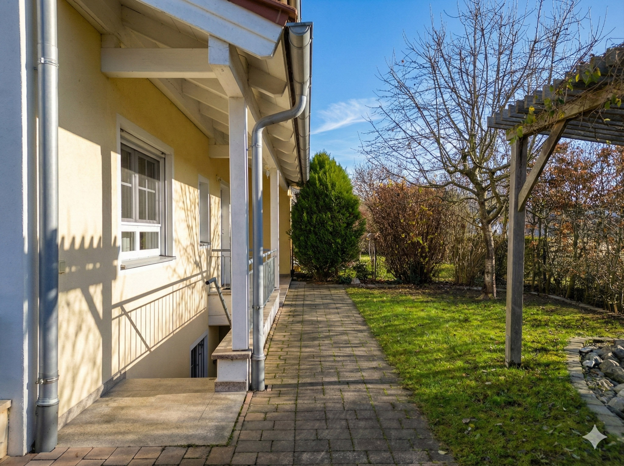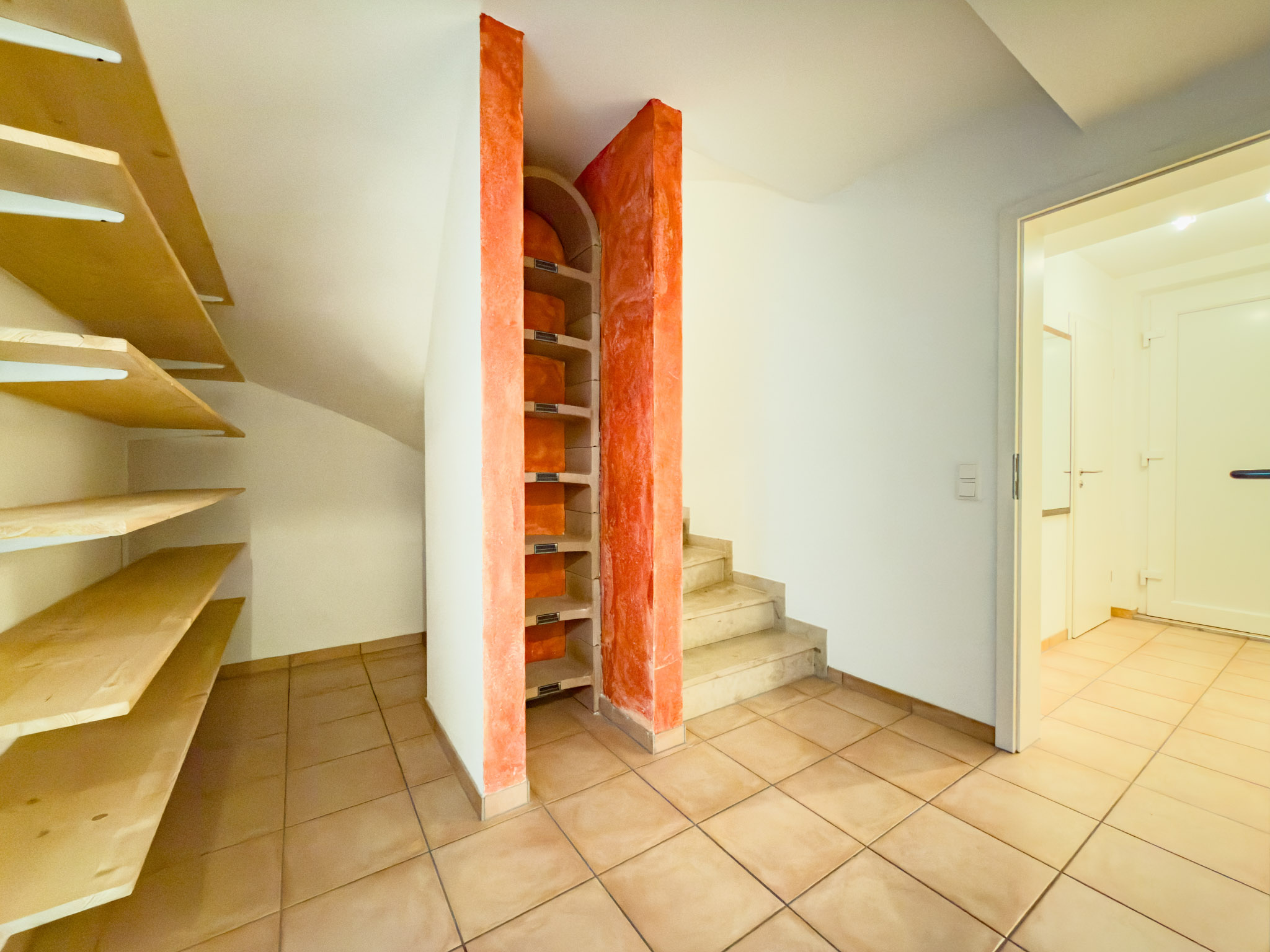 Ein echtes Ass im Ärmel ist der wohnlich ausgebaute Bereich im Kellergeschoss: mit eigenem Tageslichtbad, Singleküche und separatem Außenzugang über eine Außentreppe. Das ist ideal, wenn Du ein ruhiges Homeoffice mit Kundenkontakt brauchst, wenn ältere Kinder ihren eigenen Bereich möchten, wenn Gäste länger bleiben – oder wenn Du einfach die Freiheit magst, einen Teil des Hauses unabhängig nutzen zu können. Dazu kommen ein großer Technik- und Hauswirtschaftsraum mit Anschlüssen für die Waschmaschine und den Trockner, ein gefliester Lagerraum und sogar ein gemauertes Weinregal im Flur.