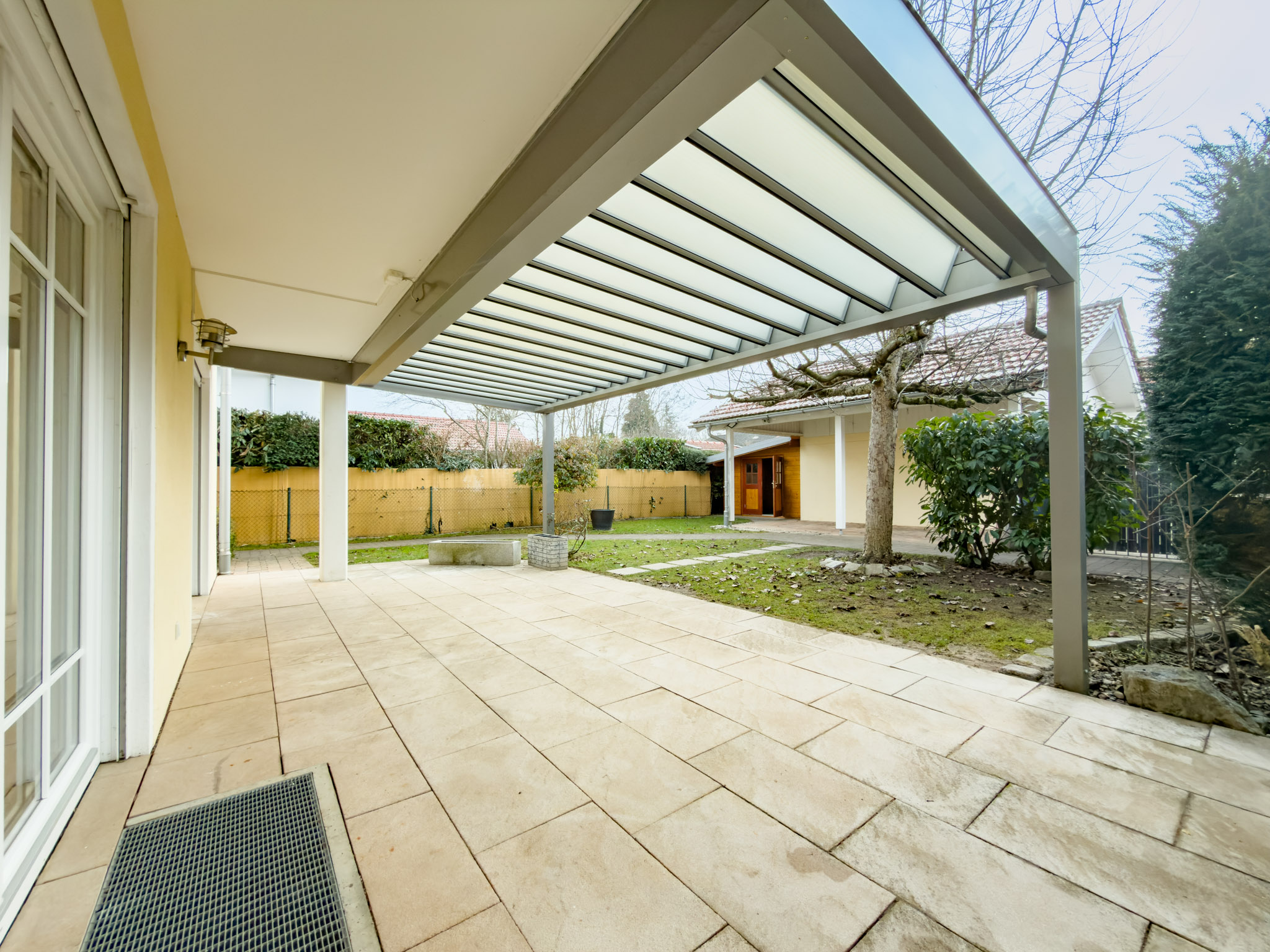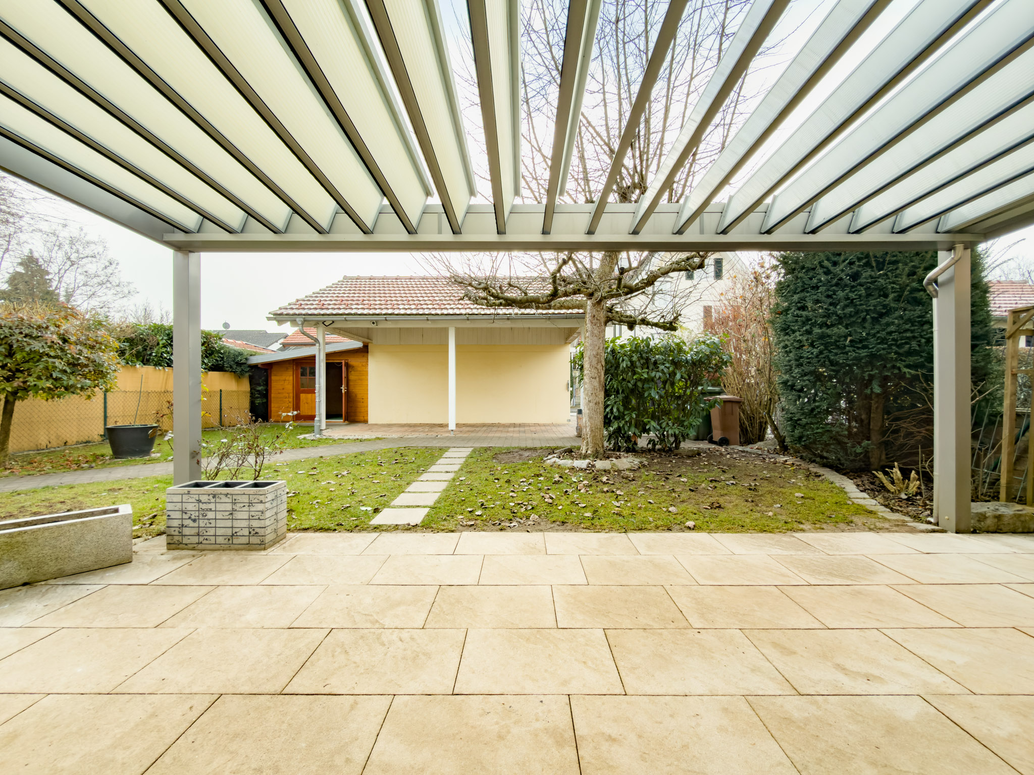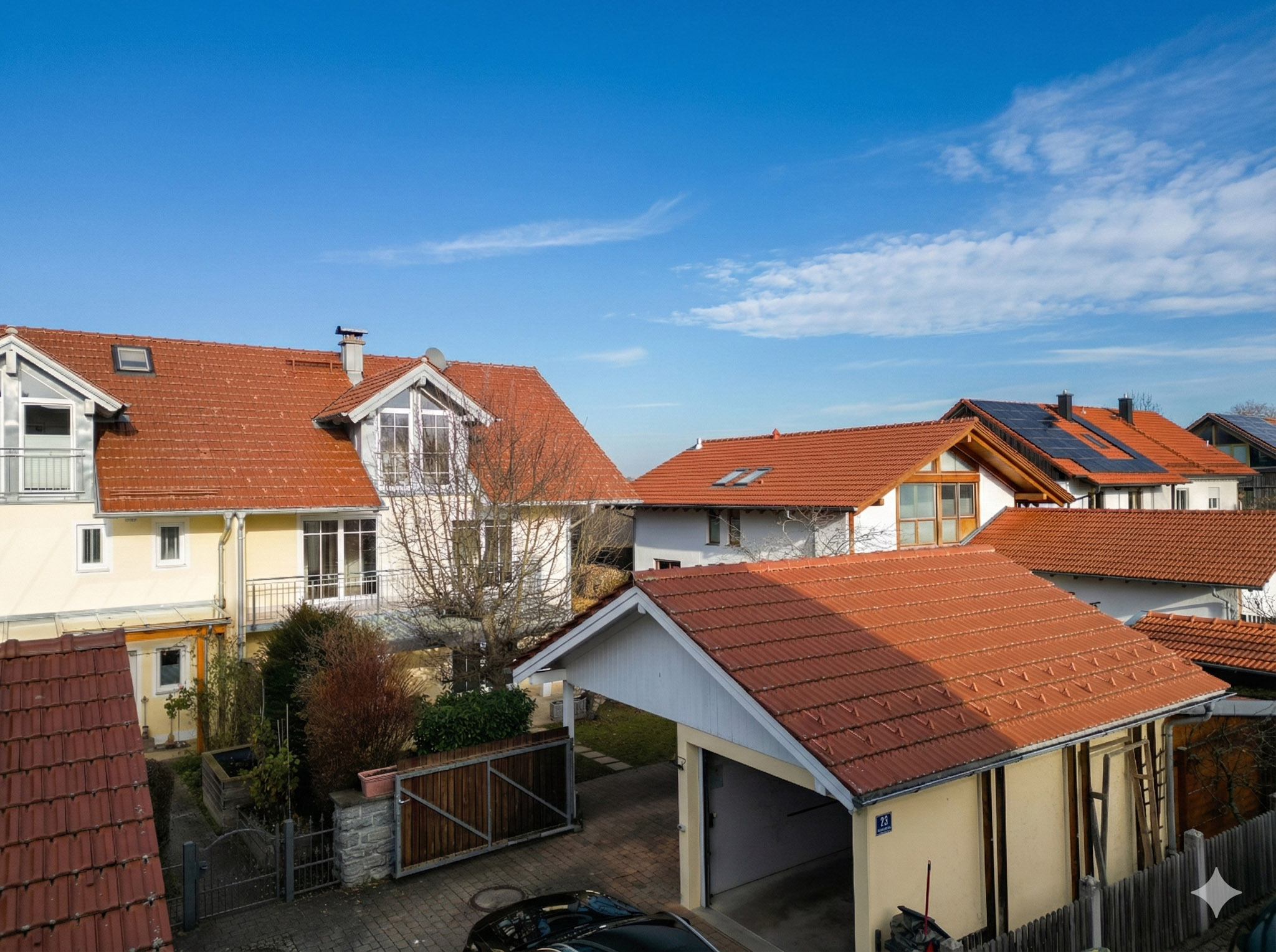 Draußen passt alles zum Gesamtgefühl: ein gepflegter und pflegeleicht angelegter Garten, angenehm privat, in einer ruhiger Siedlungsstruktur. Zwei überdachte Terrassen geben Dir die Wahl zwischen Sonne und Schatten – die große Süd-Terrasse mit rund 30 m² und zusätzlich eine gemütliche, überdachte Terrasse auf der Nord-Ost-Seite. Die Natursteinbeläge wirken hochwertig und unaufgeregt. Die Garage und der Carport sind komfortabel gelöst, jeweils mit elektrischem Tor. Die Garage verfügt über einen Stromanschluss. Dazu gibt es einen praktischer Geräteschuppen.