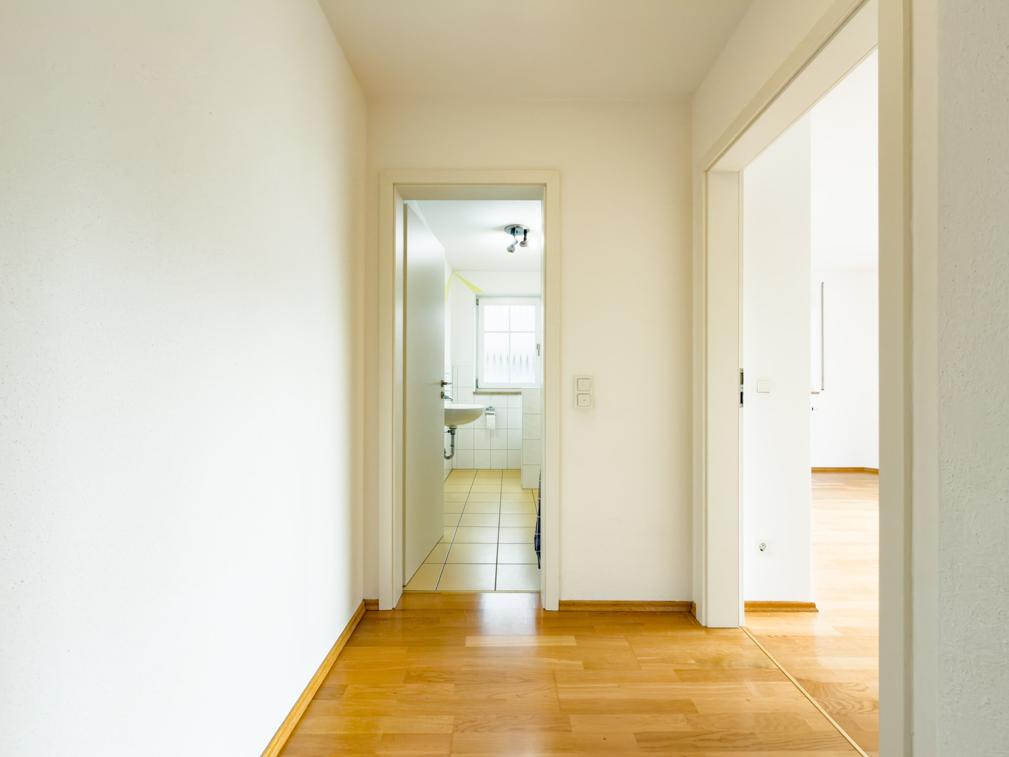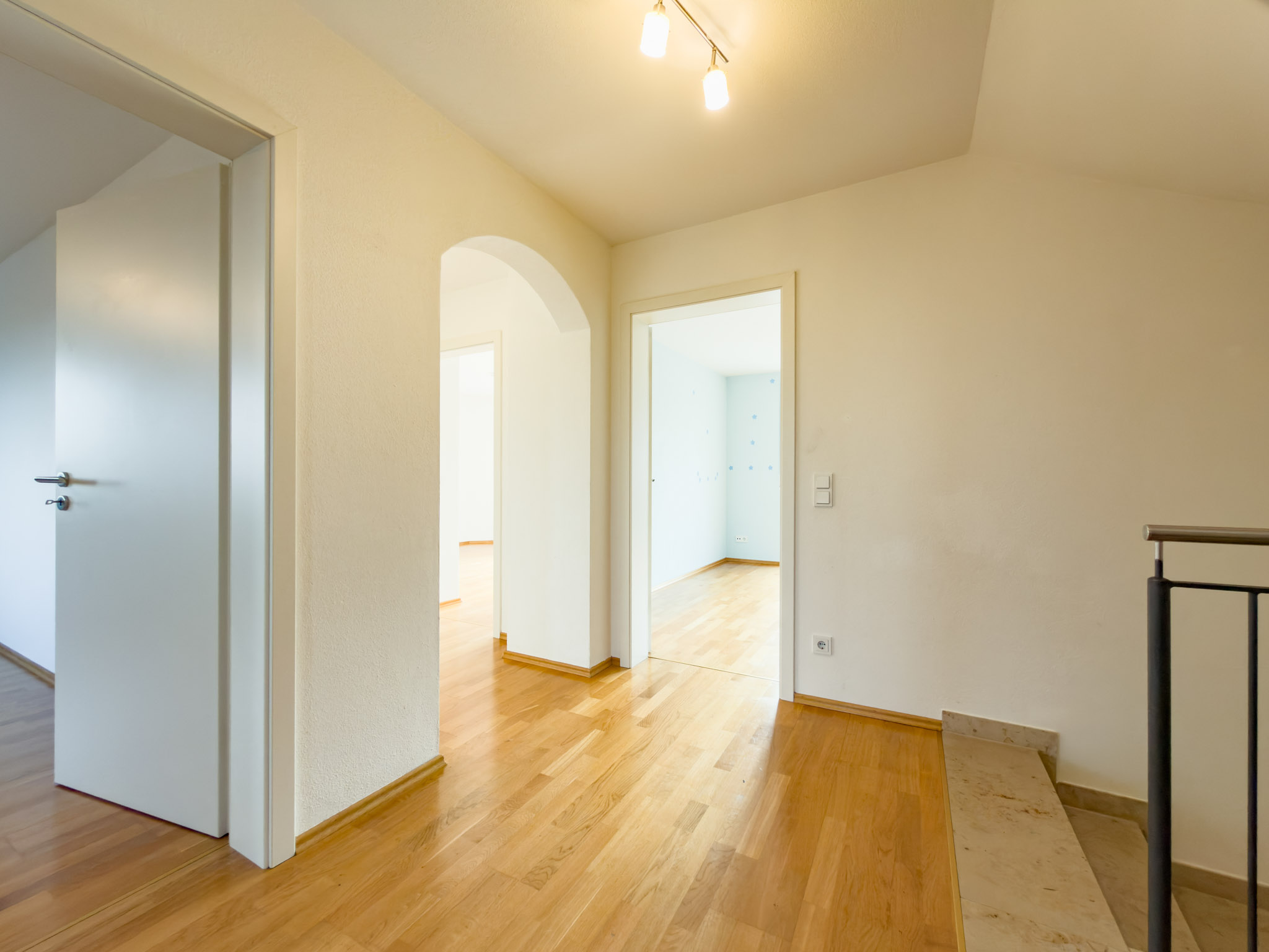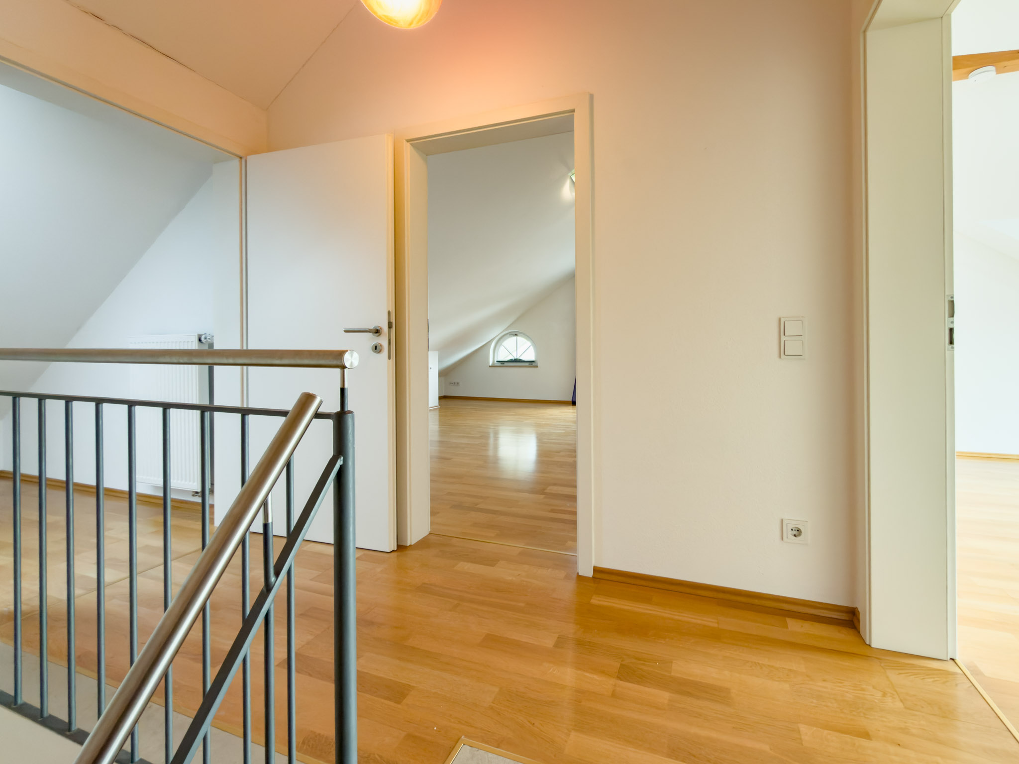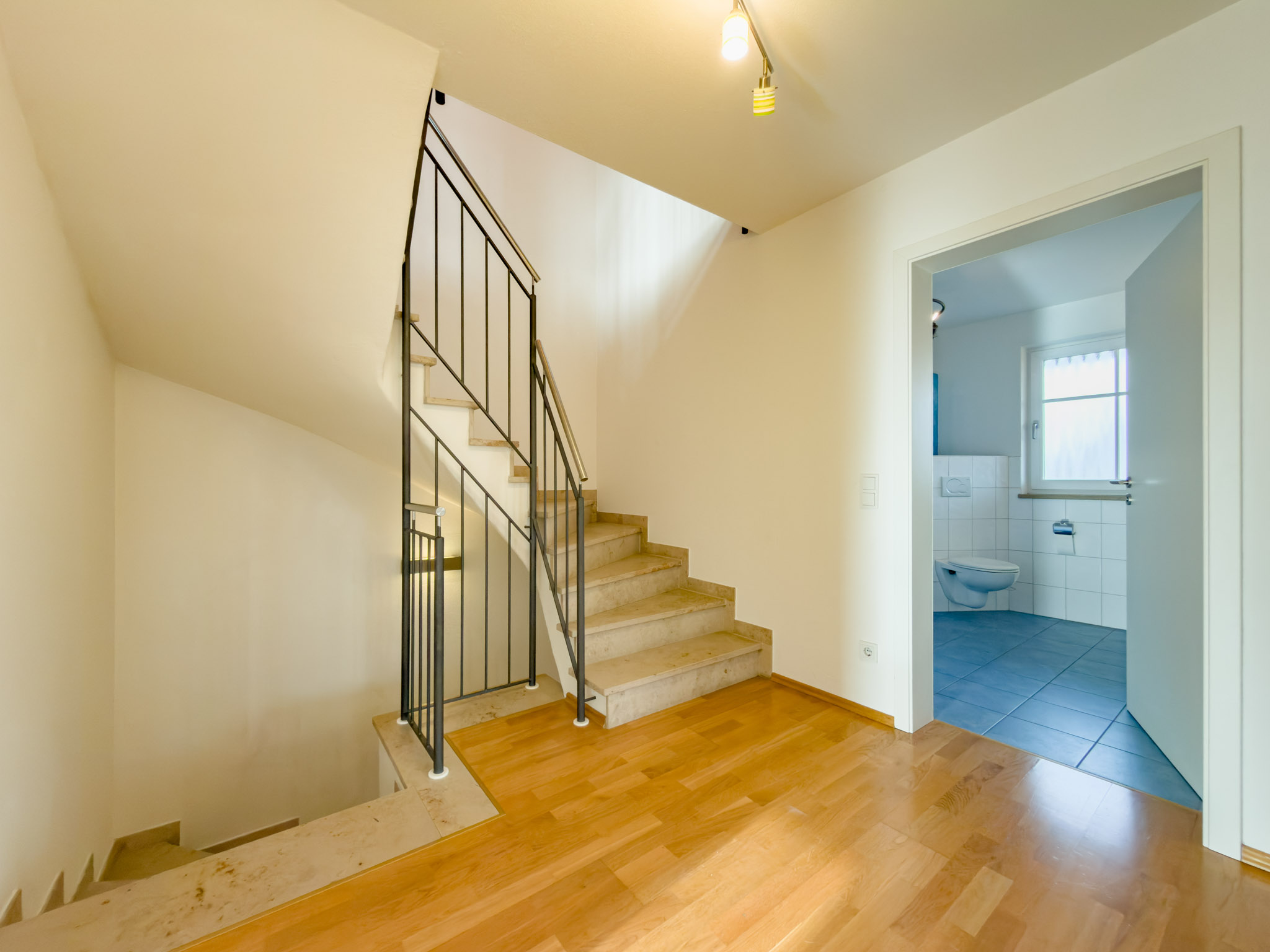 Im Obergeschoss liegen befinden sich drei Schlafzimmer, zwei davon mit Zugang zum Süd-Balkon, der erst kürzlich neu abgedichtet und neu gefliest wurde. Das ist die Etage, die Familien lieben: kurze Wege, genug Platz, und vor allem zwei moderne Tageslichtbäder mit Fußbodenheizung. Kein Gedränge am Morgen, kein „Wer ist jetzt dran?“. Das Hauptbad mit Wanne und Dusche (mit Marmorboden) wirkt hochwertig und durchdacht, das separate Kinderbad ist praktisch – und genau dadurch so komfortabel.