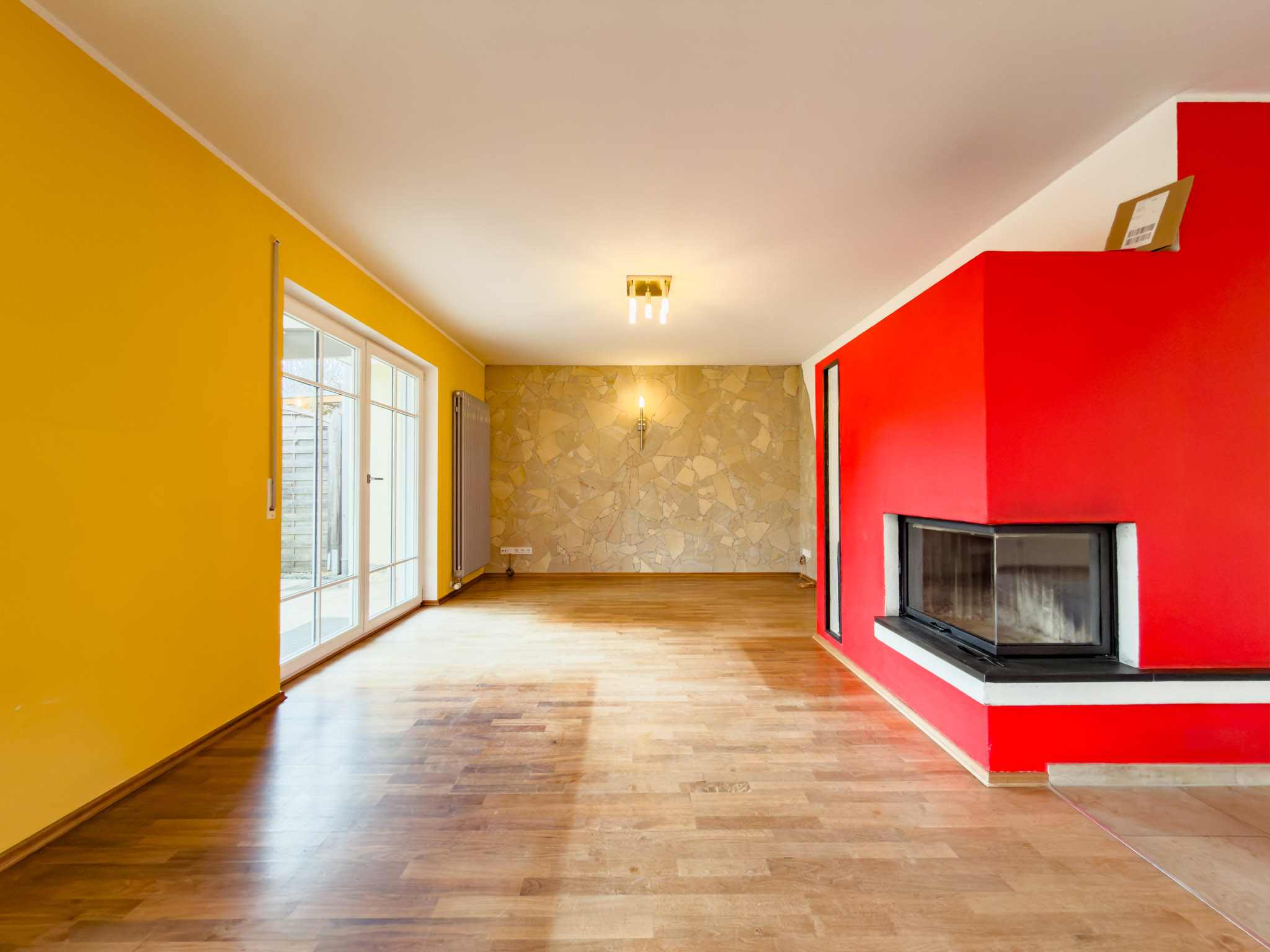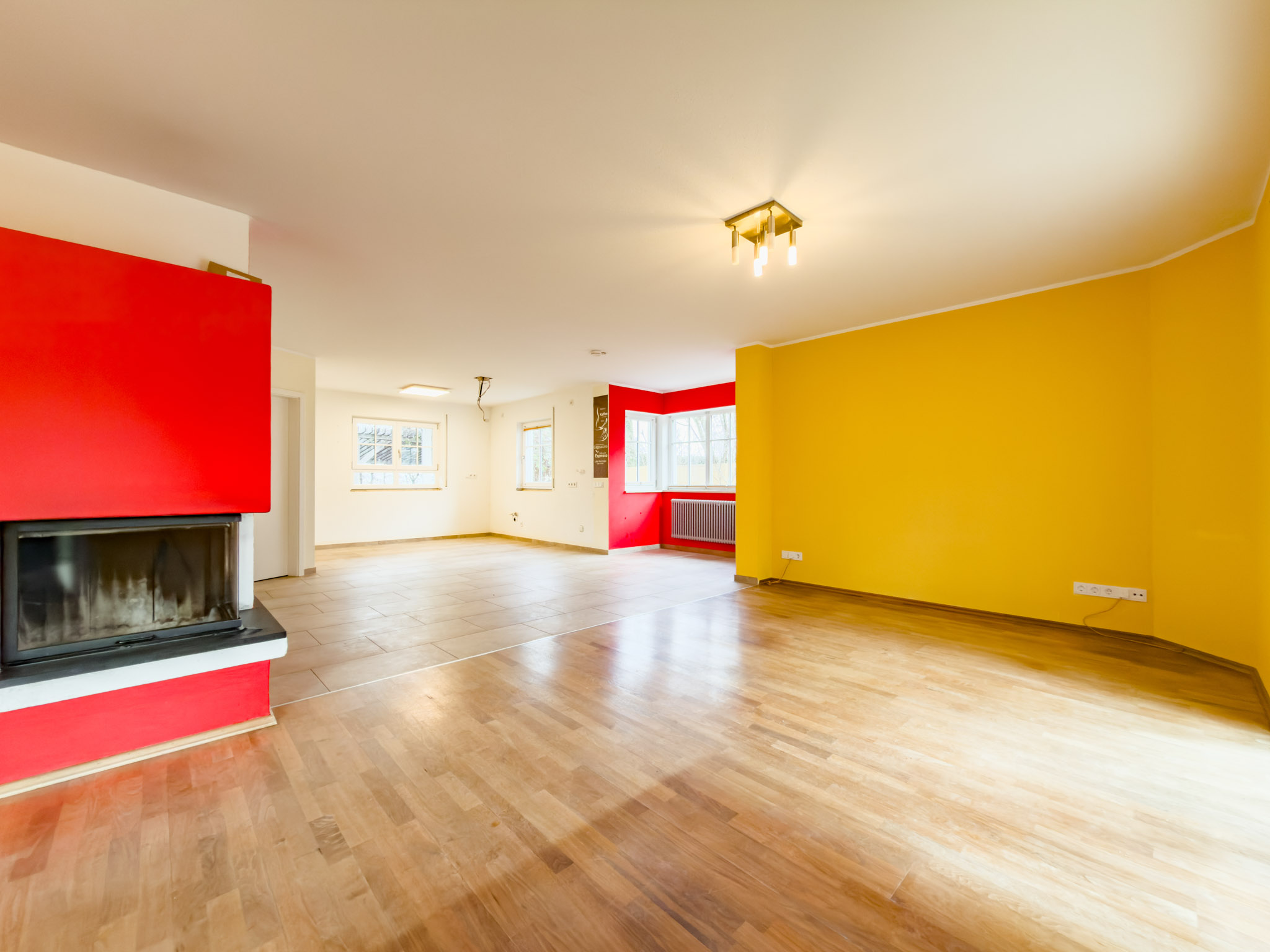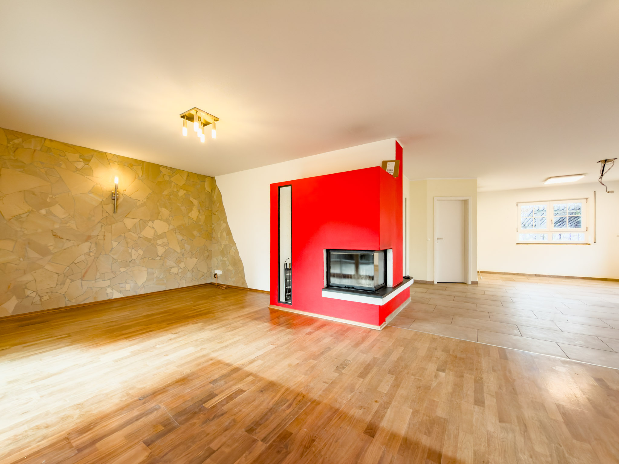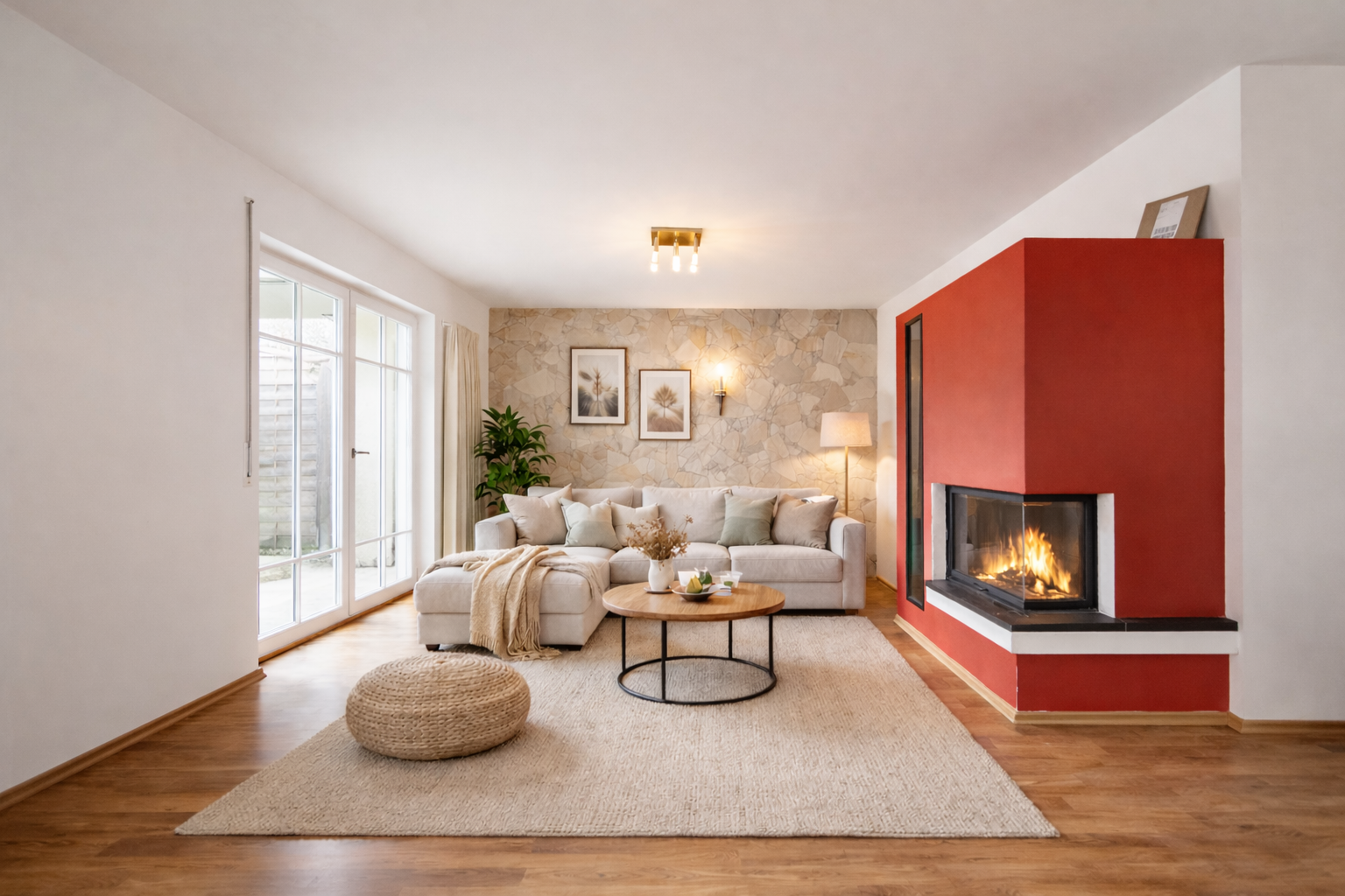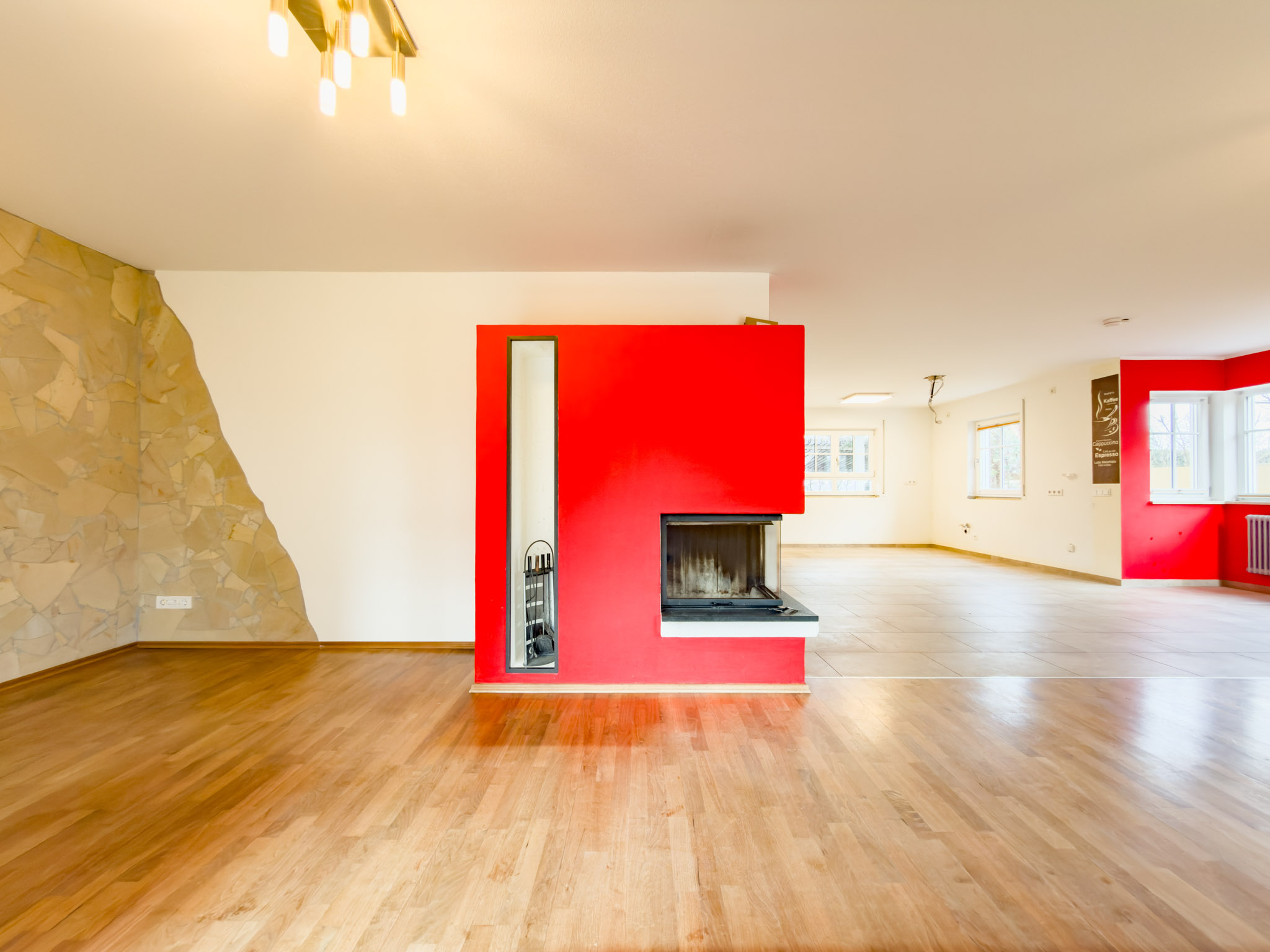 – Eck-Kamin mit großem Sichtfenster als Herzstück des Wohnraumes