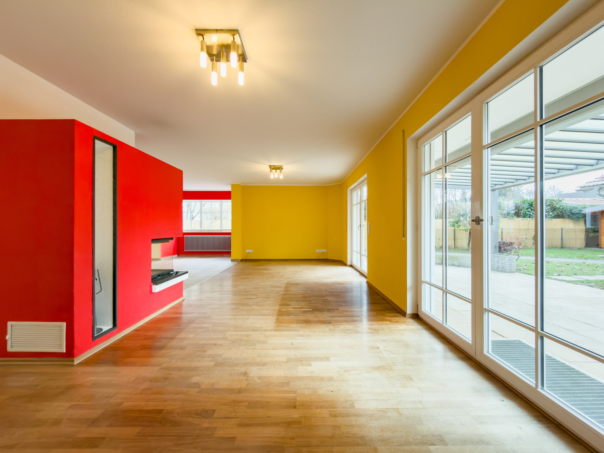 Das Herzstück ist der Eck-Kamin mit großem Sichtfenster. Wenn es draußen kalt ist, wird es hier drinnen sofort gemütlich – nicht künstlich, sondern echt. Und der Erker schafft genau den Platz, den man sonst oft vermisst: endlich Platz für einen Esstisch, an dem alle sitzen können, ohne dass man Tetris spielen muss. Von hier geht’s direkt hinaus auf die überdachte Süd-Terrasse. Mit der elektrisch gesteuerten Lamellenpergola wird daraus ein zweites Wohnzimmer – an sonnigen Tagen, bei Sommerregen, oder aber auch an den Abenden, die länger werden, als man geplant hatte.