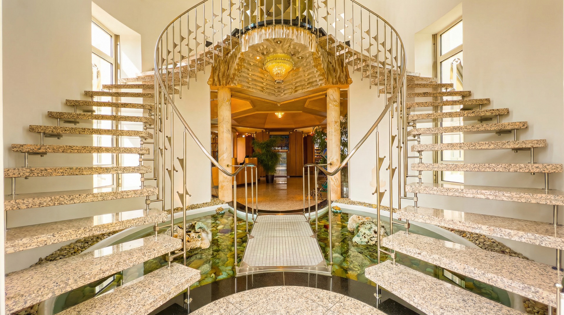 Im Erdgeschoß befinden sich die repräsentativen Büroflächen, in denen ausschließlich hochwertige handgeschreinerte Einbaumöbel aus verschiedenen Edelhölzern verbaut wurden. Der Eingangsbereich empfängt Sie mit einem Teich, über dem ein Steg gespannt ist. Ohne Zweifel beeindruckend für Ihre Gäste und Ihre Kunden.