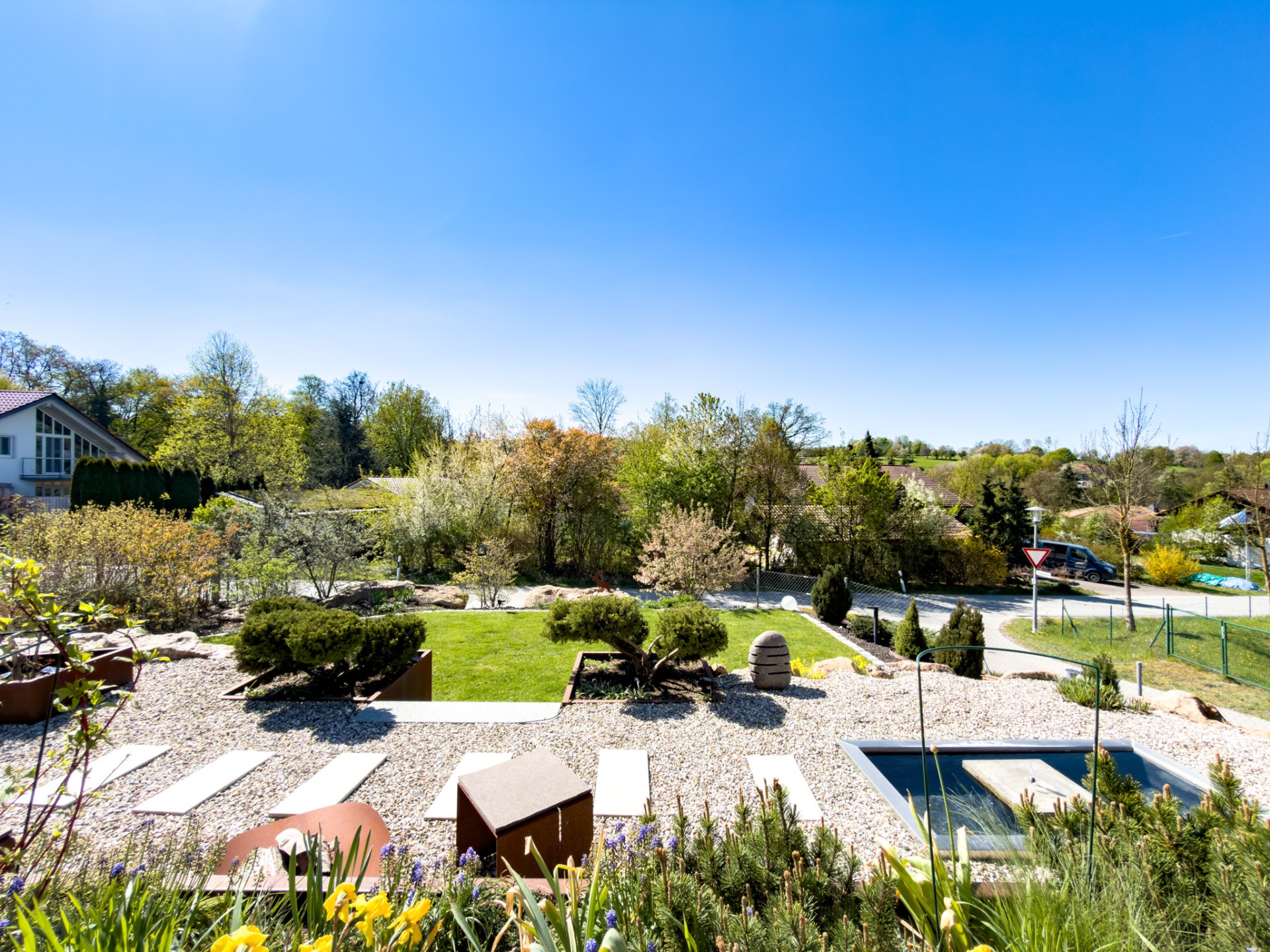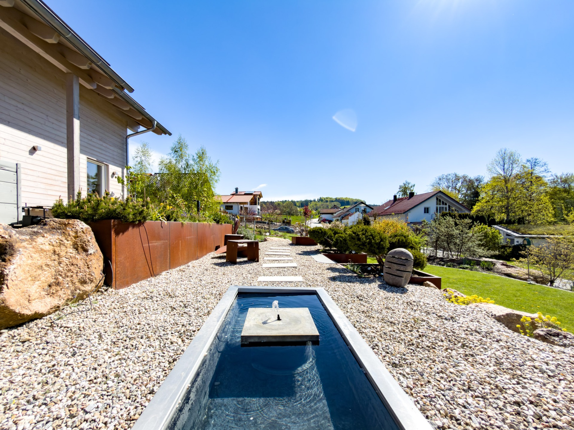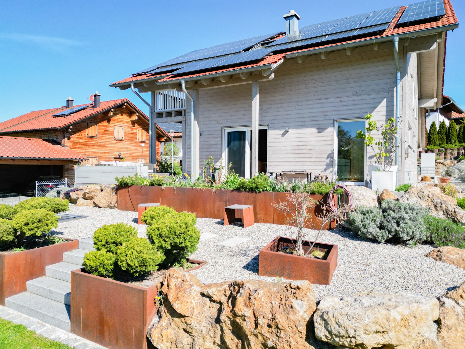 Der Außenbereich passt perfekt zur Architektur. Das 577 m² große Grundstück wurde hochwertig und pflegeleicht angelegt. Naturstein, Cortenstahl, Terrassierungen mit auf dem Grundstück gefundenen Felsen und eine mediterrane Bepflanzung schaffen einen Garten, der Charakter hat, ohne ständig Arbeit zu machen. Die ca. 30 m² große Süd-West-Terrasse wird schnell zum Lieblingsplatz – für den Kaffee am Nachmittag, das Glas Wein nach der Golfrunde oder den Sommerabend mit Familie und Freunden.