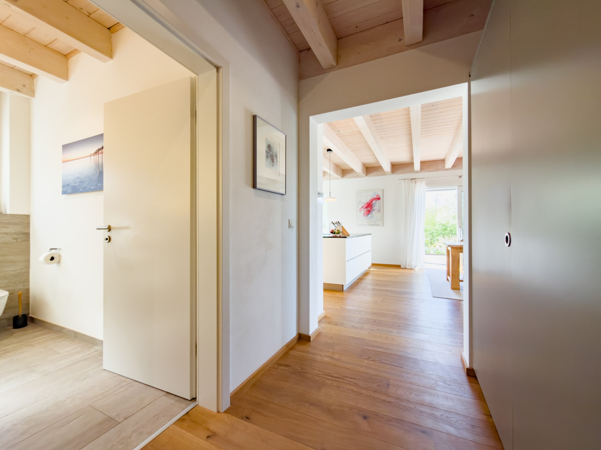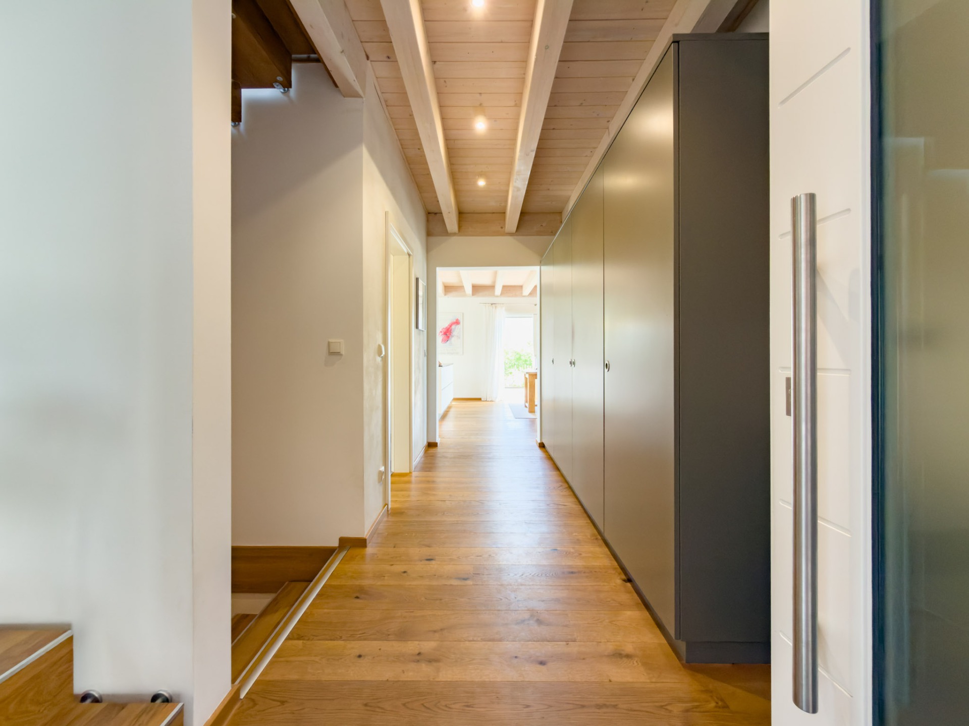 Hier wurde geplant, ausgewählt und mitgedacht. Die großzügige Diele mit geschreinertem Einbauschrank, die hochwertigen Eichendielen, die klare Architektur und die spürbare Wärme des Holzes geben dem Haus sofort Charakter. Es wirkt modern, aber nicht kühl. Hochwertig, aber nicht distanziert. Genau diese Mischung macht den besonderen Reiz aus.