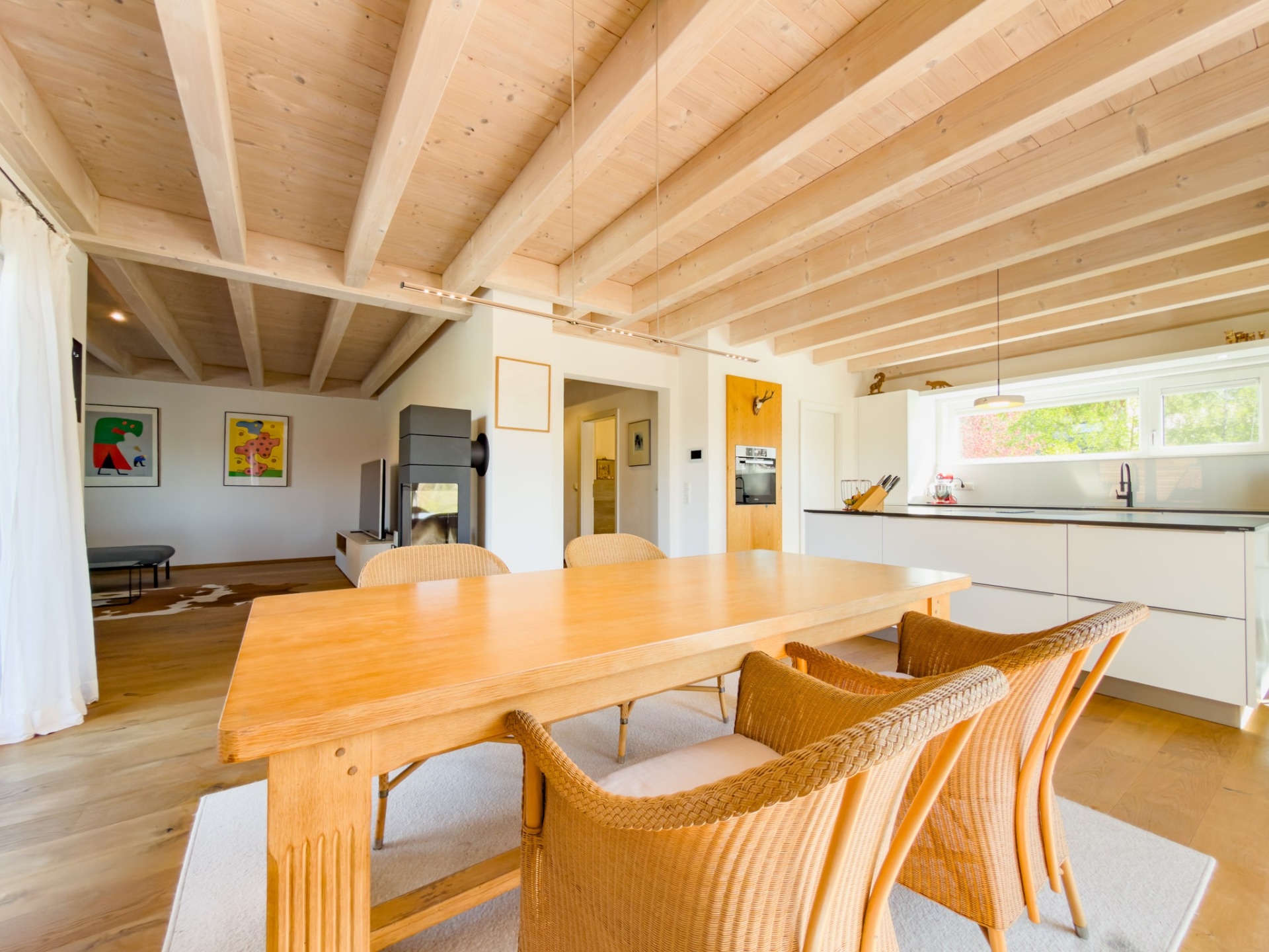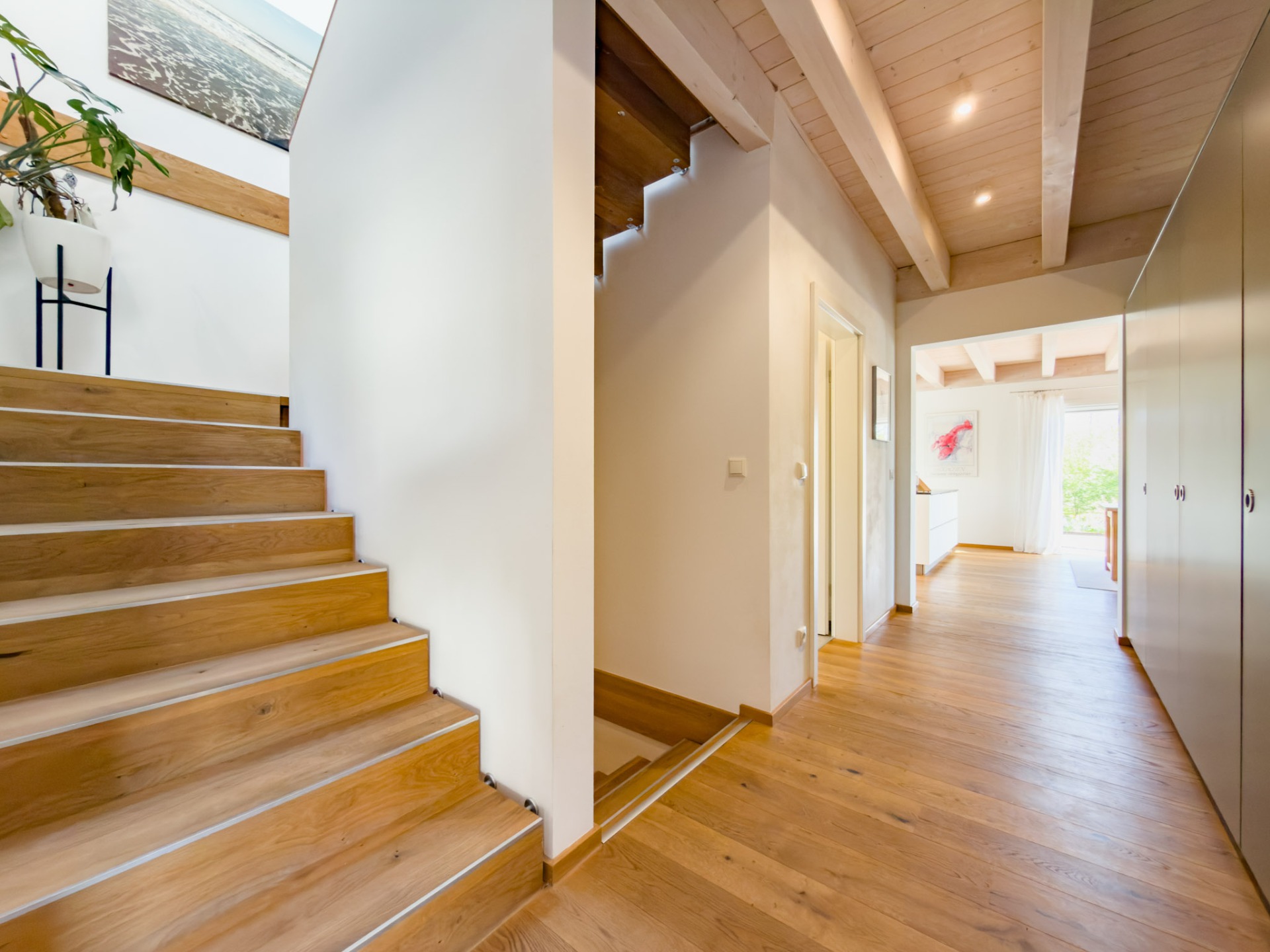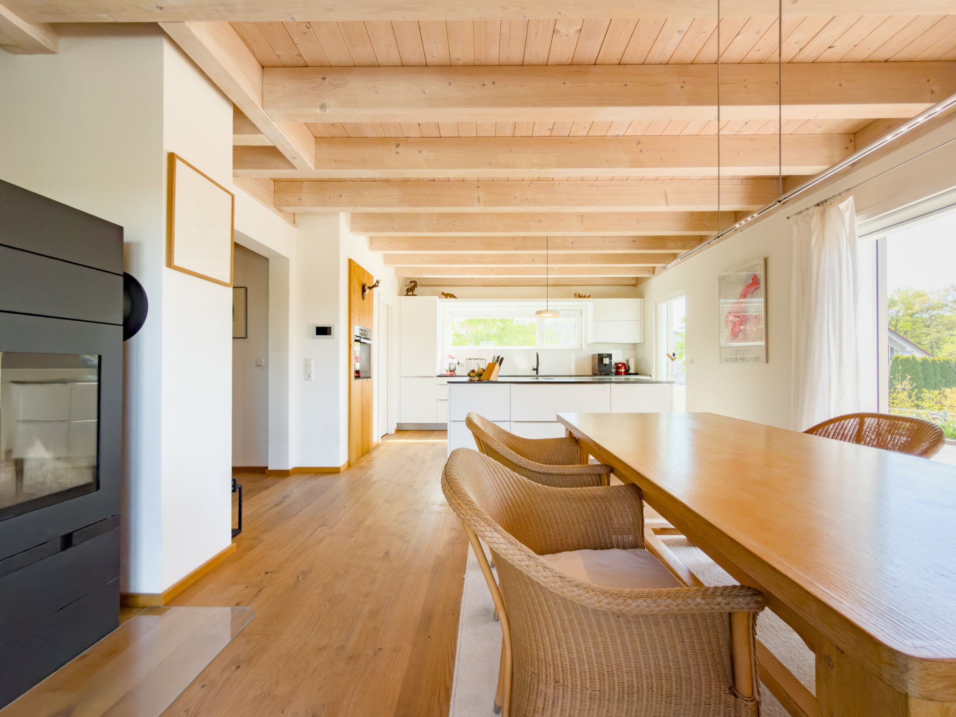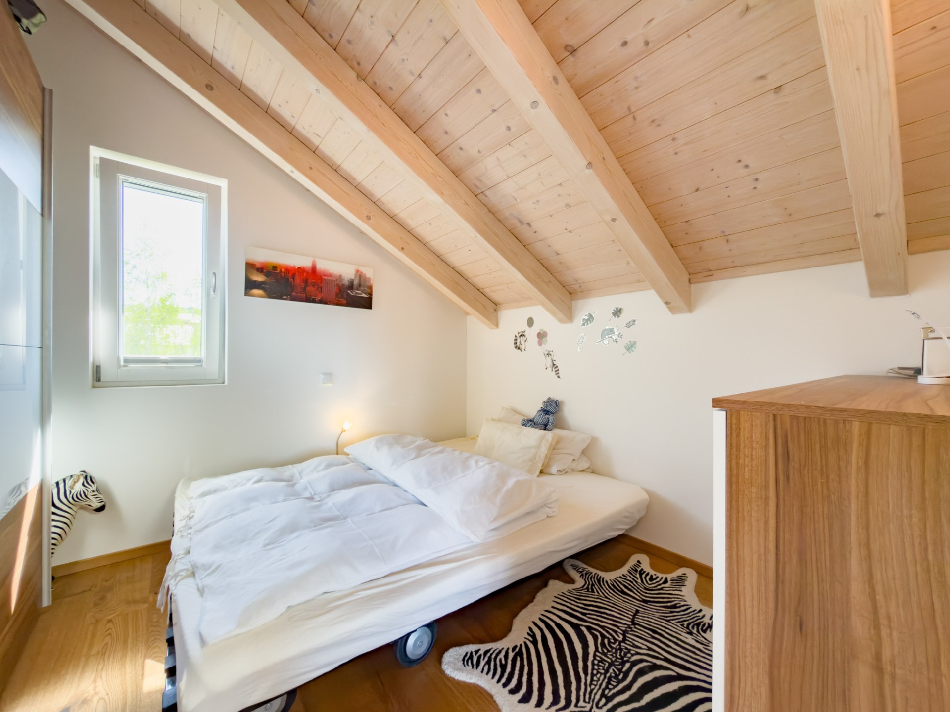 Gleichzeitig ist dieses Haus ein wunderbarer Ort für Familien, die Wert auf Qualität, Platz und ein gesundes Wohnumfeld legen. Die ökologische Holzbauweise schafft ein angenehmes Raumklima, die ca. 181 m² Wohnfläche bieten genügend Möglichkeiten für Familie, Gäste, Homeoffice oder Hobbys. Mit bis zu vier Schlafräumen, mehreren Wohnbereichen und einem flexibel nutzbaren Untergeschoss passt sich das Haus verschiedenen Lebensphasen an – heute Familie, morgen mehr Rückzug, später vielleicht Gäste- oder Arbeitsbereich.