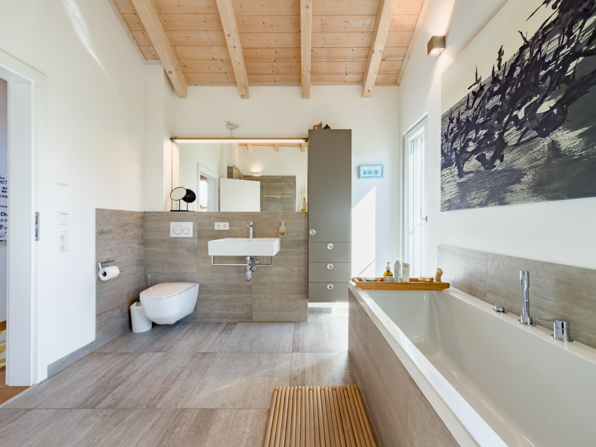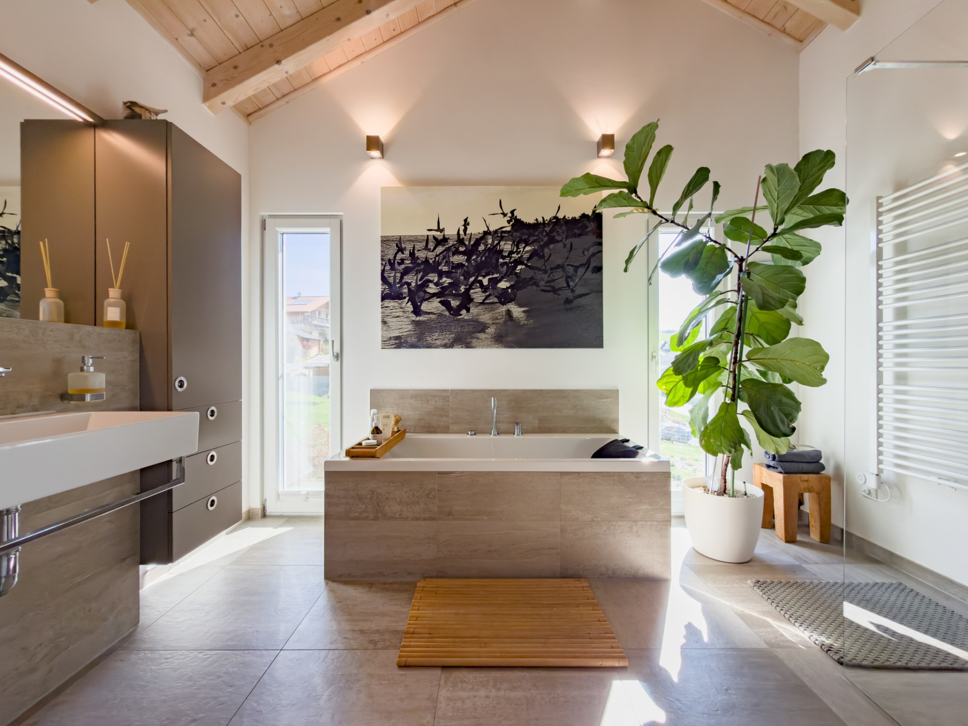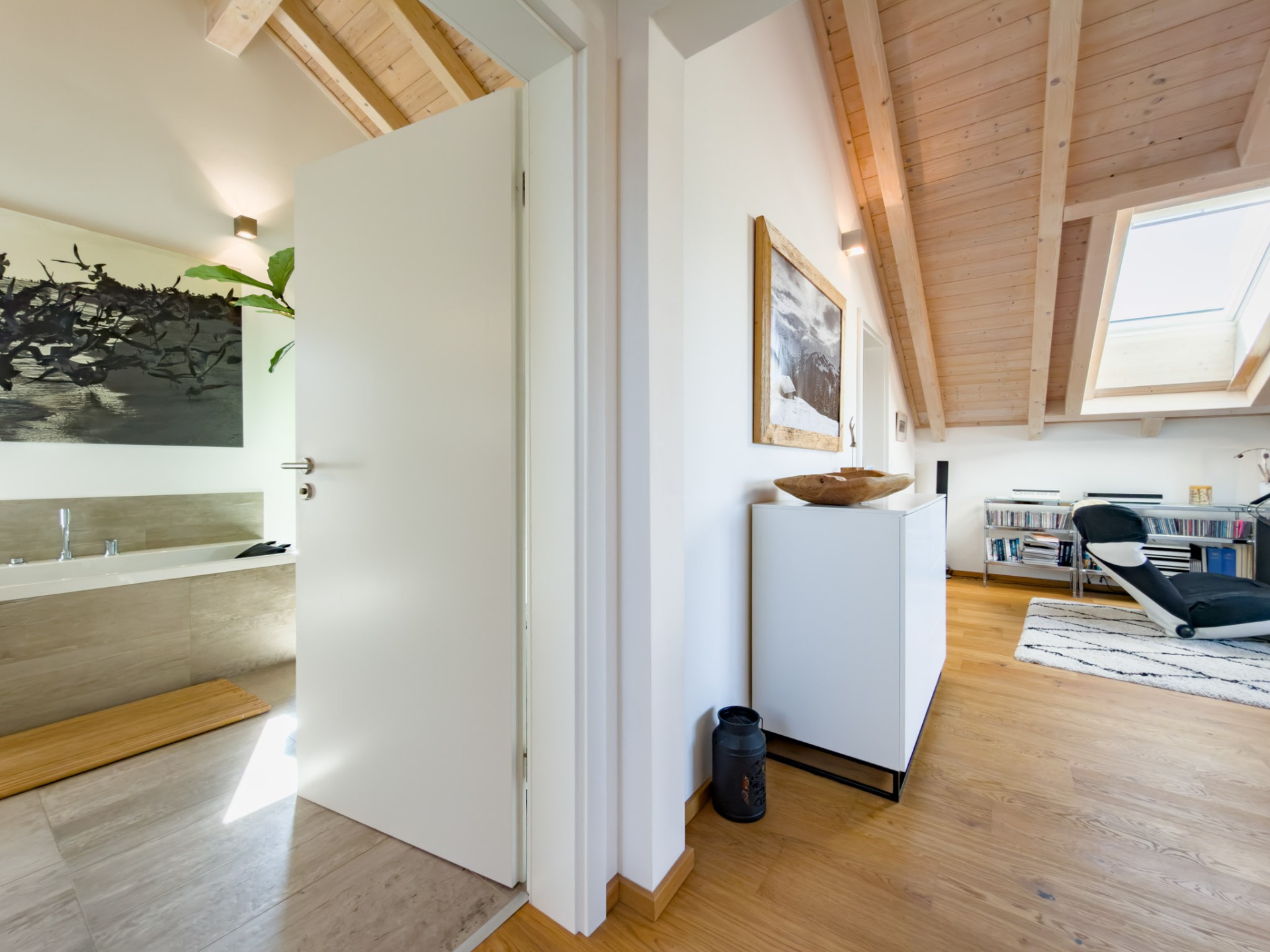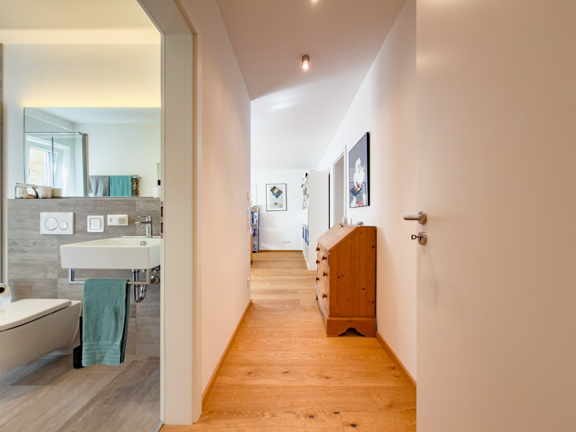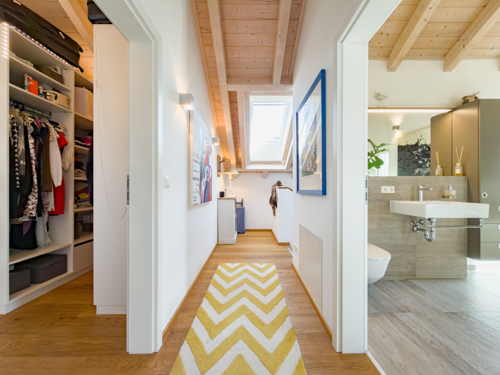 Das Obergeschoss hat durch den sichtbaren Dachstuhl und die Raumhöhe von über vier Metern eine ganz eigene Wirkung. Es fühlt sich offen, hell und besonders an. Das Schlafzimmer verfügt über einen separaten Ankleidebereich und Zugang zum überdachten Balkon. Auch das weitere Schlafzimmer bietet eine eigene Ankleidemöglichkeit, die bei Bedarf auch als kleiner Kinder-Schlafraum genutzt werden kann. Das hochwertige Tageslichtbad mit großem Waschtisch, Badewanne, Walk-in-Dusche und Einbaumöbeln passt perfekt zum Anspruch des Hauses: schön, praktisch und wertig.