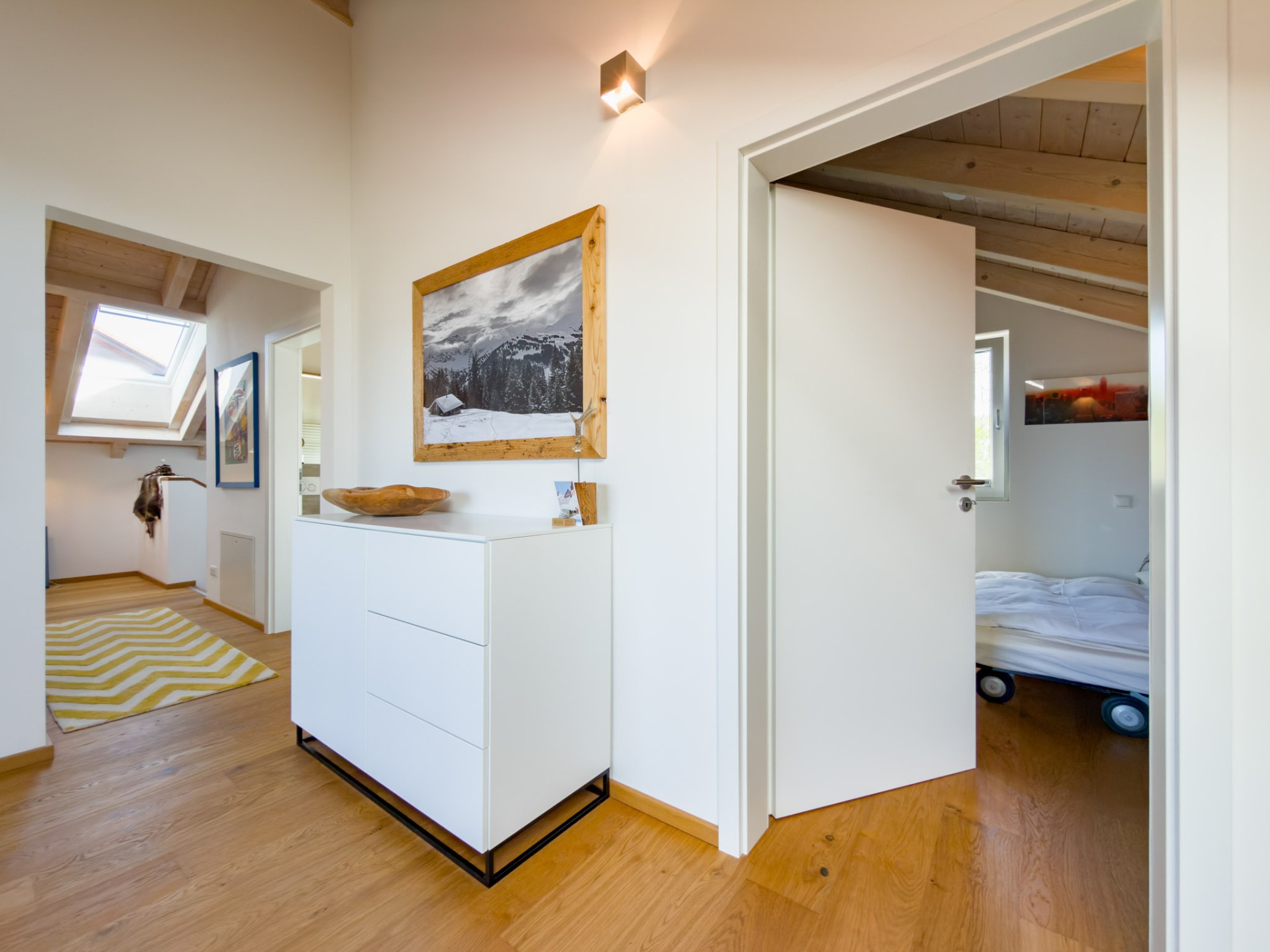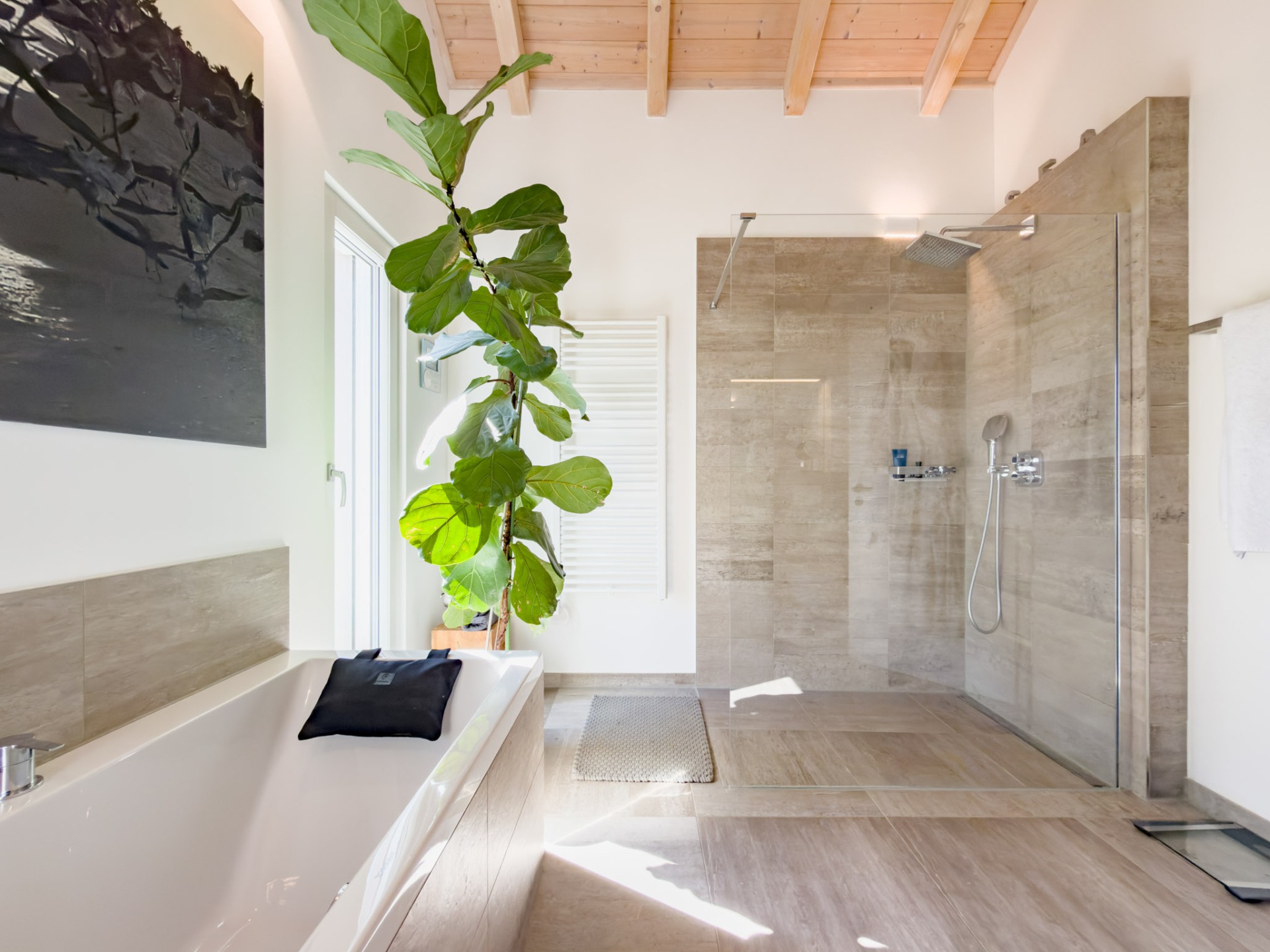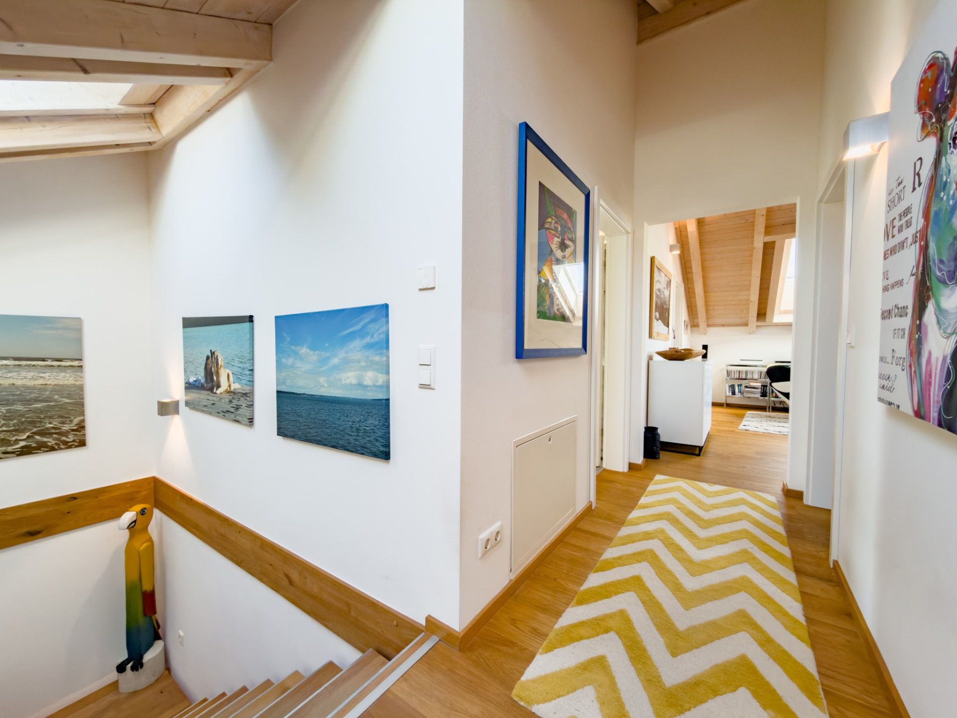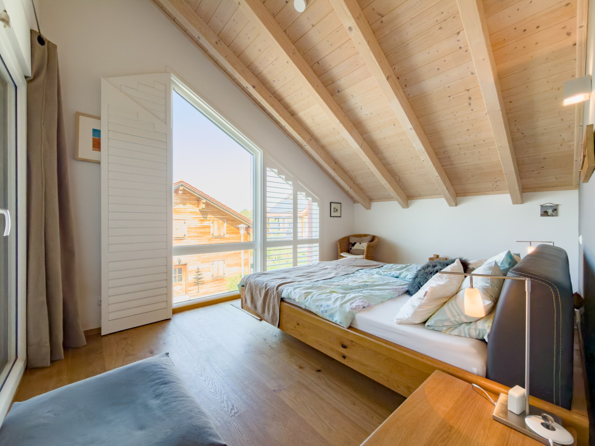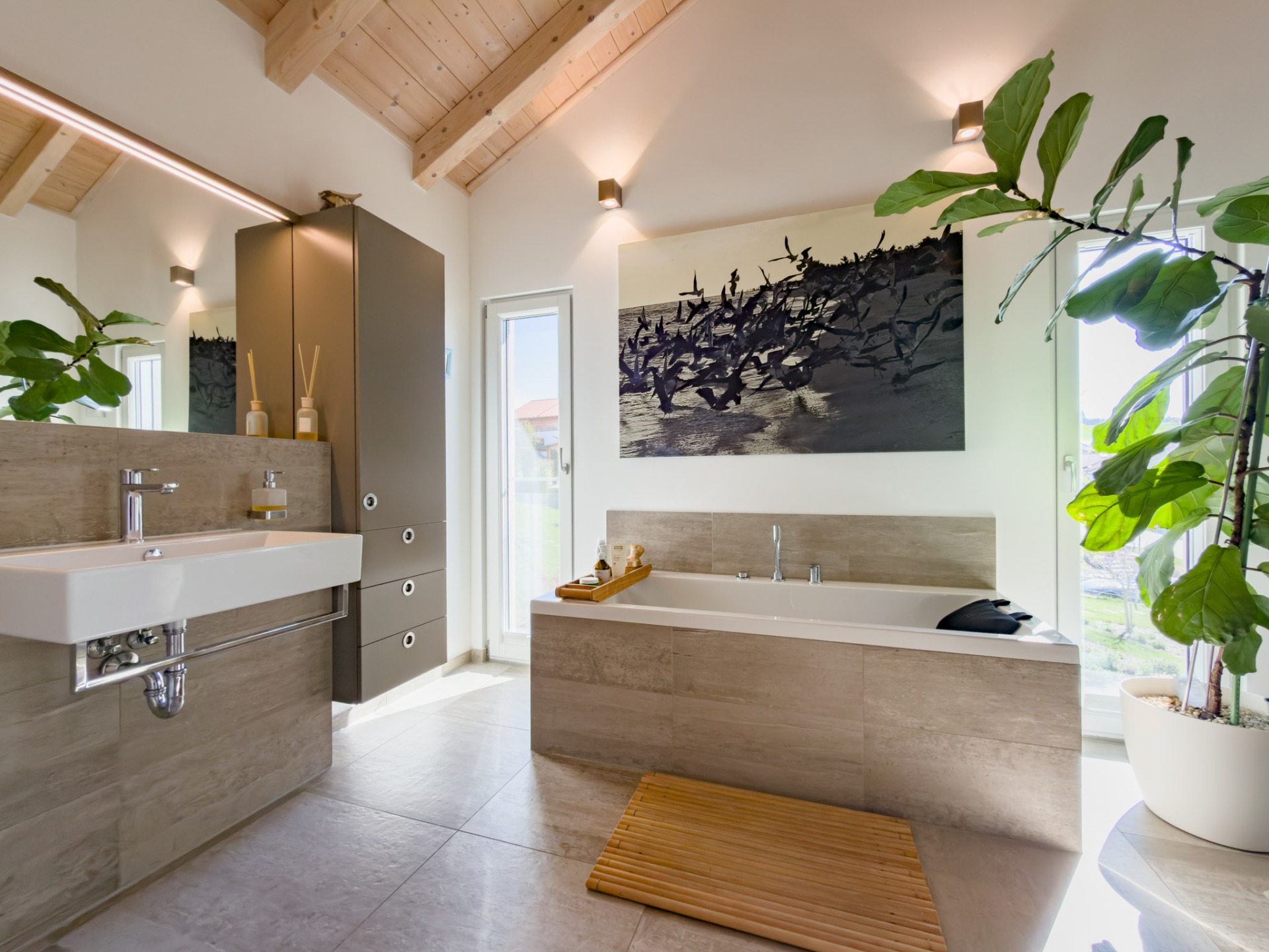 Das Obergeschoss hat durch den sichtbaren Dachstuhl und die Raumhöhe von über vier Metern eine ganz eigene Wirkung. Es fühlt sich offen, hell und besonders an. Das Schlafzimmer verfügt über einen separaten Ankleidebereich und Zugang zum überdachten Balkon. Auch das weitere Schlafzimmer bietet eine eigene Ankleidemöglichkeit, die bei Bedarf auch als kleiner Kinder-Schlafraum genutzt werden kann. Das hochwertige Tageslichtbad mit großem Waschtisch, Badewanne, Walk-in-Dusche und Einbaumöbeln passt perfekt zum Anspruch des Hauses: schön, praktisch und wertig.