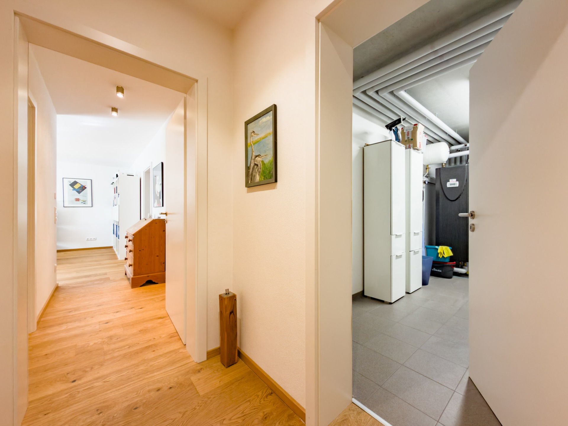 Das Untergeschoss erweitert die Nutzungsmöglichkeiten deutlich. Der Einliegerbereich mit Tageslichtbad, Dusche und WC, Wohnraum mit Küchenanschlüssen sowie separatem Schlafzimmer eignet sich ideal für größere Kinder, Gäste, Homeoffice, Hobby oder einen privaten Rückzugsbereich. Sogar die Vorbereitung für eine Sauna ist durch den Starkstromanschluss bereits vorhanden. Dazu kommen Technikraum und Abstellflächen – durchdacht bis ins Detail.