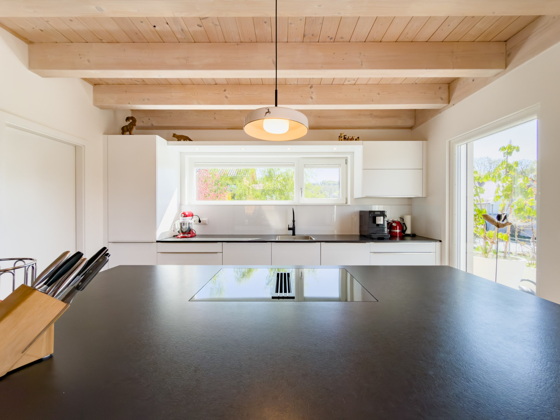 Der offene Wohn- und Essbereich ist der Mittelpunkt des Hauses. Große Fensterflächen holen Licht und Garten ins Haus, die hochwertige Küche mit Kochinsel und Miele-Geräten fügt sich perfekt in das hochwertige Gesamtbild ein. Direkt daneben liegt die praktische Speisekammer – ein kleines Detail, das man im Alltag schnell nicht mehr missen möchte. Der Holzofen von skantherm mit großem Wärmespeicher und Eck-Sichtfenster sorgt zusätzlich für Atmosphäre. Ankommen, Feuer anzünden, runterfahren. Dieses Haus macht es einem leicht.