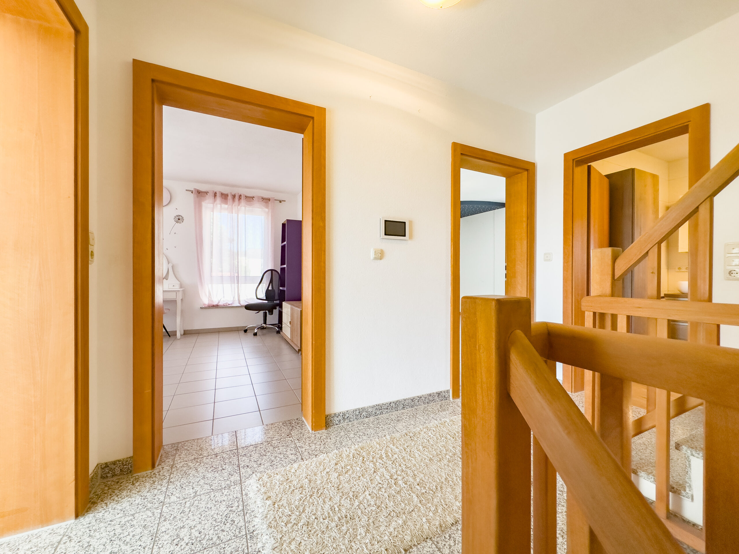 Das Obergeschoss bietet drei helle Schlafzimmer, die ganz auf die Bedürfnisse einer Familie zugeschnitten sind. Ob Elternschlafzimmer, Kinderzimmer mit Blick ins Grüne oder ein Raum mit integriertem Sternenhimmel – hier hat jeder seinen persönlichen Rückzugsort. Das sanierte Tageslichtbad überzeugt mit großer Regendusche, Doppelwaschtisch und maßgefertigten Einbauten, die cleveren Stauraum schaffen.