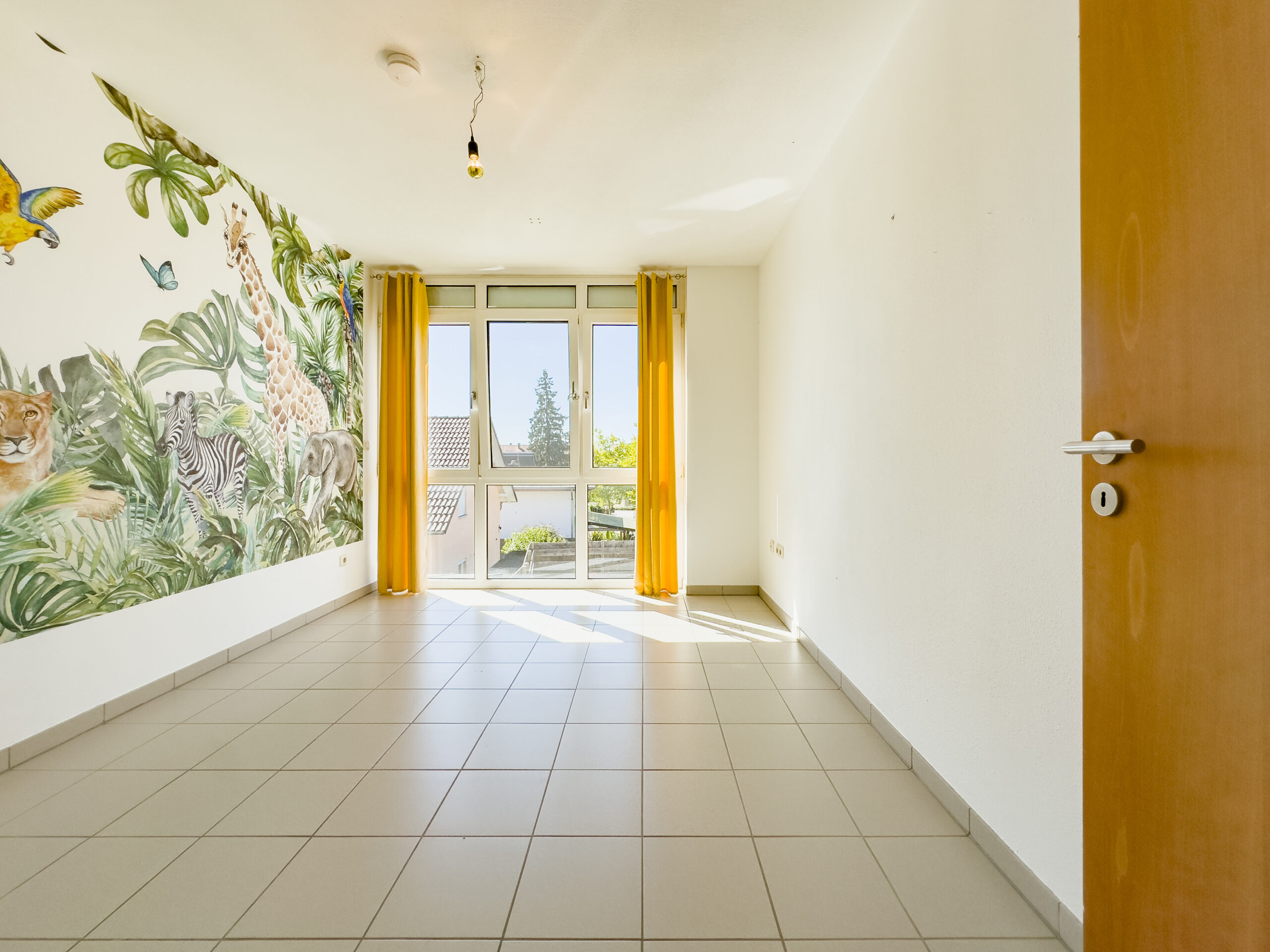 – Kinderzimmer Nr. 1 mit einer großen Fensterfront mit Blick in den Garten
