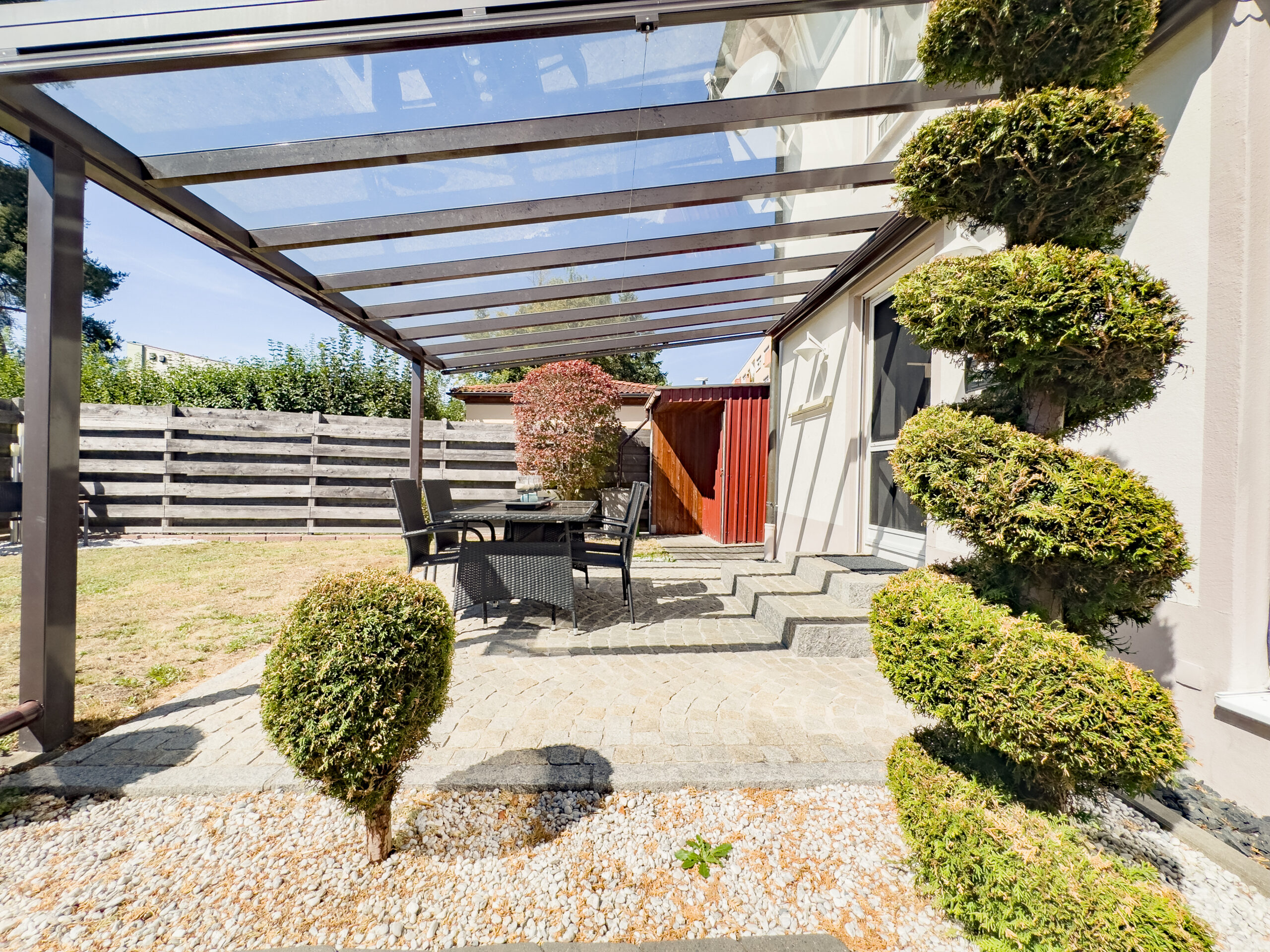 Auf dem 349 m² großen Grundstück erwarten dich nicht nur ein pflegeleichter Garten und die Terrasse, sondern auch praktische Details wie ein Gerätehaus, ein Mülltonnenhäuschen und zwei Stellplätze direkt vor der Tür.