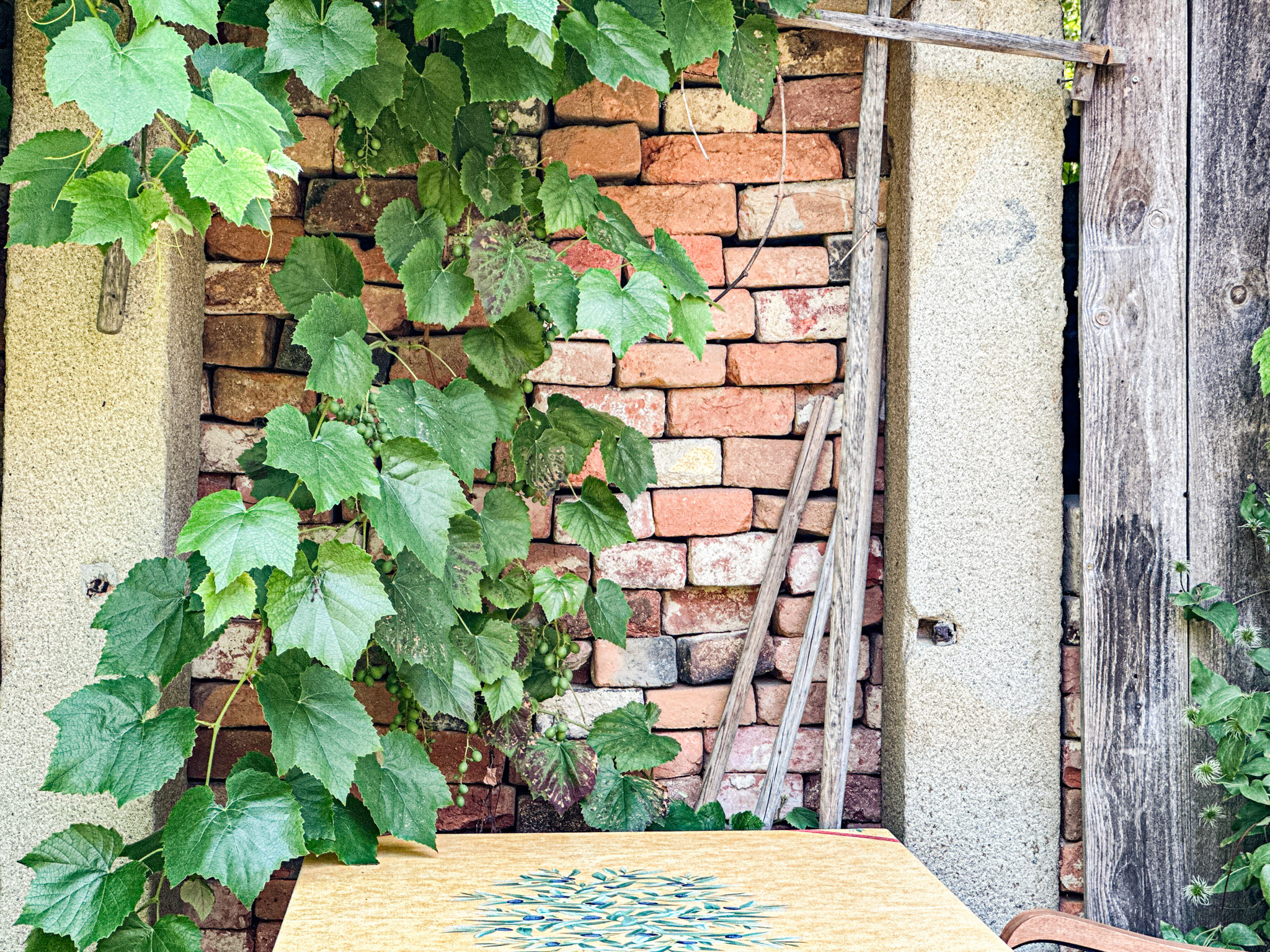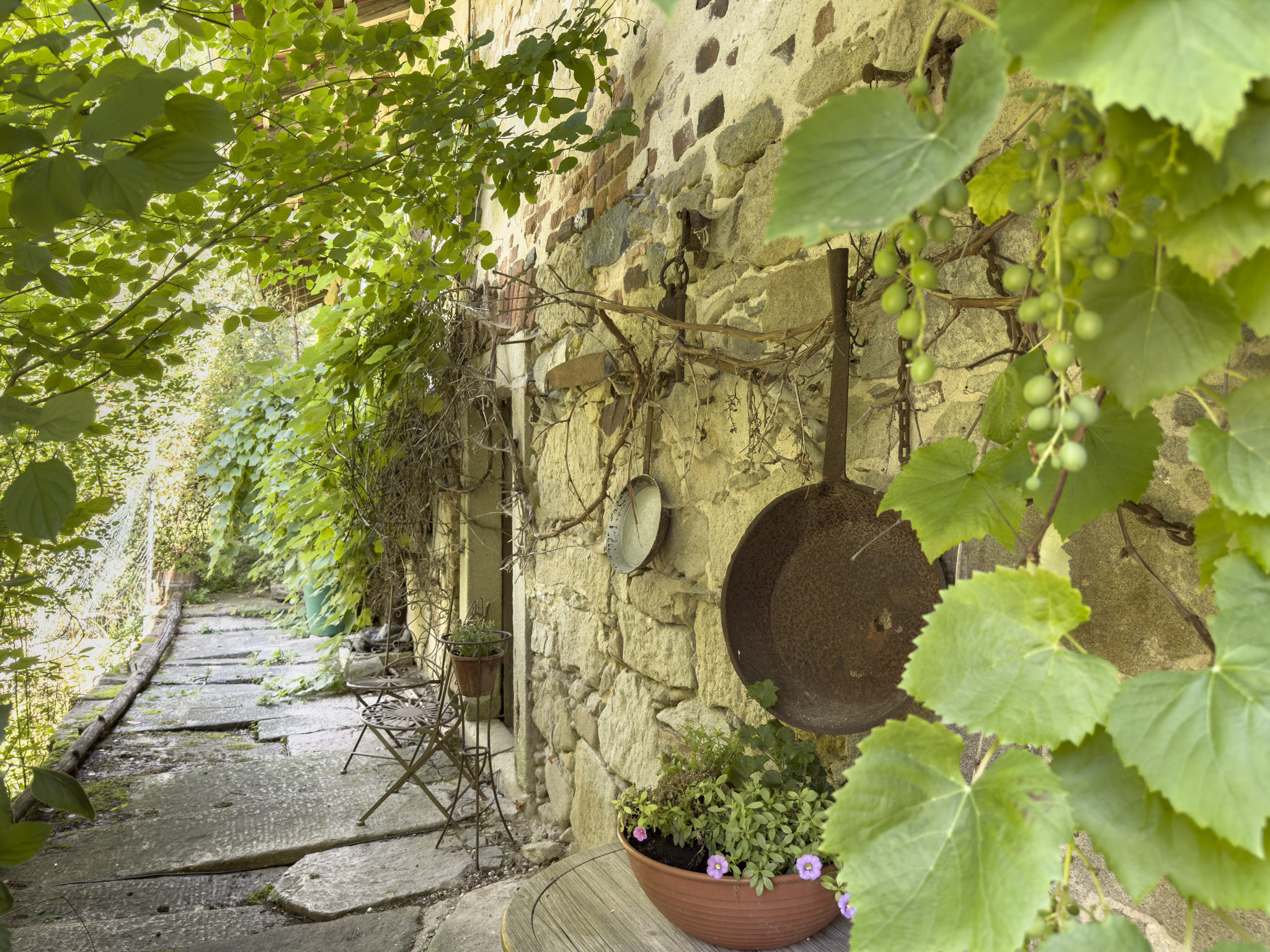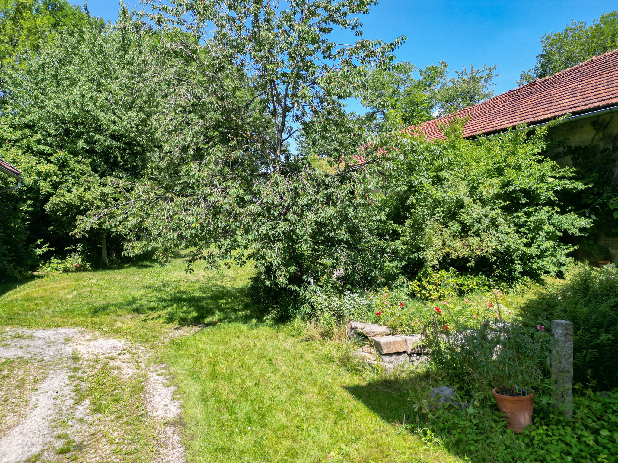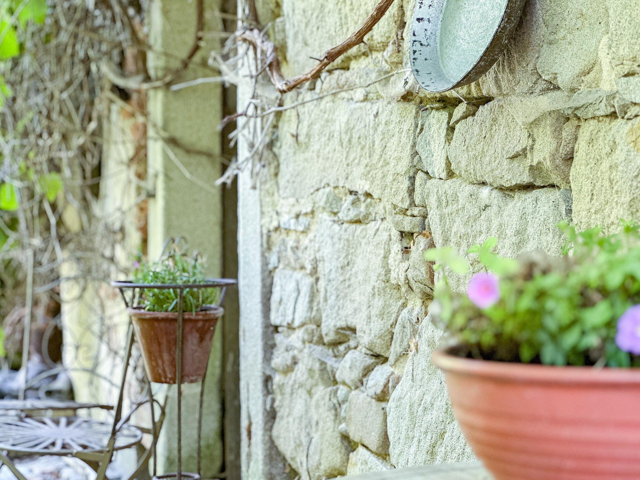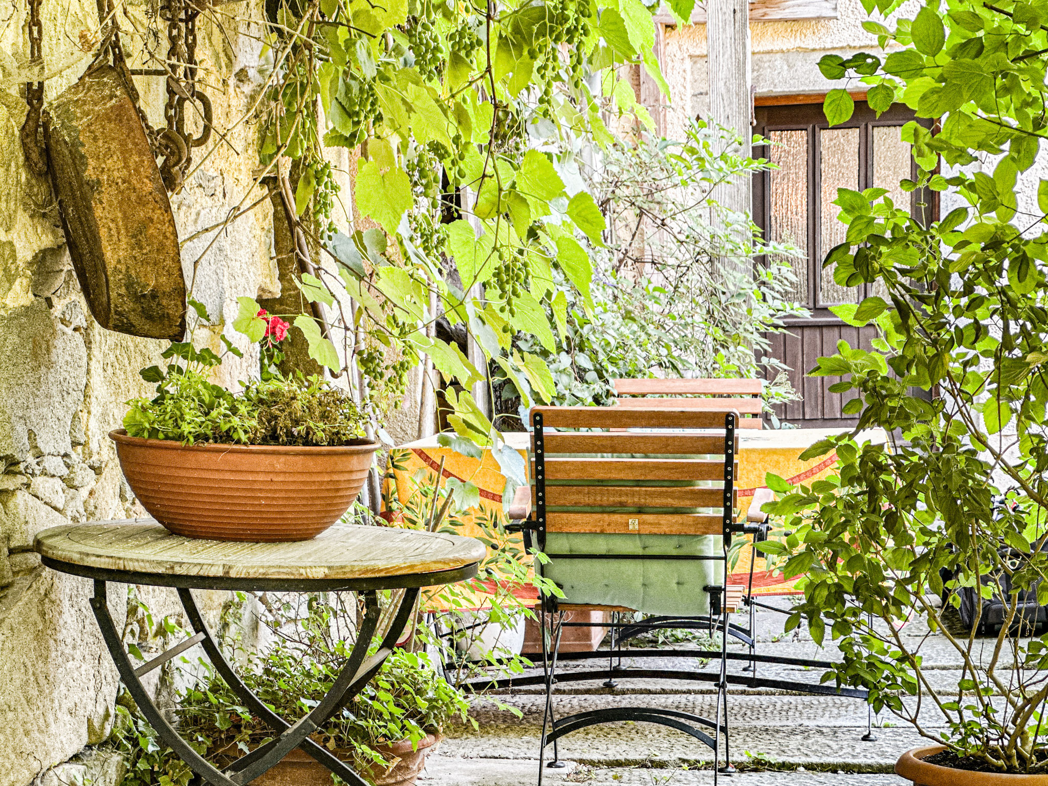 Der abgeschlossene Innenhof ist ein Ort der Ruhe: umgeben von Obstbäumen, Sträuchern und Natursteinmauern lädt er zum Verweilen ein. Eine große Granit-Zisterne wird mit Quellwasser gespeist, das über ein raffiniertes System bis in den Gemeindeweiher geleitet wird – ein Stück Idylle, wie man sie kaum noch findet.