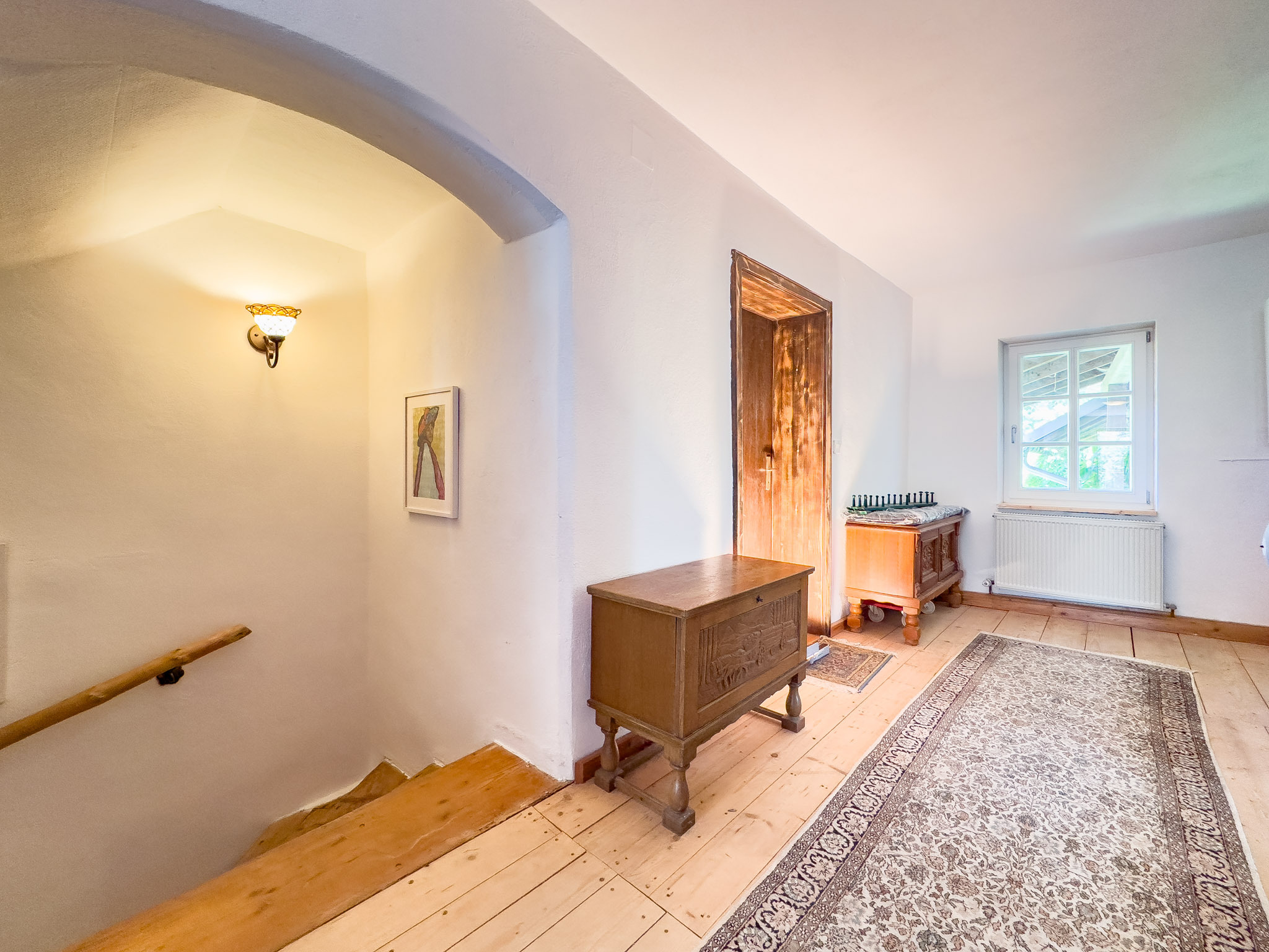 Im Obergeschoss sorgen alte Holzdielen, charaktervolle Rückzugsräume und ein Gästezimmer mit eigenem Bad für Wohnqualität auf höchstem Niveau. Die Kaminwärme wird über einen Wärmeschacht sogar bis nach oben geleitet. Der 190 m² große Dachboden bietet zusätzliches Potenzial für weiteren Ausbau.