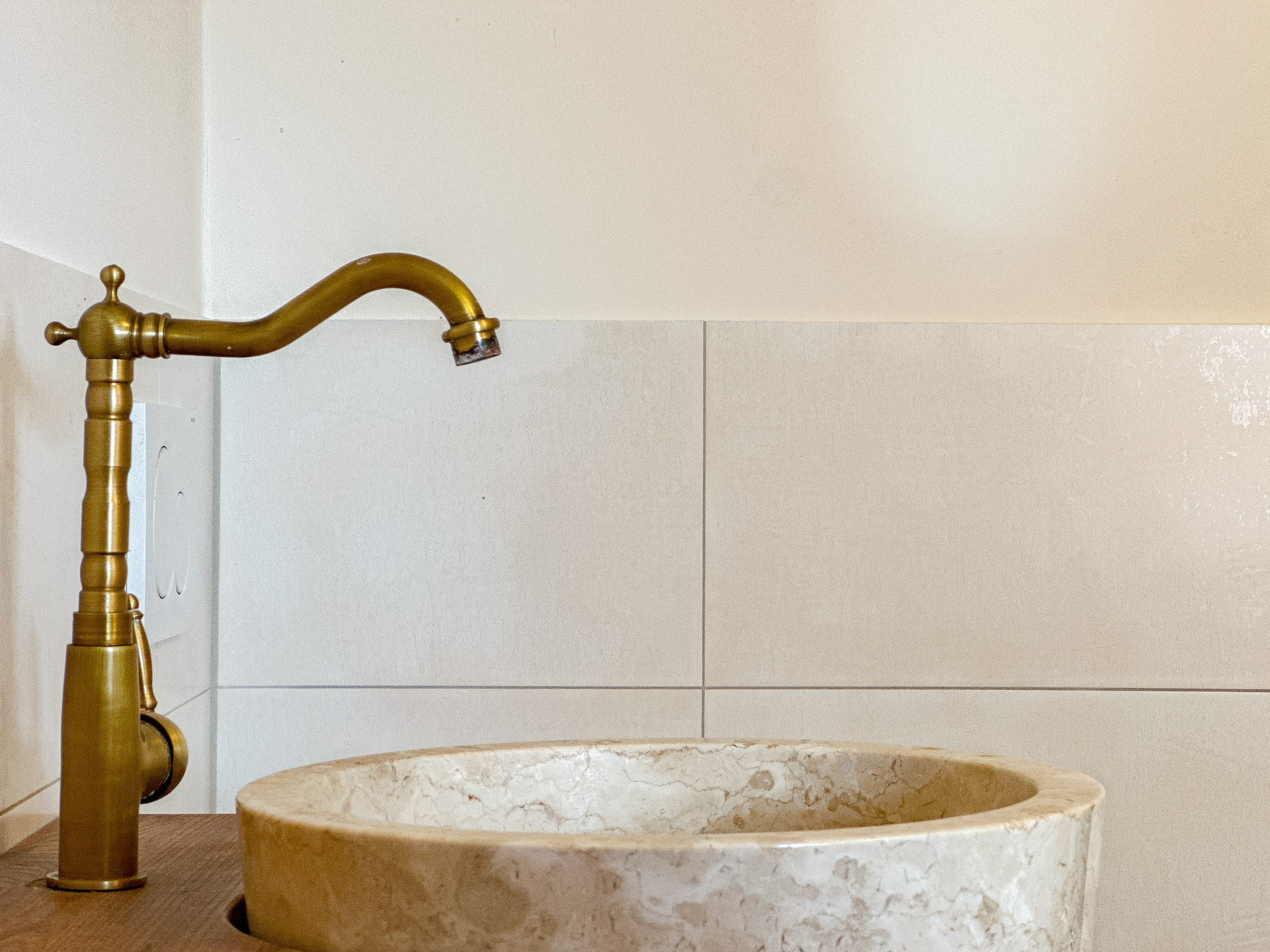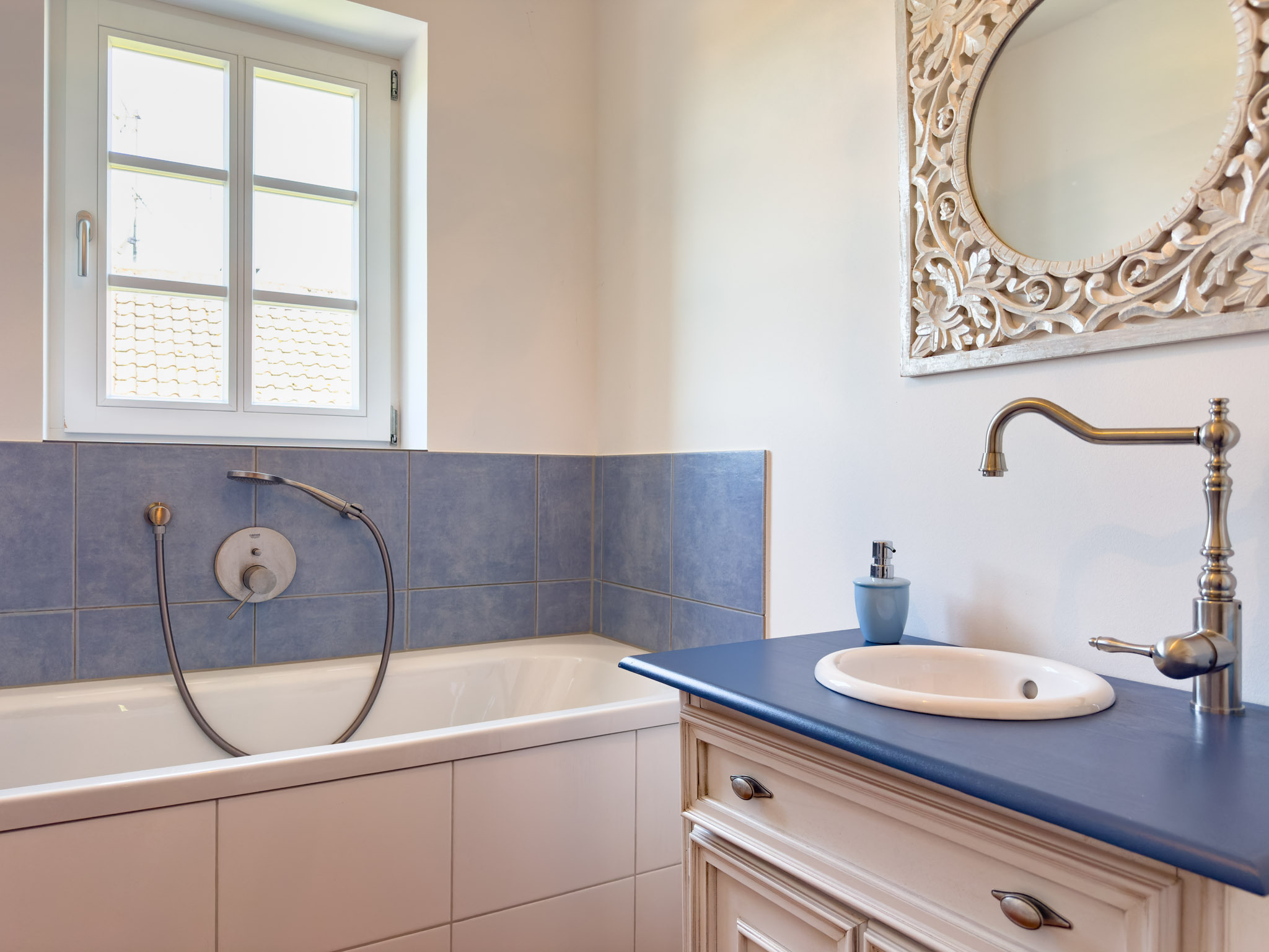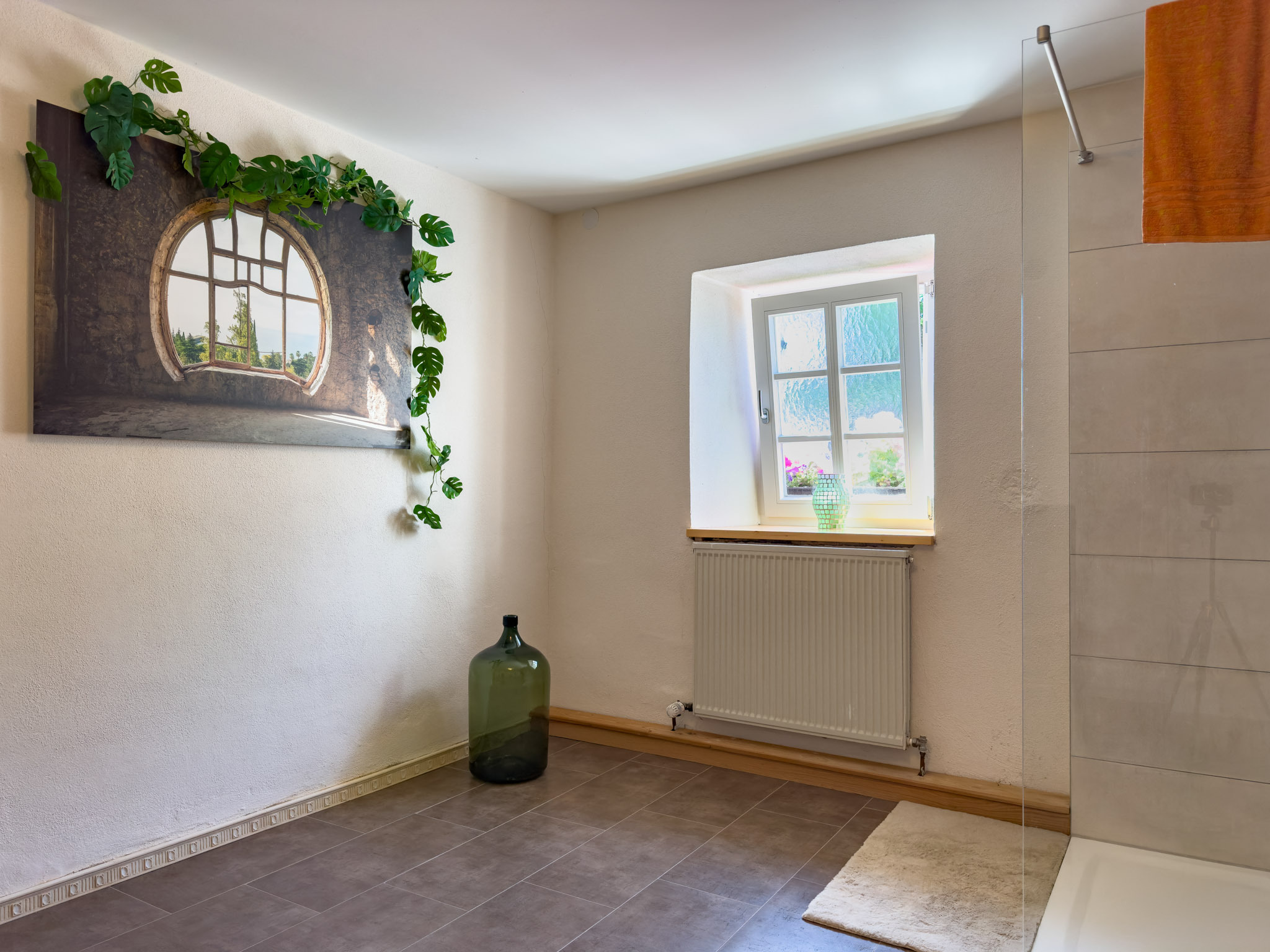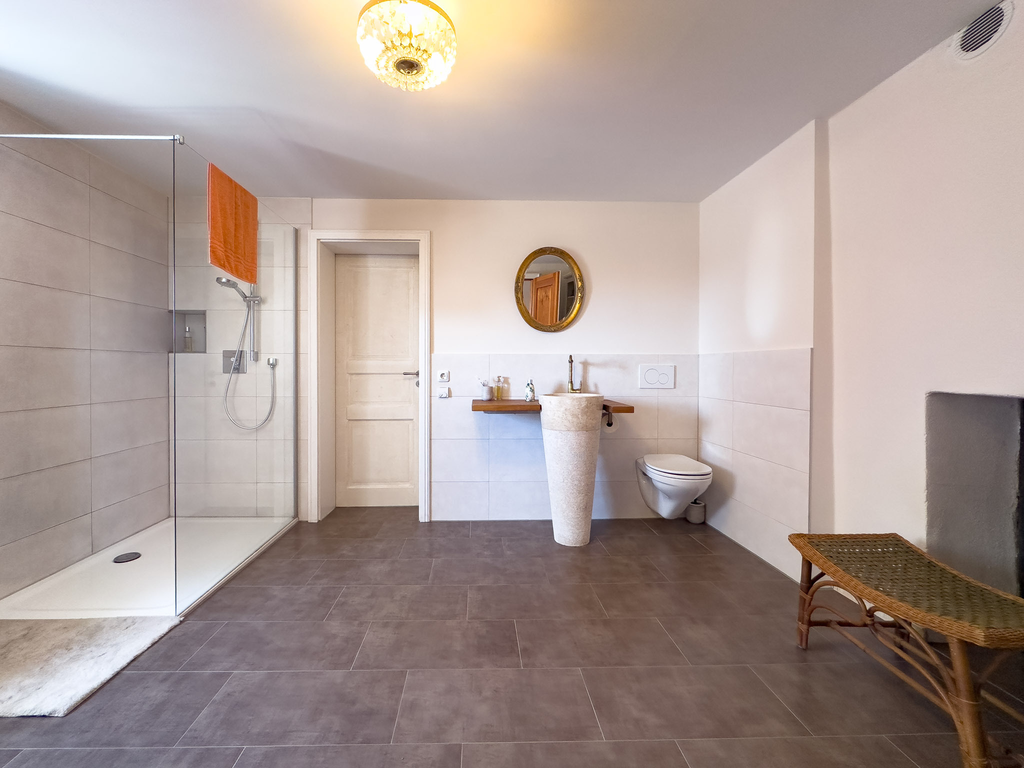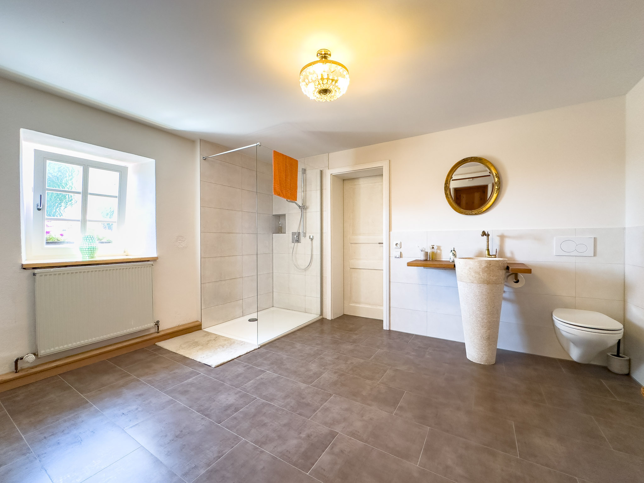 – kernsaniertes, sehr großzügiges Tageslichtbad mit bodengleicher Dusche, einem stilvollen Marmor Säulenwaschbecken, WC und Fußbodenheizung. Im Bad könnte auch der Kachelofen befeuert werden – dieser benötigt allerdings einen neuen Kamin.