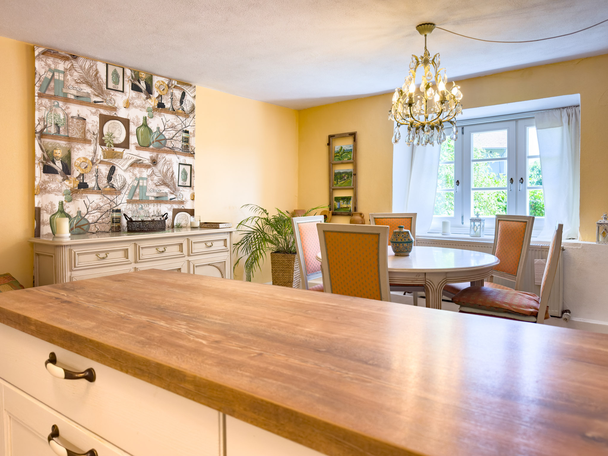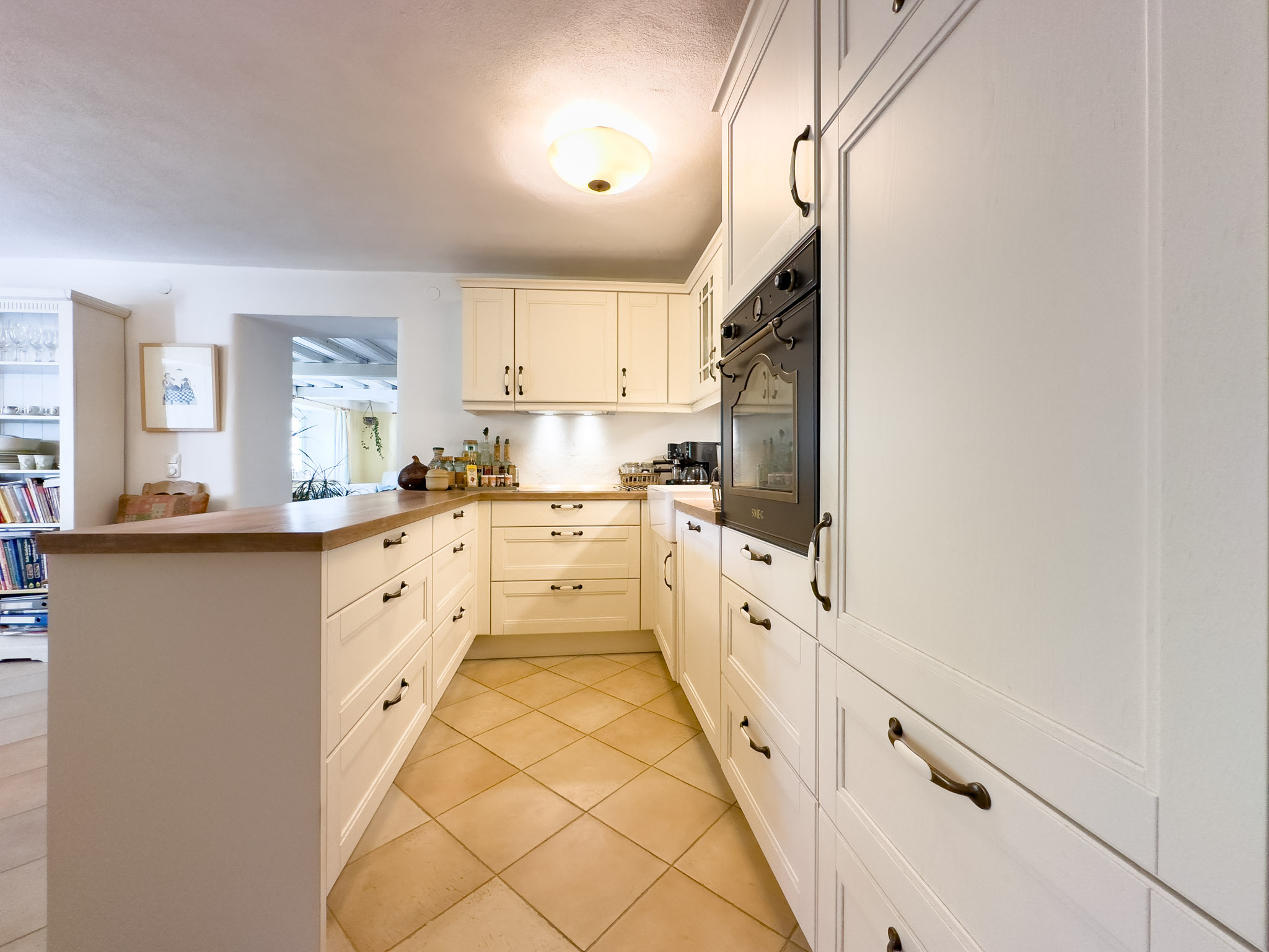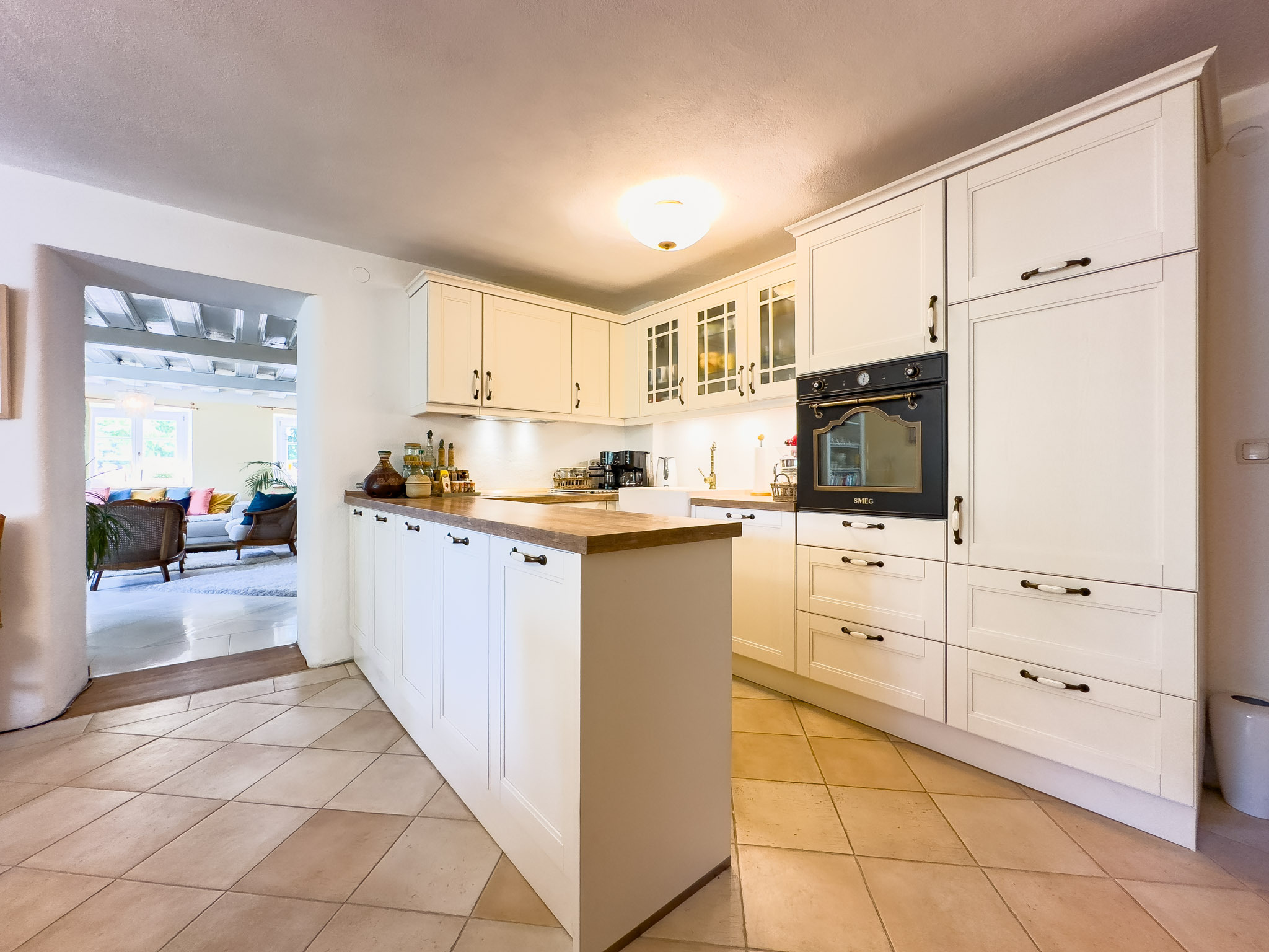 Die hochwertige Echtholz-Landhausküche mit SMEG-Backofen und italienischen Fliesen, das großzügige Wohnzimmer mit Kamin und weiß lasierter Holzbalkendecke, die alten Türen, Dielen und Treppen – jedes Detail erzählt von der Sorgfalt, mit der hier saniert wurde.
