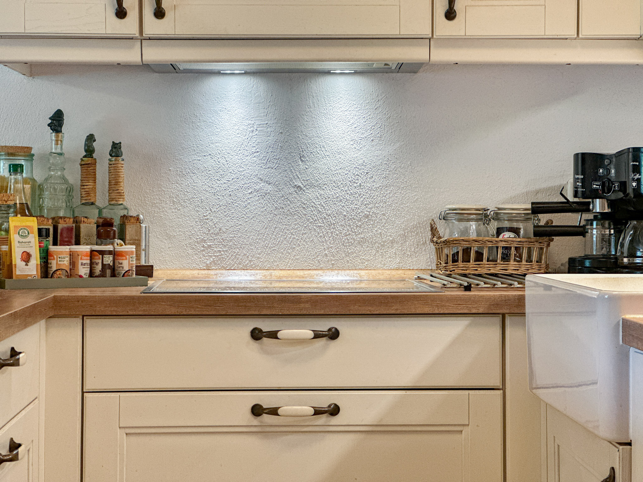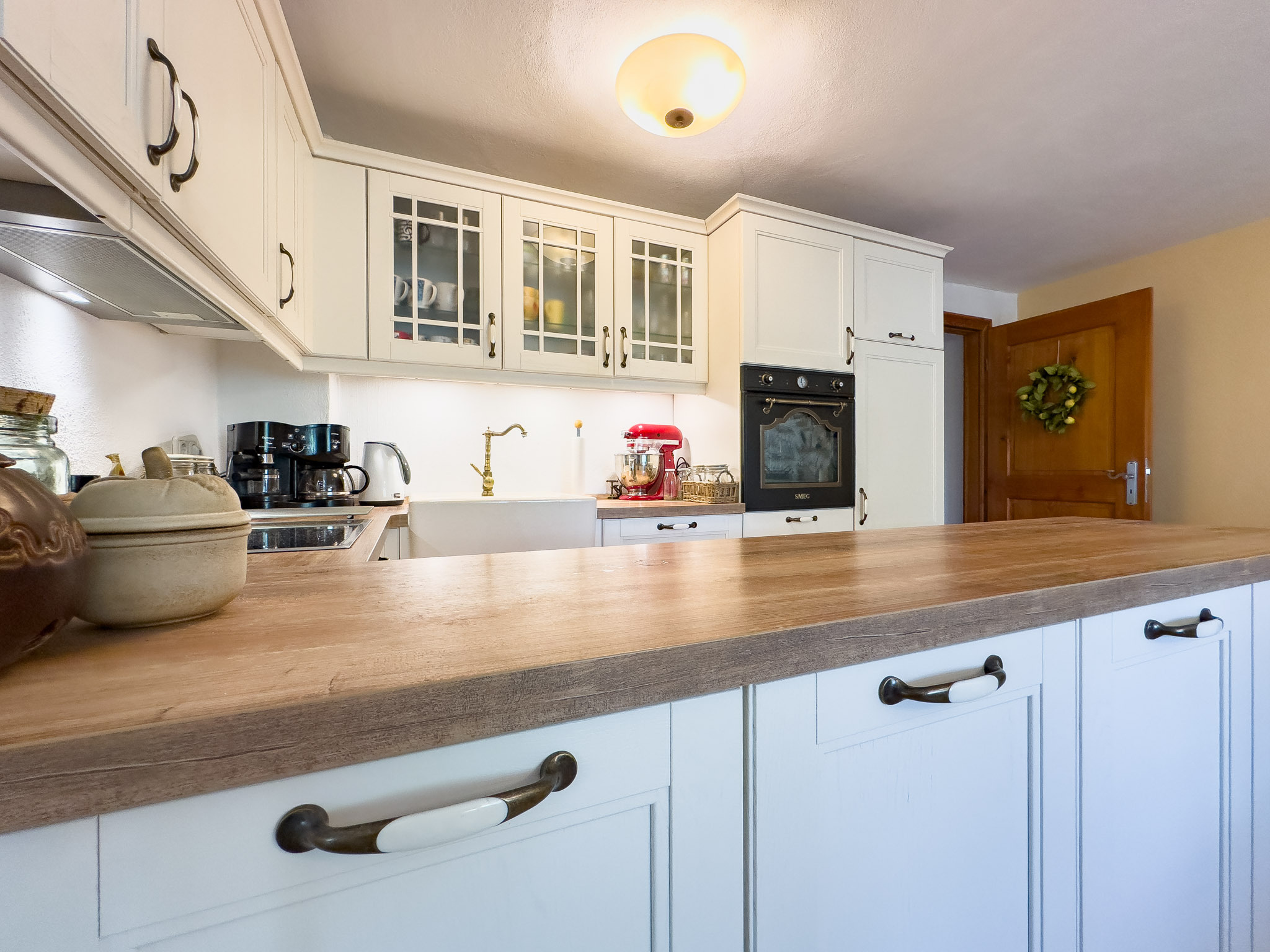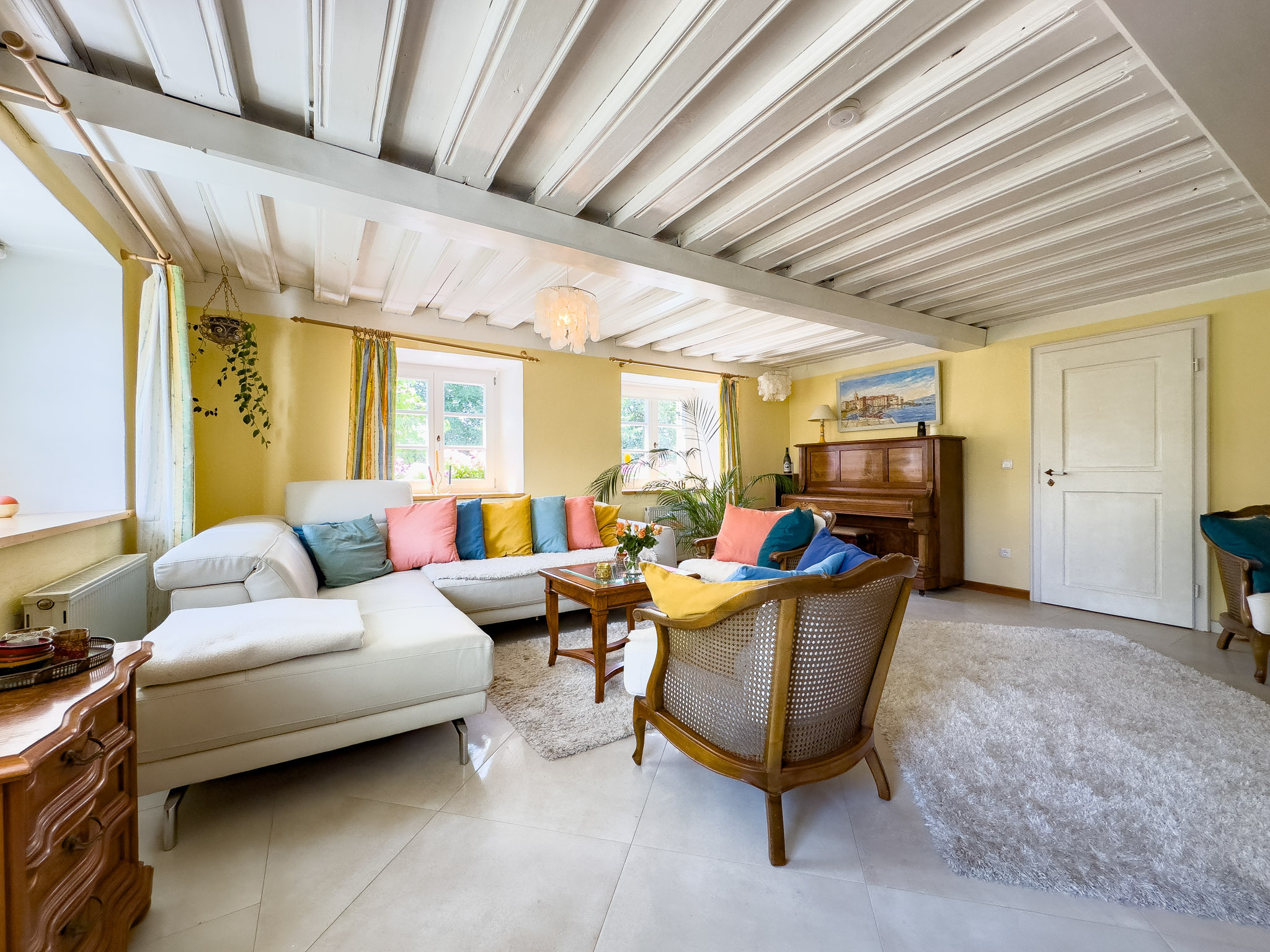 Die hochwertige Echtholz-Landhausküche mit SMEG-Backofen und italienischen Fliesen, das großzügige Wohnzimmer mit Kamin und weiß lasierter Holzbalkendecke, die alten Türen, Dielen und Treppen – jedes Detail erzählt von der Sorgfalt, mit der hier saniert wurde.