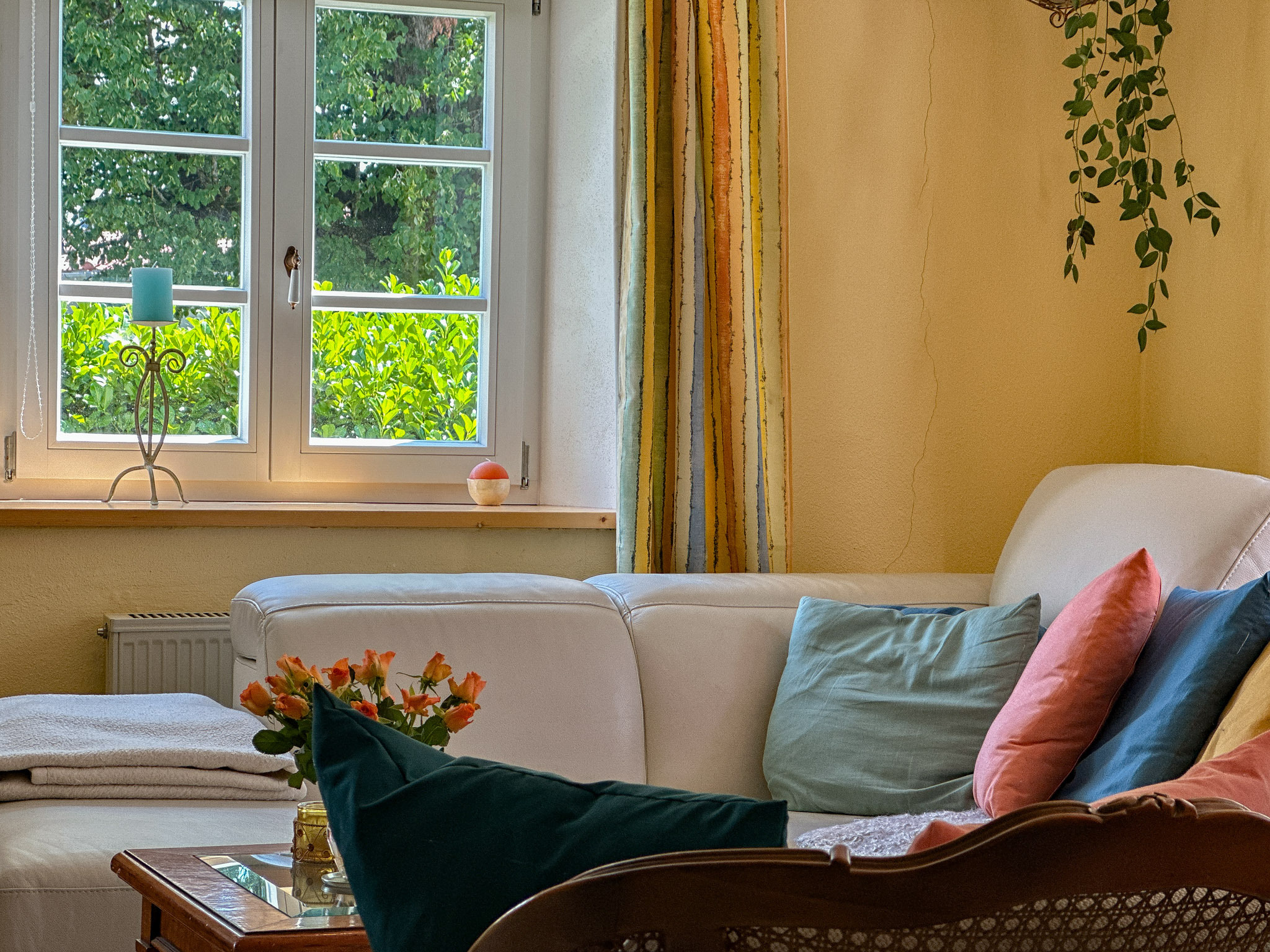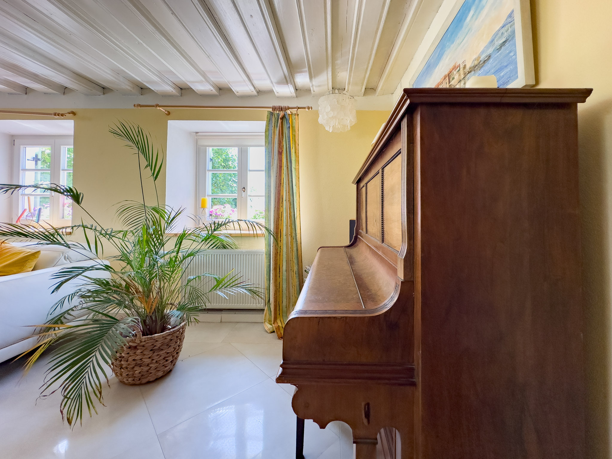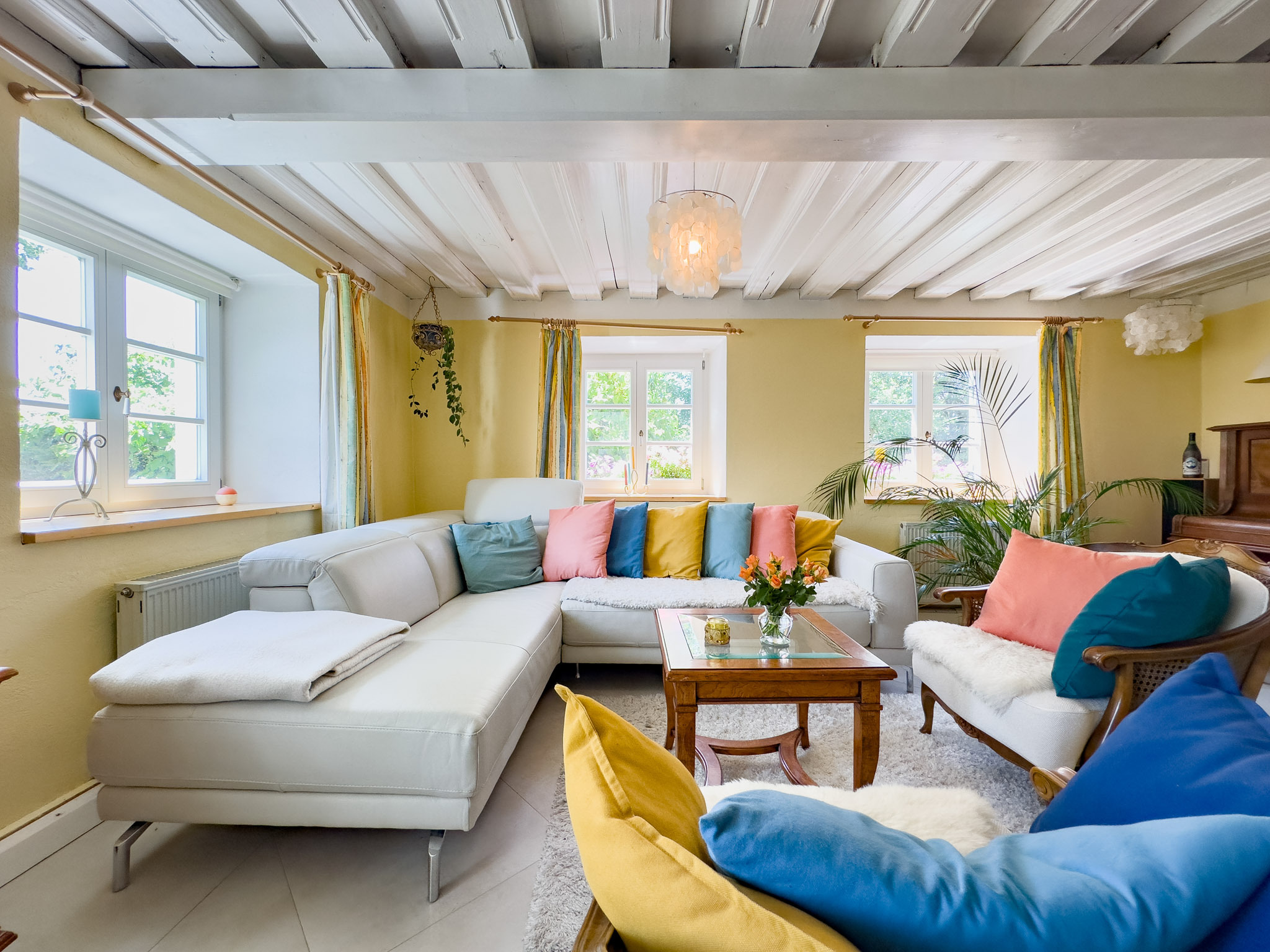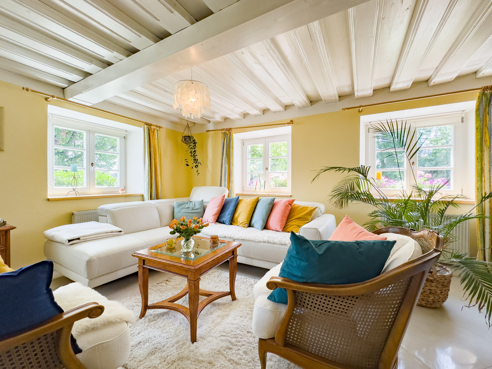 – Die originale Holzbalkendecke im Wohnzimmer wurde 2019 weiß lasiert
