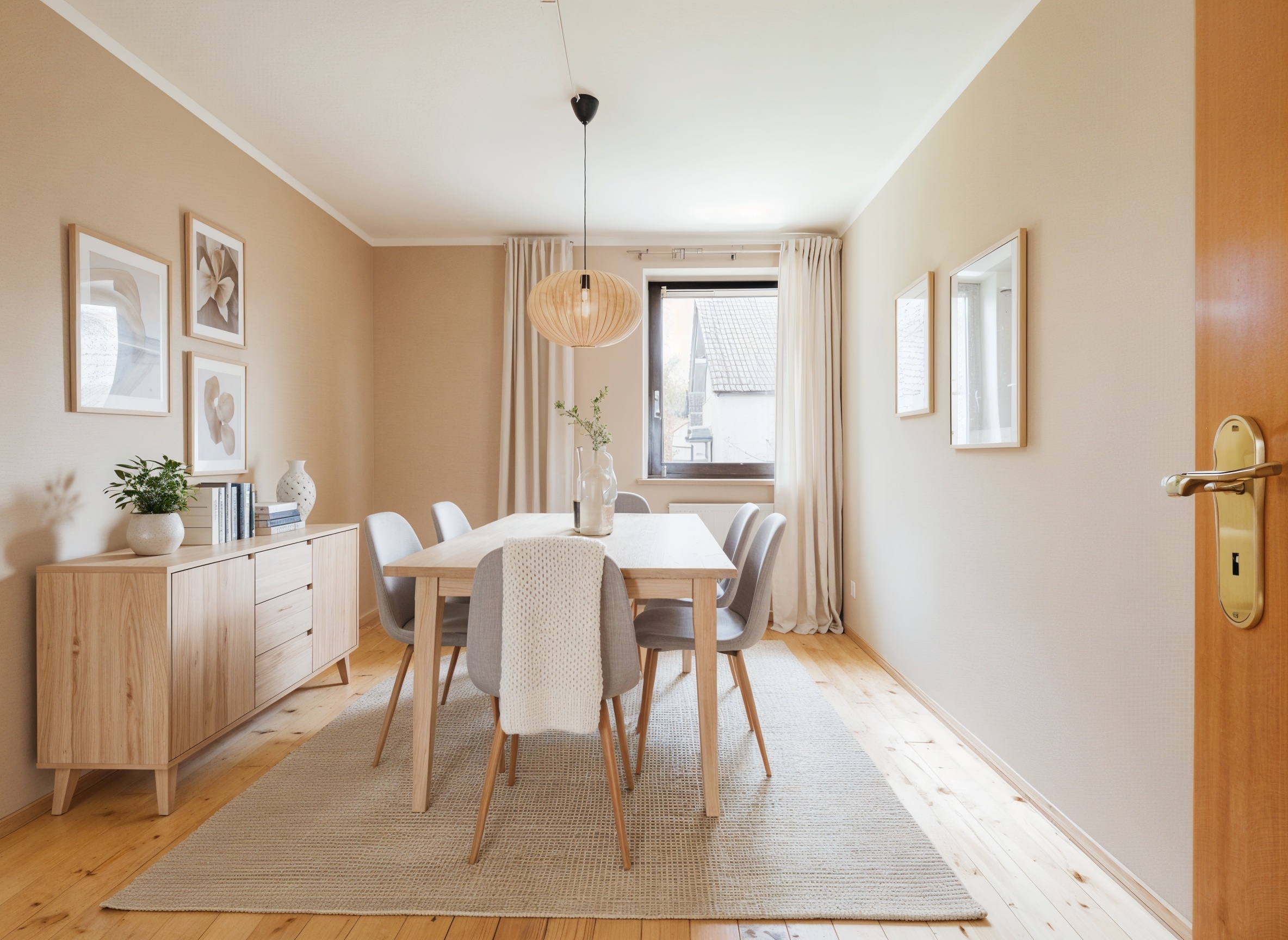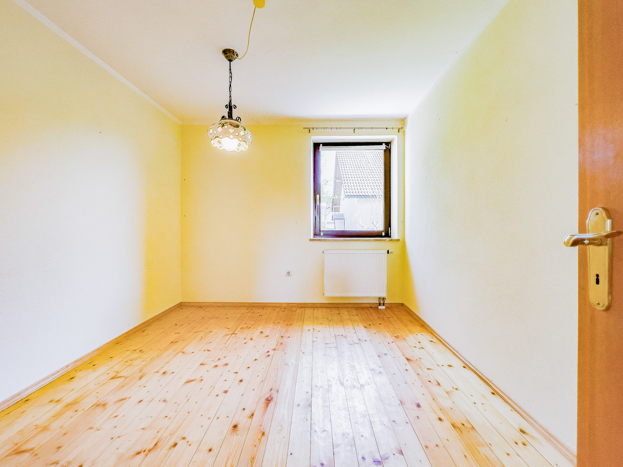 Im Erdgeschoss empfängt einen ein Flur mit alten, frisch geölten Holzdielen, die sofort eine warme Atmosphäre schaffen. Die Küche liegt separat, aber man merkt schnell: Wenn man später einmal einen Durchbruch zum Wohnzimmer möchte, wäre das gut machbar. Das Esszimmer hat denselben warmen Charakter und eignet sich perfekt für lange Abende am großen Tisch. Das Wohnzimmer ist hell, gemütlich und wirkt mit seinem Stäbchenparkett sofort einladend. Von hier aus gelangt man direkt in ein weiteres Zimmer, das sich gut als Elternschlafzimmer oder ruhiger Rückzugsort eignet.
