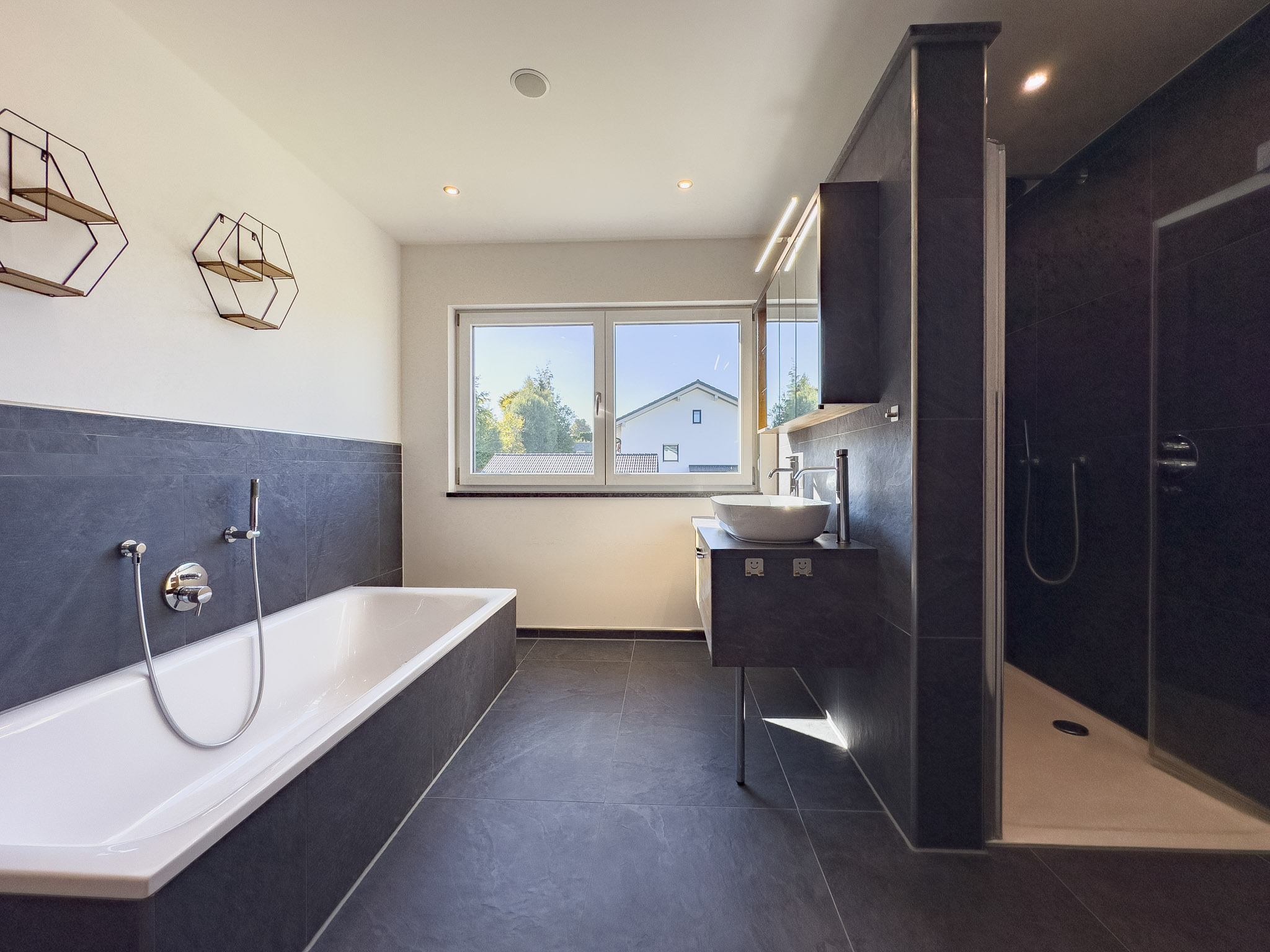 Das großzügige Badezimmer gleicht einer kleinen Wellnessoase: extrabreite Badewanne, Regendusche, Doppelwaschbecken, integriertes Radio – hier startet der Tag mit einem Lächeln.