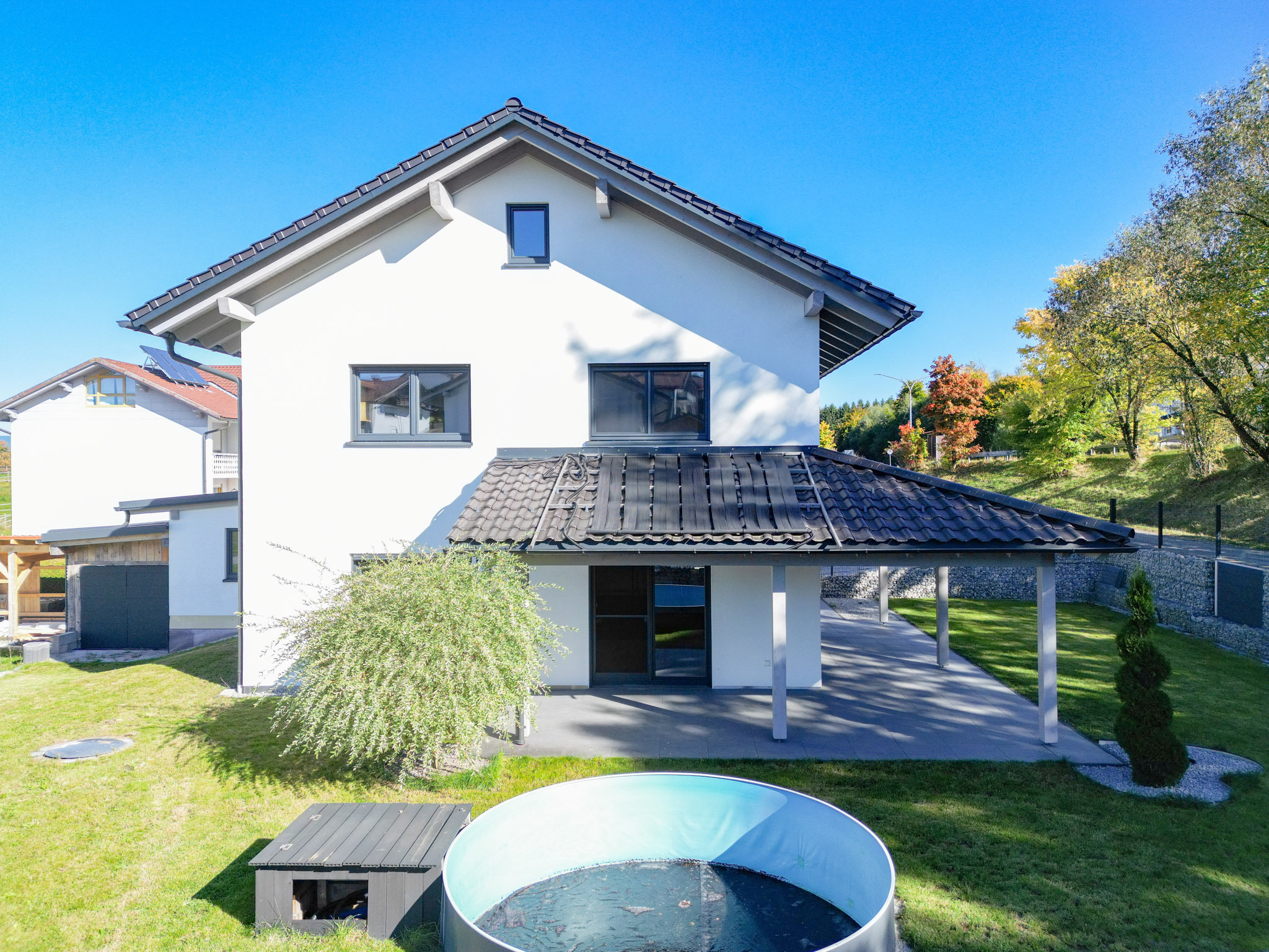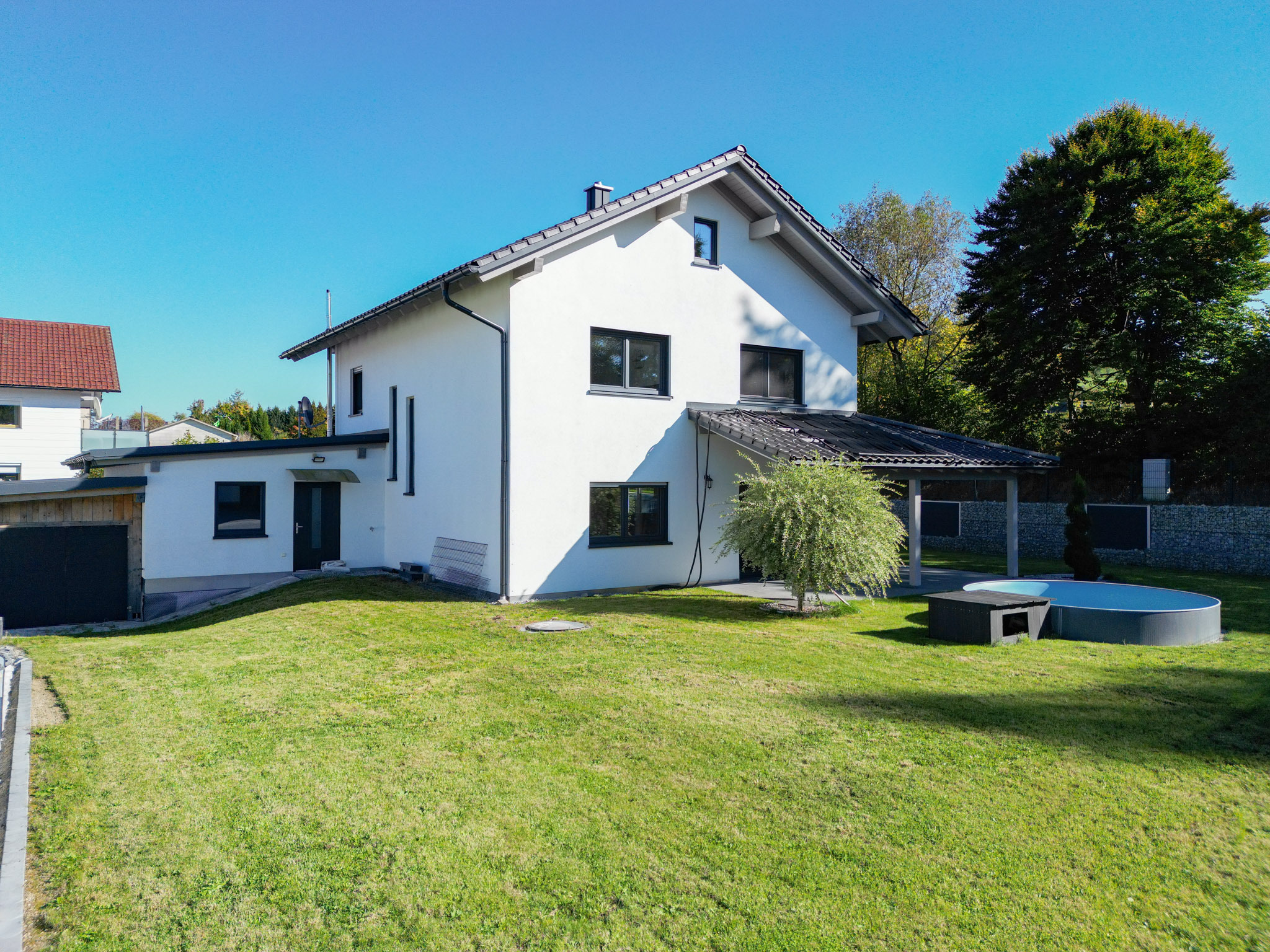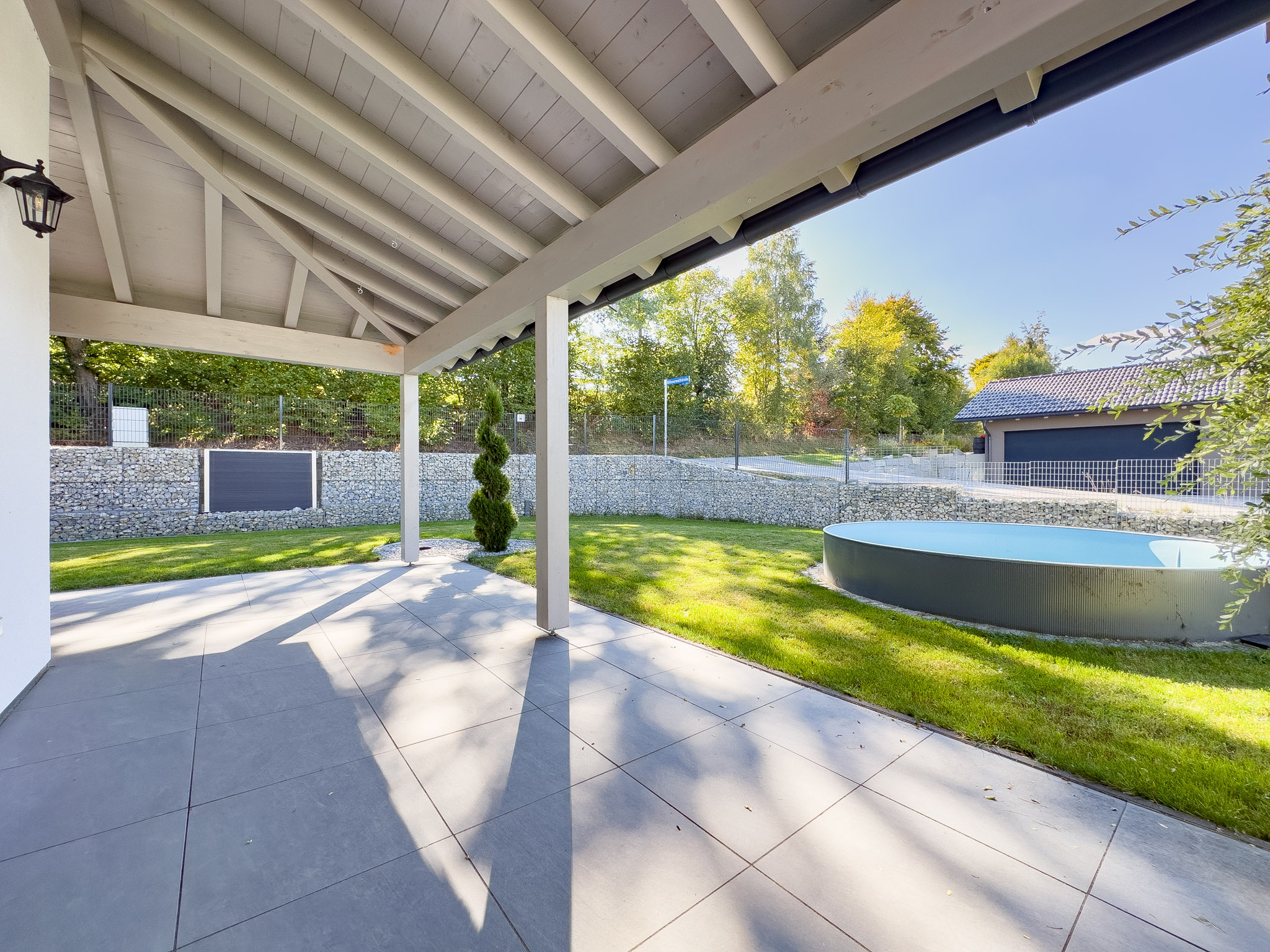 Vom Wohnzimmer und der Küche geht’s direkt hinaus auf die rund 50 Quadratmeter große, überdachte Süd-West-Terrasse. Der Blick über das gepflegte, 960 Quadratmeter große Grundstück, die Abendsonne, das Knistern im Ofen, während die Kinder im kleinen Pool planschen – das ist das Leben, das man sich wünscht.