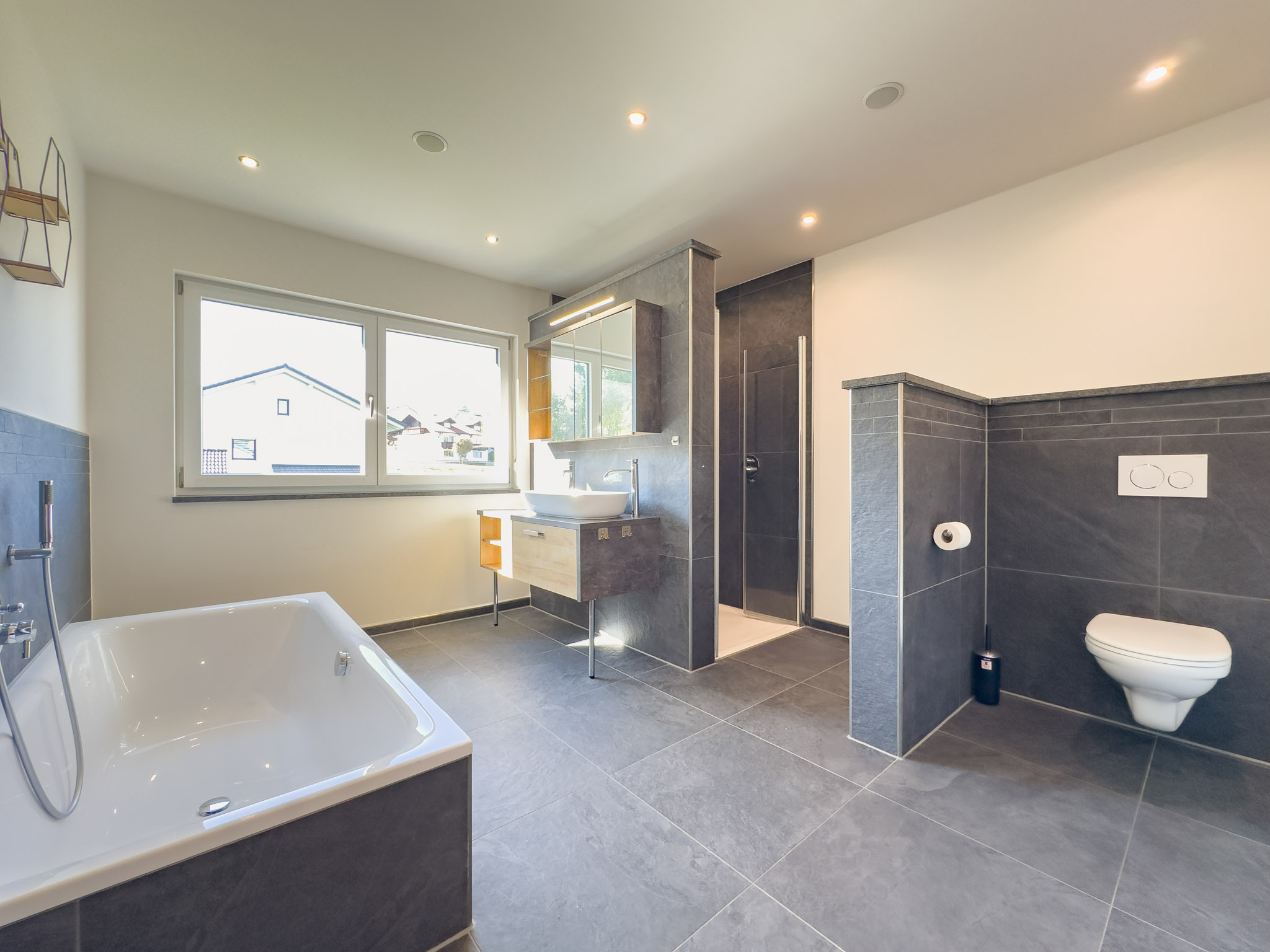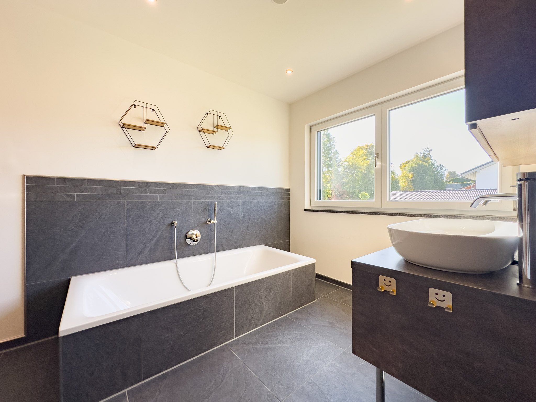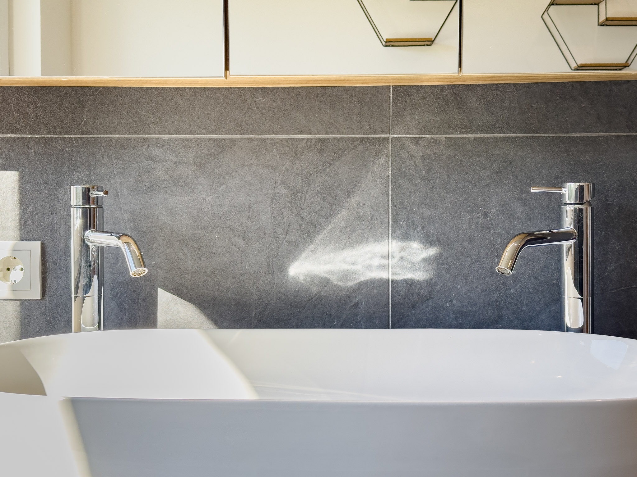 Das großzügige Badezimmer gleicht einer kleinen Wellnessoase: extrabreite Badewanne, Regendusche, Doppelwaschbecken, integriertes Radio – hier startet der Tag mit einem Lächeln.