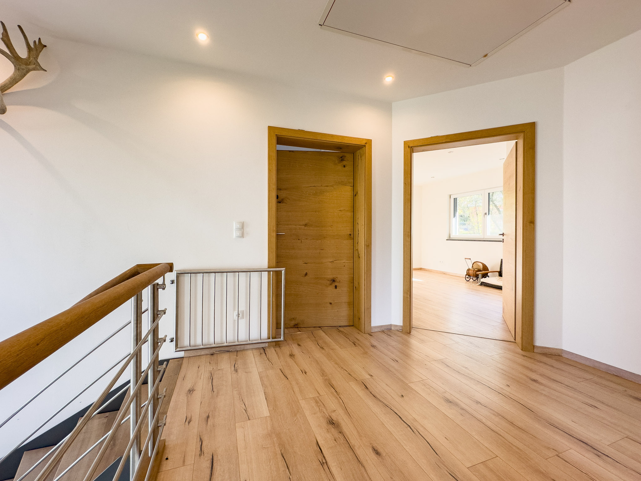Platz für jedes Familienmitglied – Im Obergeschoss warten drei liebevoll gestaltete Schlafzimmer – ideal für Familien mit zwei Kindern. Besonders charmant: das Kinderzimmer mit Galerie und Spielnetz, ein echtes Highlight für kleine Entdecker. Das Elternschlafzimmer und eines der beiden Kinderzimmer punkten mit einem begehbarem Kleiderschrank, das zweite Kinderzimmer ist ebenso hell wie freundlich.