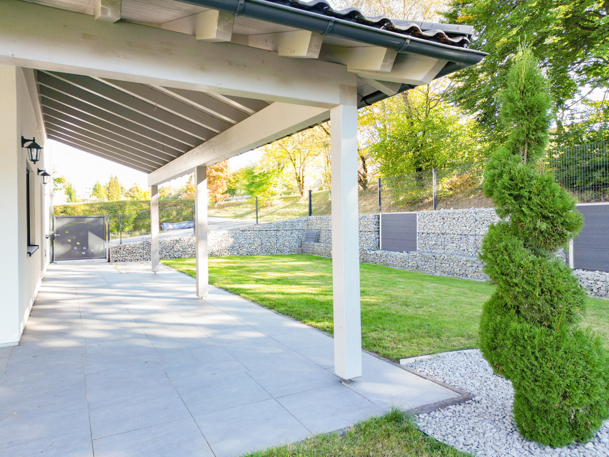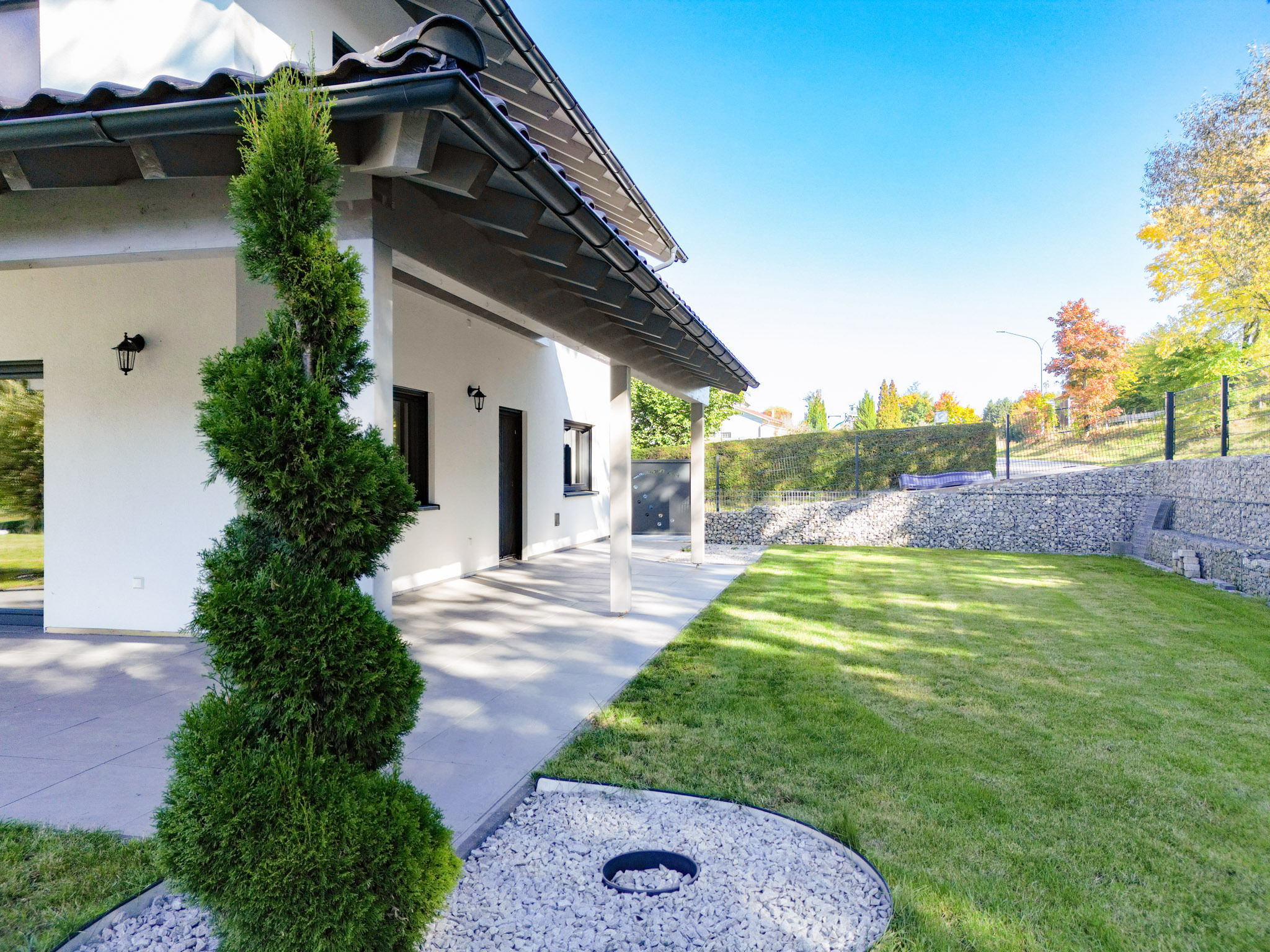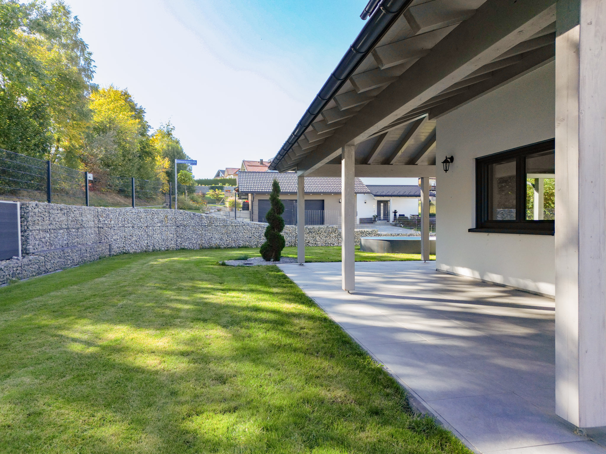 Das Grundstück ist gepflegt, durchdacht angelegt und pflegeleicht. Gabionen, Rasenflächen, Sonnenterrasse, Pool – alles harmonisch aufeinander abgestimmt.