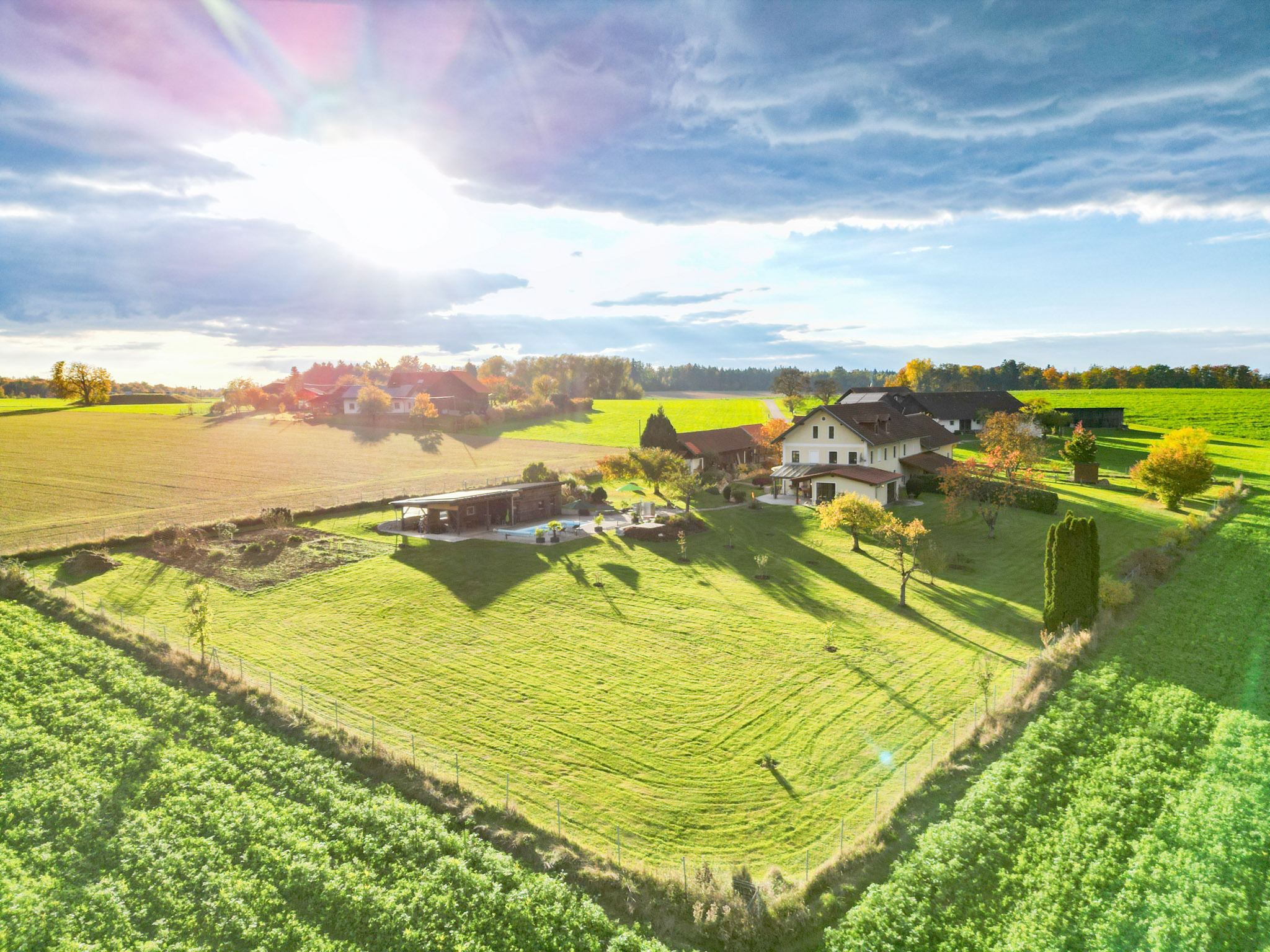 Schon die Einfahrt vermittelt, dass man hier etwas Besonderes betritt: Über ein elektrisches Tor öffnet sich der Blick auf das über 7.000 m² große, vollständig eingefriedete Grundstück – ein Paradies der Ruhe und Privatsphäre mit Weitblick bis in den Bayerischen Wald. Mehrere uneinsehbare Terrassen, ein prachtvoll angelegter Garten und der beheizbare Salzwasserpool mit angrenzendem Poolhaus schaffen eine Atmosphäre, die an südliche Rückzugsorte erinnert – und das mitten in Niederbayern.