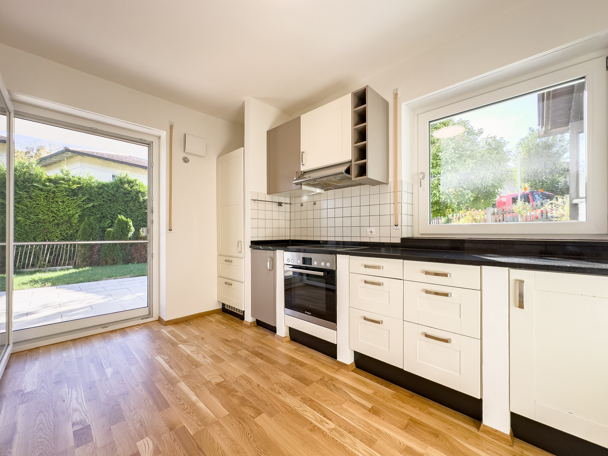 Der Mittelpunkt ist der offen gestaltete Wohn-, Ess- und Kochbereich. Hell, großzügig, mit direktem Bezug nach draußen. Hier spielt sich der Alltag ab: Frühstück vor der Schule, Homeoffice mit Blick ins Grüne, Abende am Esstisch, an denen es einfach länger dauert. Der Holzofenanschluss sorgt mit dem richtigen Holzofen nicht nur Wärme, sondern genau diese Atmosphäre, die ein Haus erst zu einem Zuhause macht (leider ist der abgebildete Holzofen nicht Bestandteil des Angebots). Von hier geht es direkt auf die Terrasse und in den Garten – überschaubar, gepflegt, komplett eingezäunt. Ein Ort, an dem Kinder frei spielen können und der trotzdem nicht zur Dauerbaustelle wird.