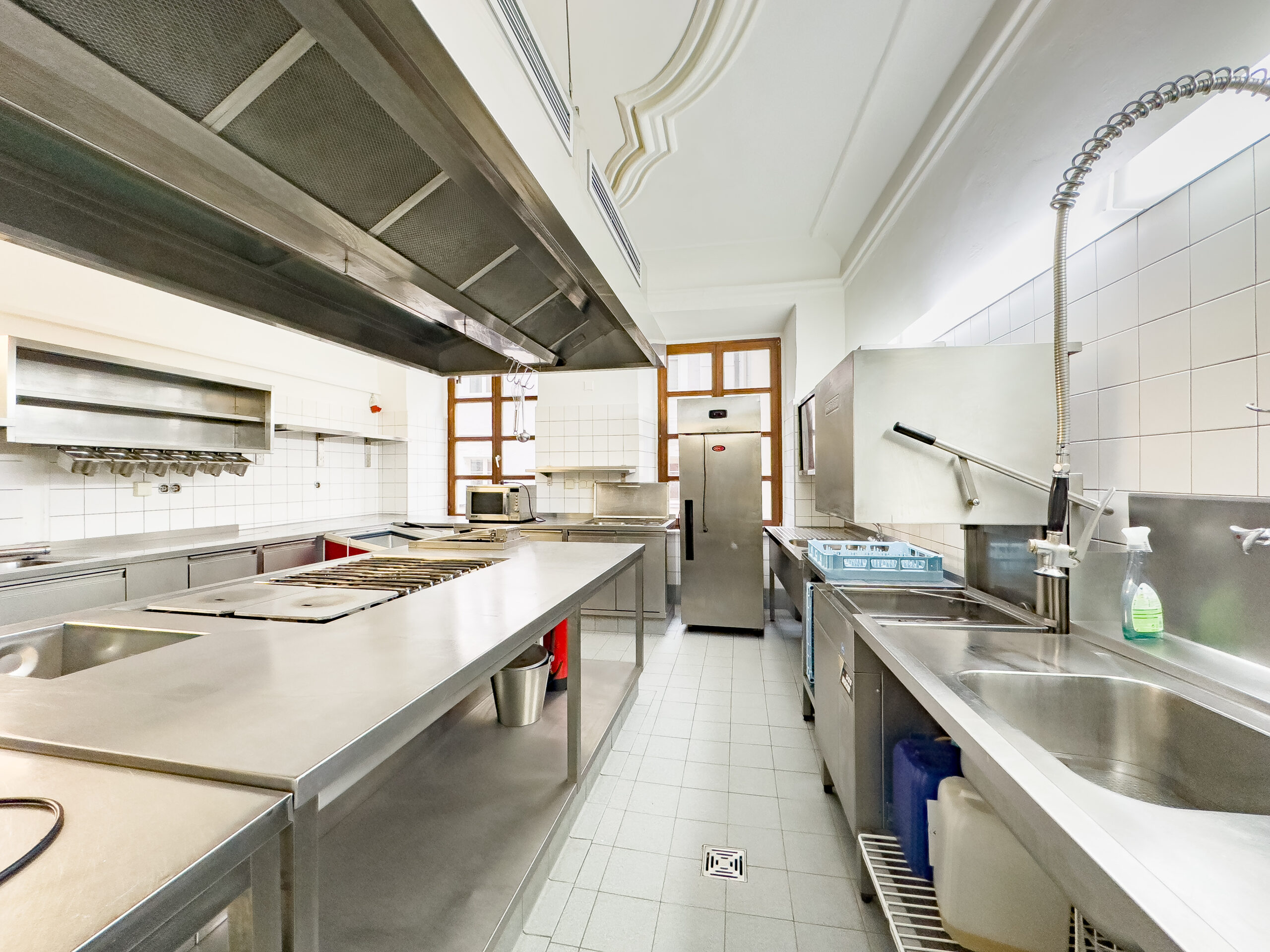 Die Gastraumfläche im Erdgeschoss erstreckt sich über ca. 115 m², ergänzt durch ca. 81 m² an Nebenflächen. Diese umfassen WCs, Lager, Kühlräume und eine voll ausgestattete Gastroküche, die das Herz jedes Kochs höherschlagen lässt.