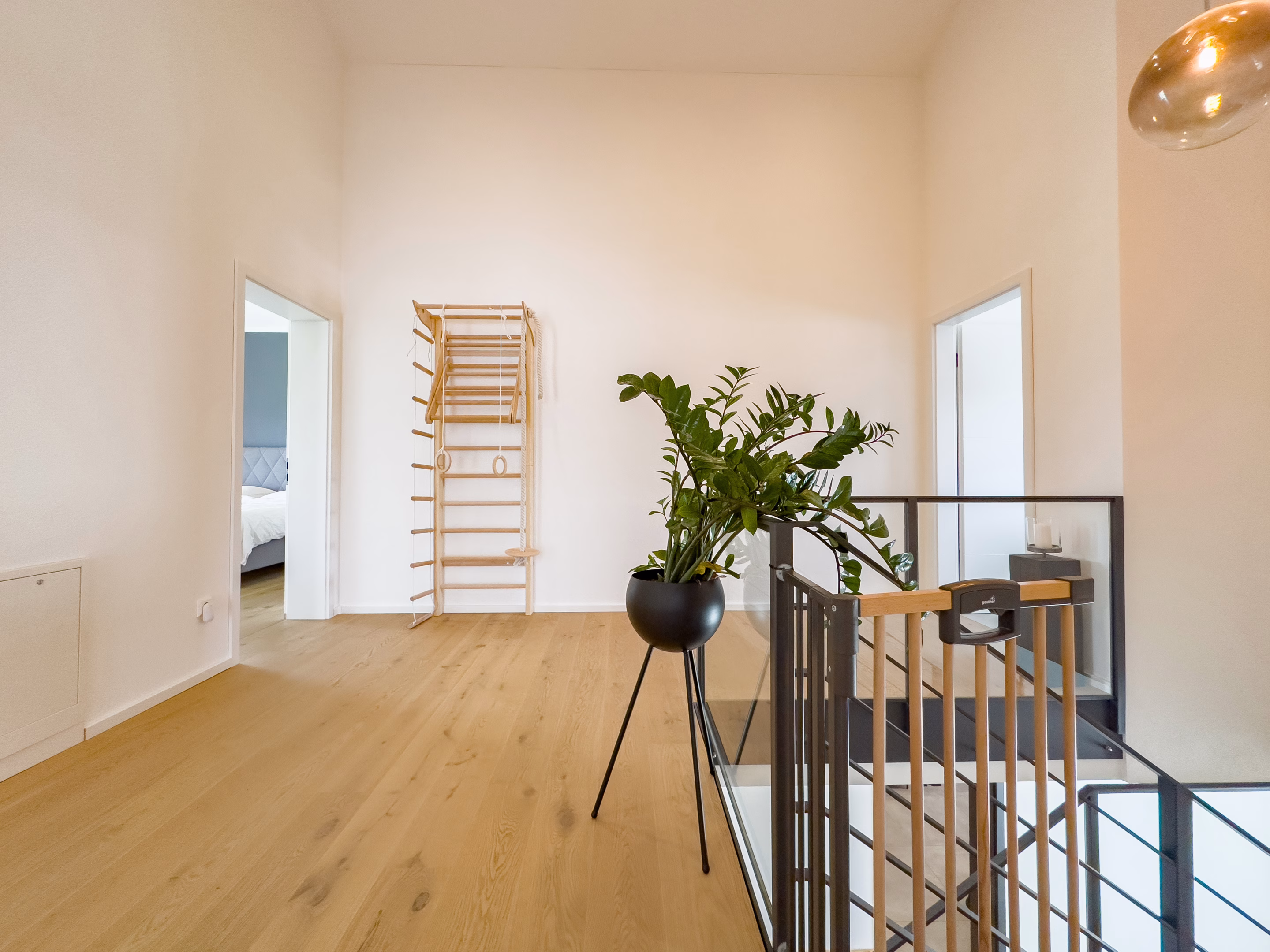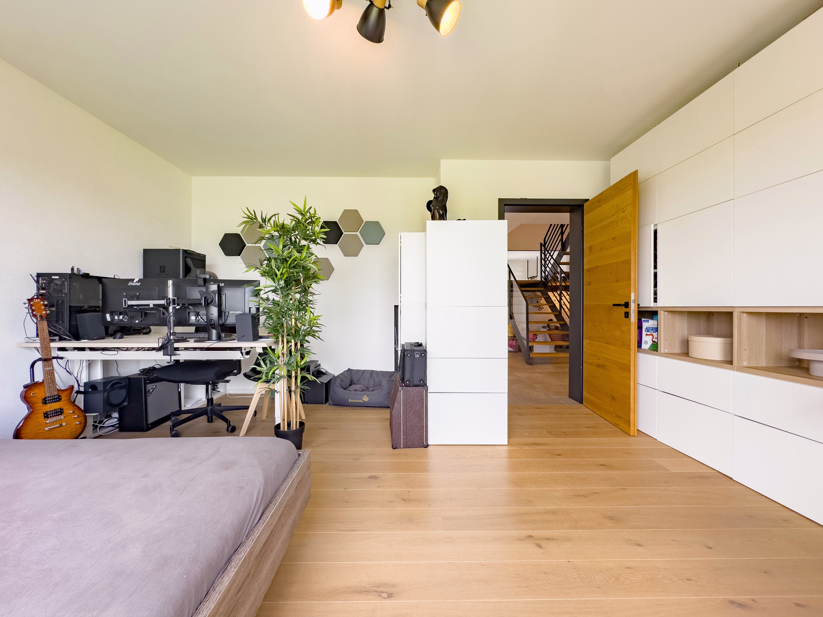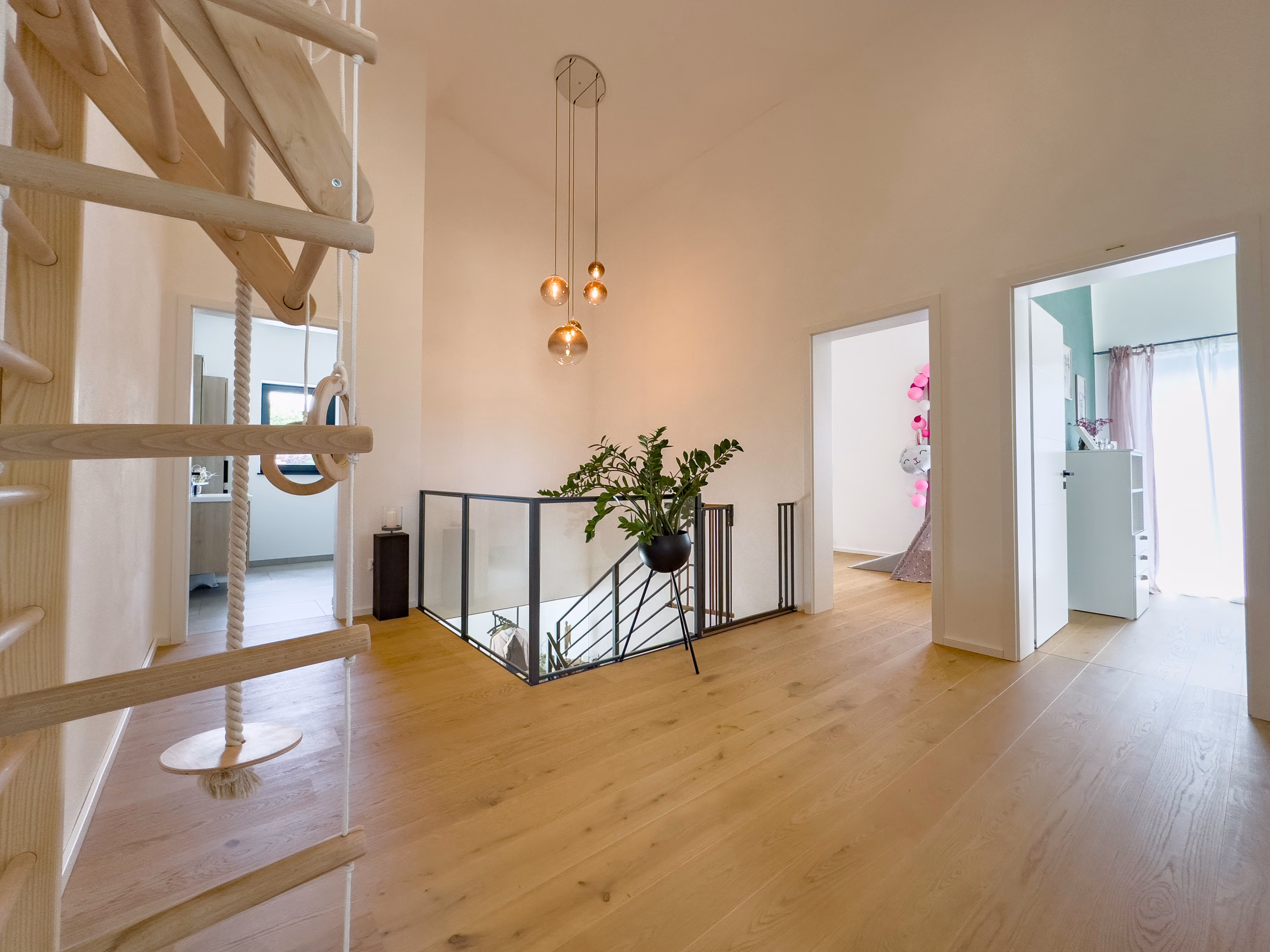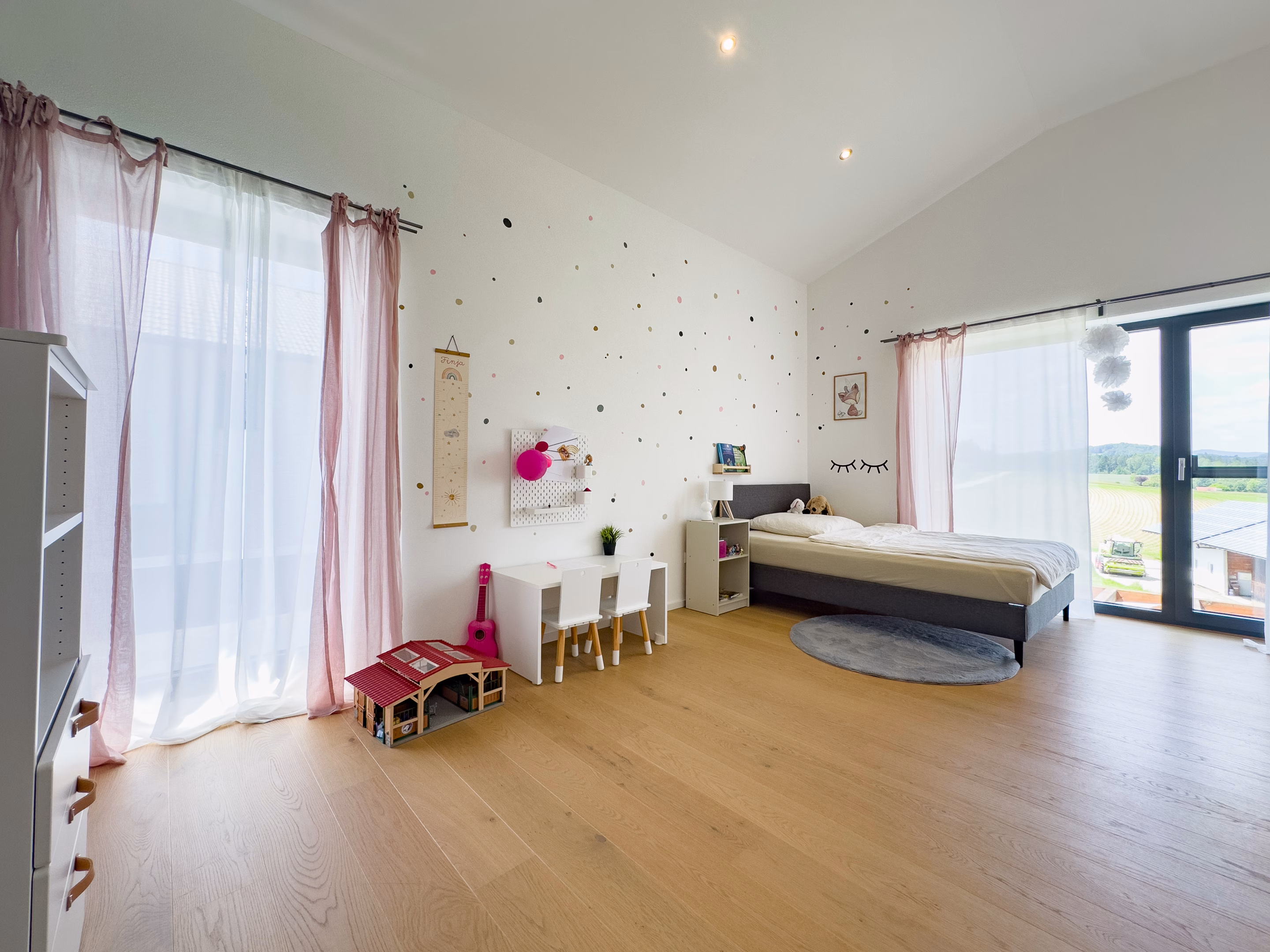 Das Obergeschoss setzt die hochwertige Linie nahtlos fort: Zwei großzügige Kinderzimmer mit Zugang zur kleinen Dachterrasse bieten dank der beeindruckenden Deckenhöhe von 4,50 Metern sogar Platz für kreative Hochbettlösungen oder Spielgalerien. Ein eigenes Kinderbad mit Tageslicht, Regendusche und WC sorgt für morgendliche Harmonie im Familienalltag. Für die Eltern wird das Schlafzimmer zum persönlichen Rückzugsort – mit angeschlossener großer Ankleide und einem exklusiven Bad en Suite, das Wellness auf höchstem Niveau bietet: Eine halb freistehende Badewanne, eine Regendusche, ein Doppelwaschtisch und – als absolutes Highlight – eine finnische Sauna mit indirekter Beleuchtung, Soundsystem und Infrarotfunktion. Gebaut aus Thermoespe – für ein besonderes Raumklima und stilvolles Design.