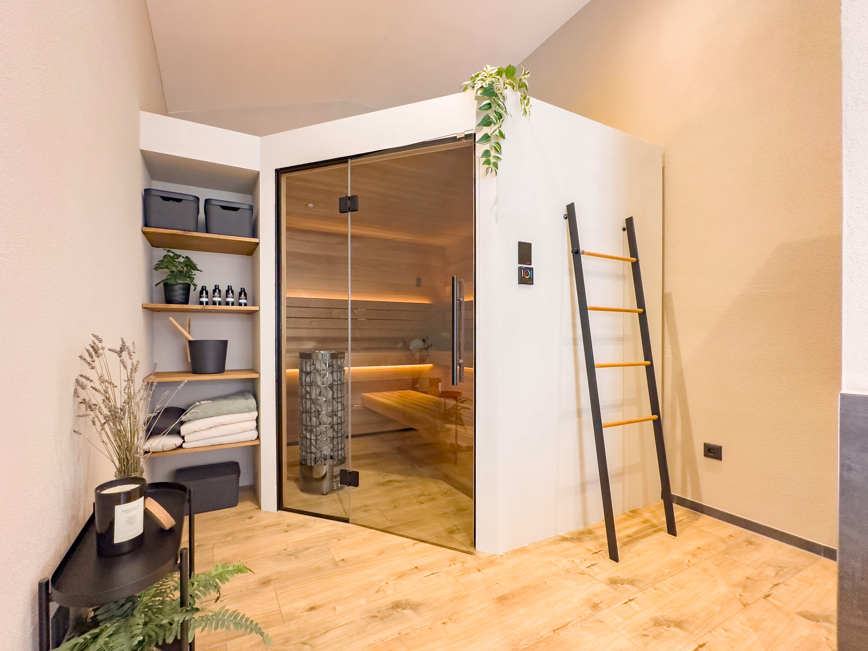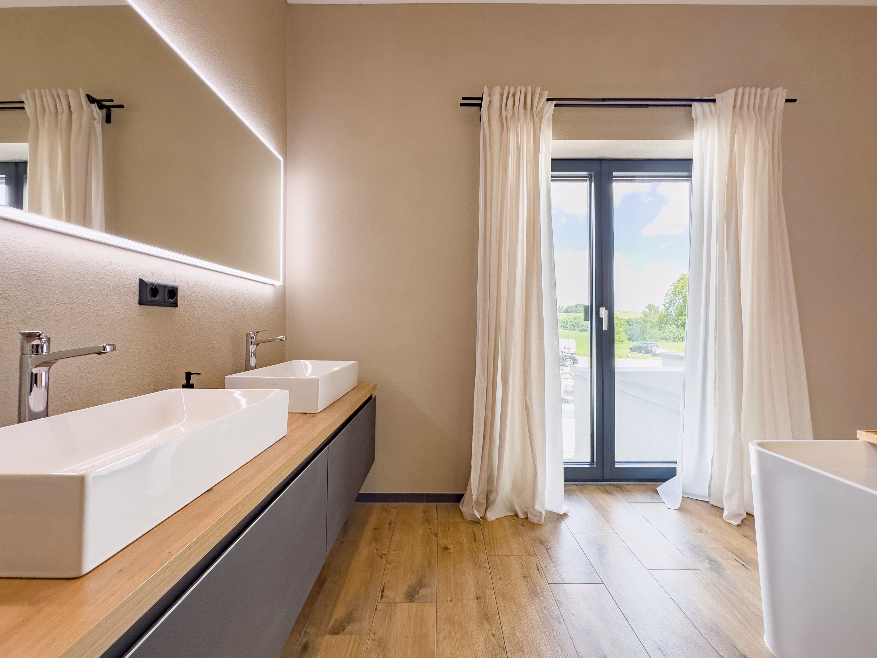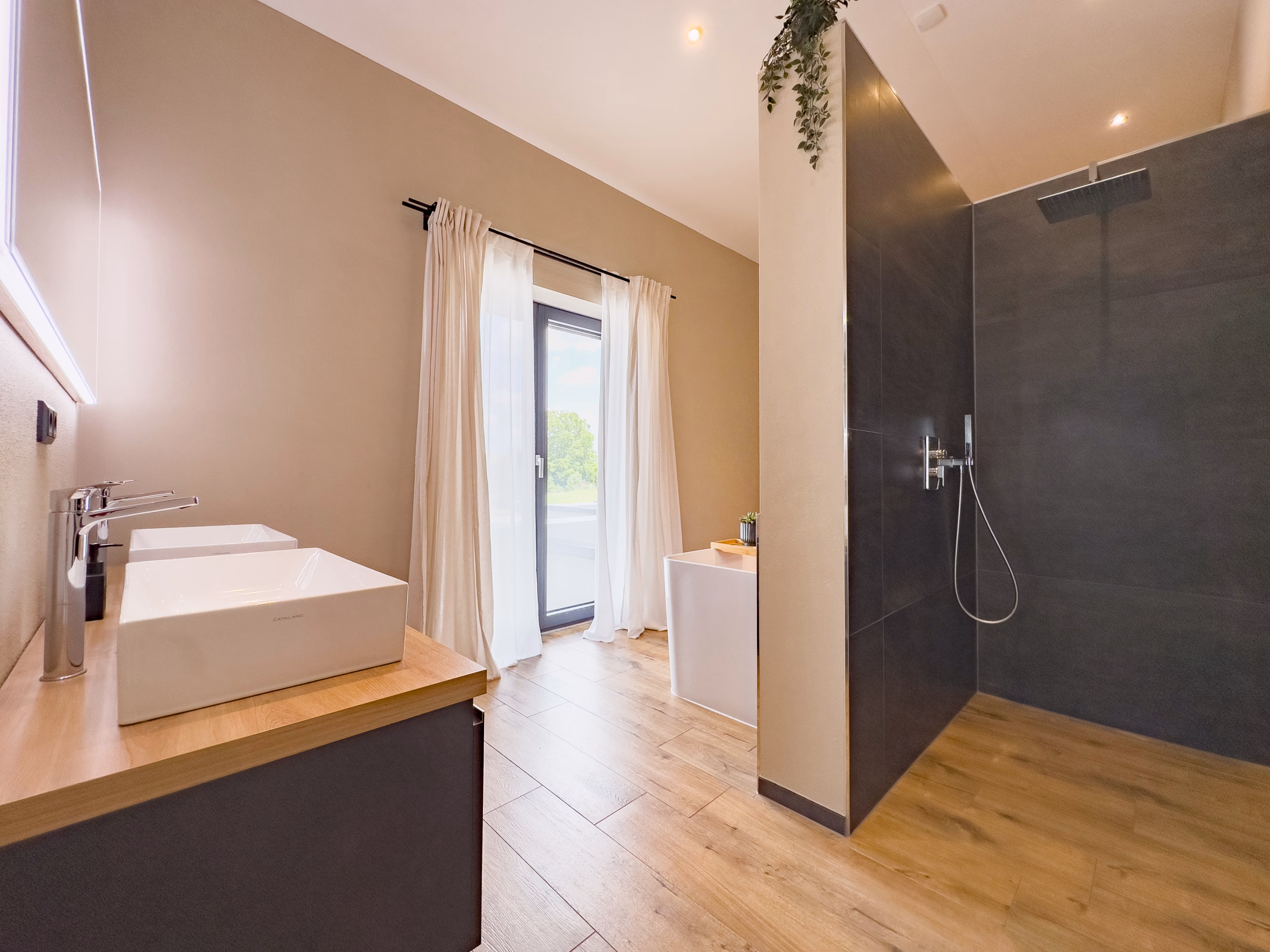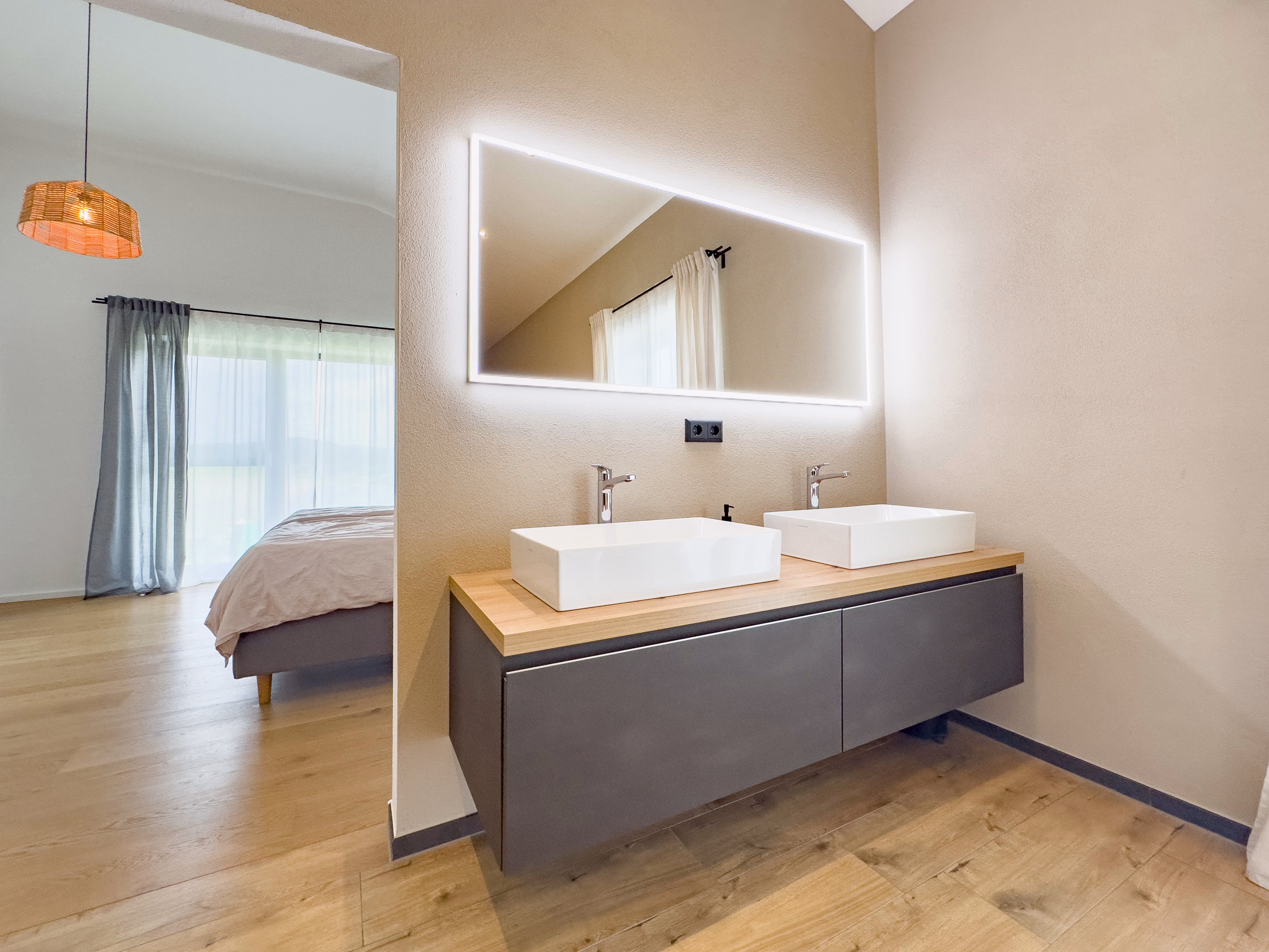 Das Obergeschoss setzt die hochwertige Linie nahtlos fort: Zwei großzügige Kinderzimmer mit Zugang zur kleinen Dachterrasse bieten dank der beeindruckenden Deckenhöhe von 4,50 Metern sogar Platz für kreative Hochbettlösungen oder Spielgalerien. Ein eigenes Kinderbad mit Tageslicht, Regendusche und WC sorgt für morgendliche Harmonie im Familienalltag. Für die Eltern wird das Schlafzimmer zum persönlichen Rückzugsort – mit angeschlossener großer Ankleide und einem exklusiven Bad en Suite, das Wellness auf höchstem Niveau bietet: Eine halb freistehende Badewanne, eine Regendusche, ein Doppelwaschtisch und – als absolutes Highlight – eine finnische Sauna mit indirekter Beleuchtung, Soundsystem und Infrarotfunktion. Gebaut aus Thermoespe – für ein besonderes Raumklima und stilvolles Design.