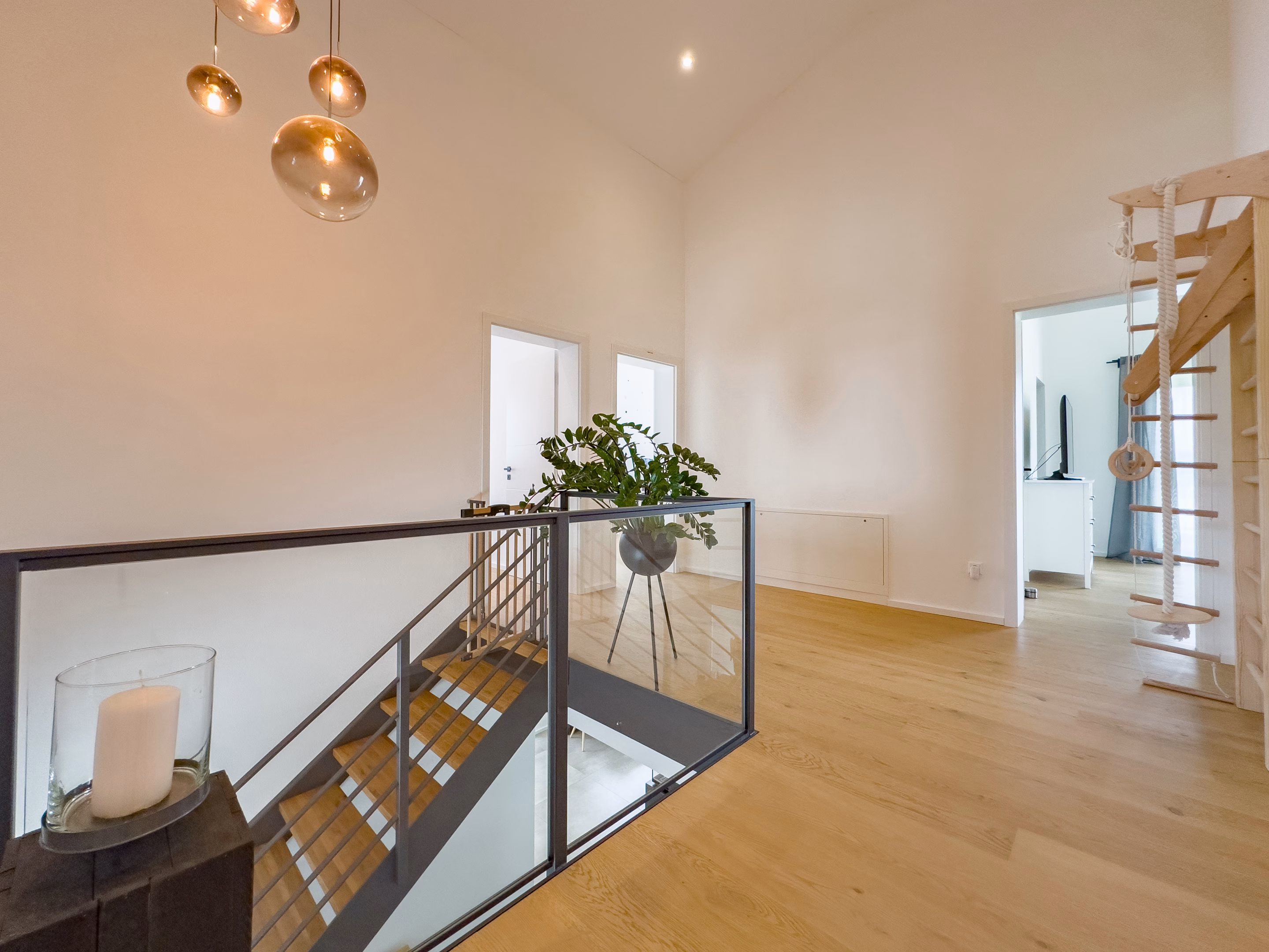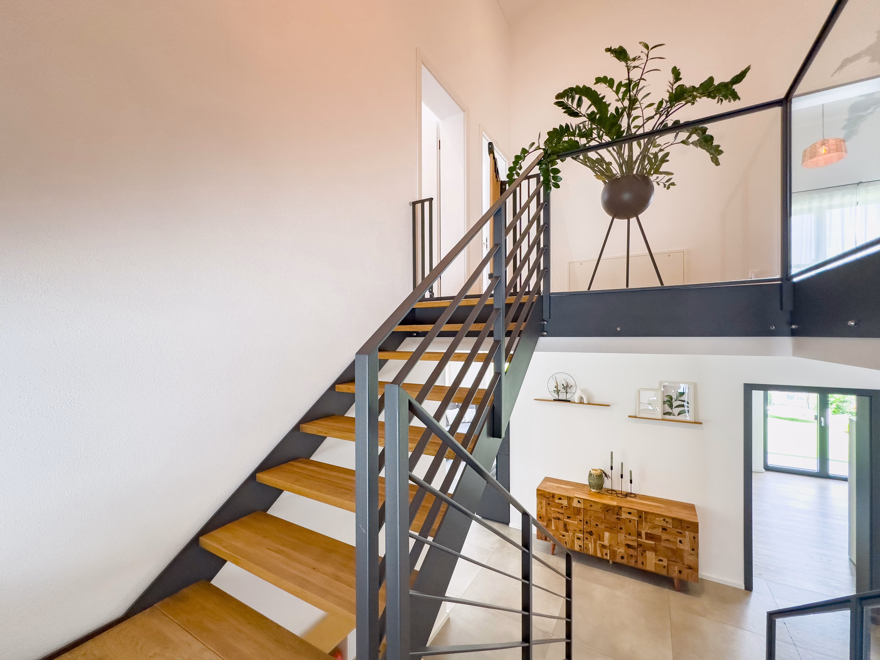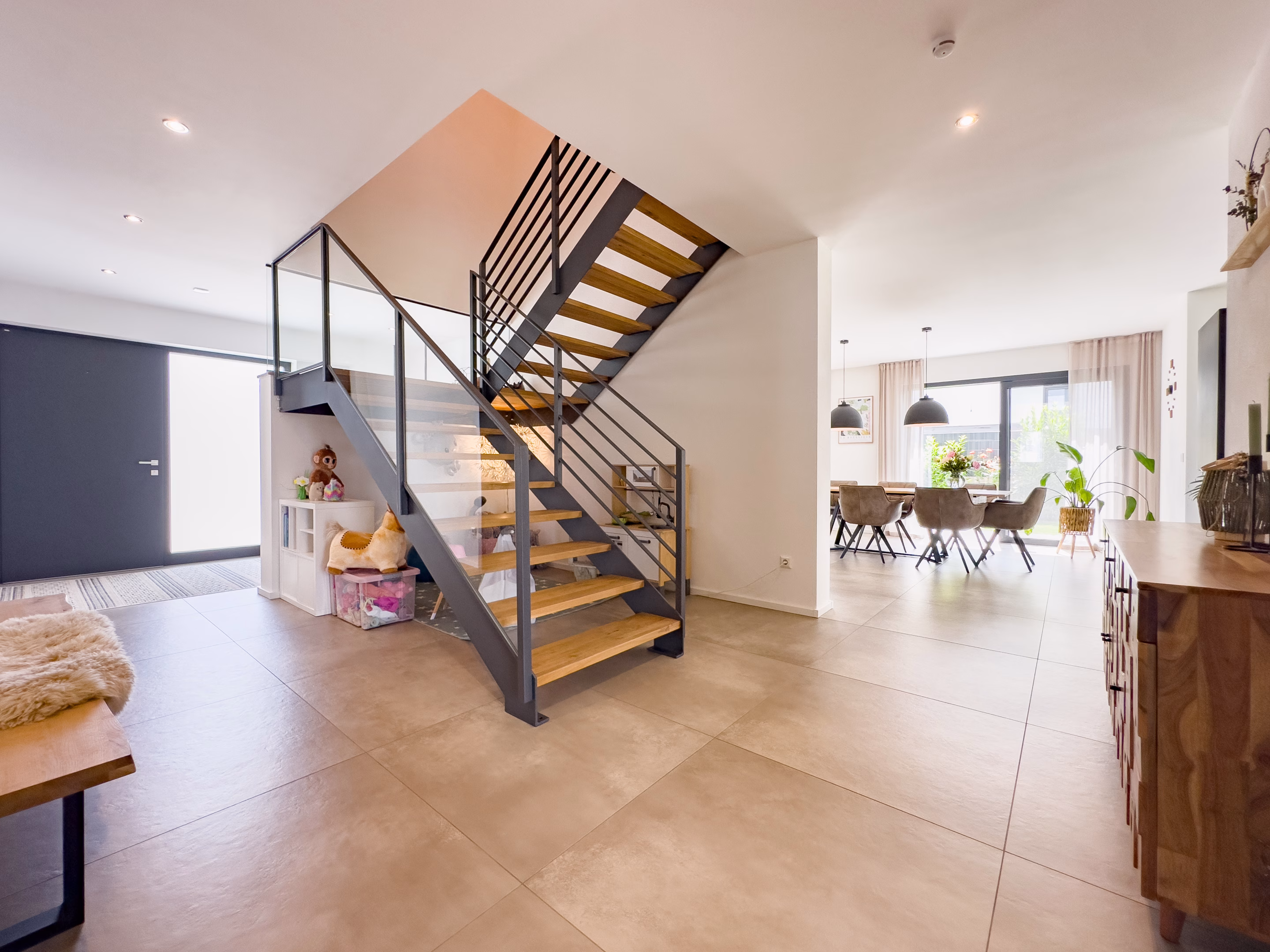 – stylische Stahl-Eichen-Treppe die perfekt in den Wohnraum integriert ist und als Spielehöhle für die Kinder dient