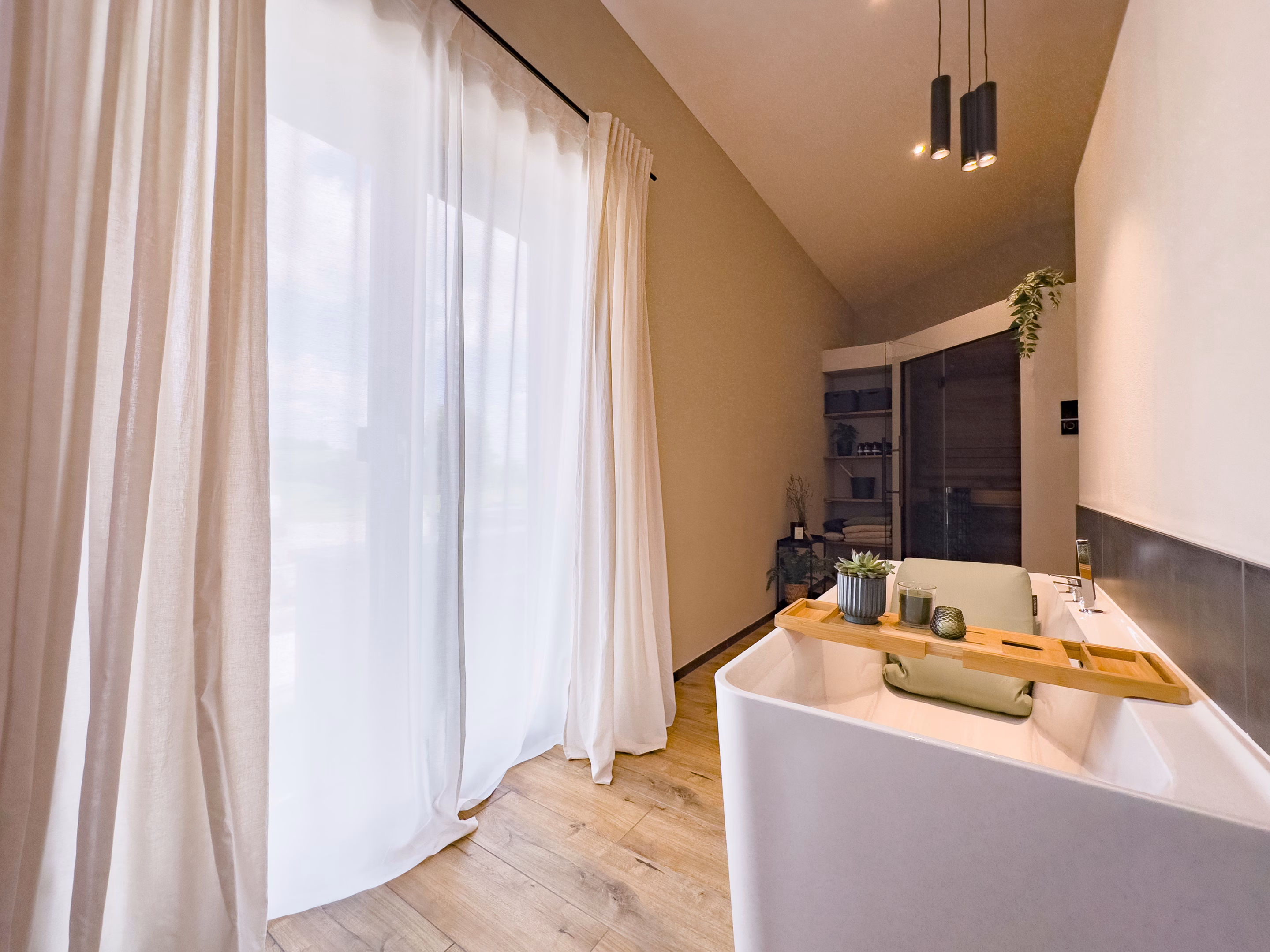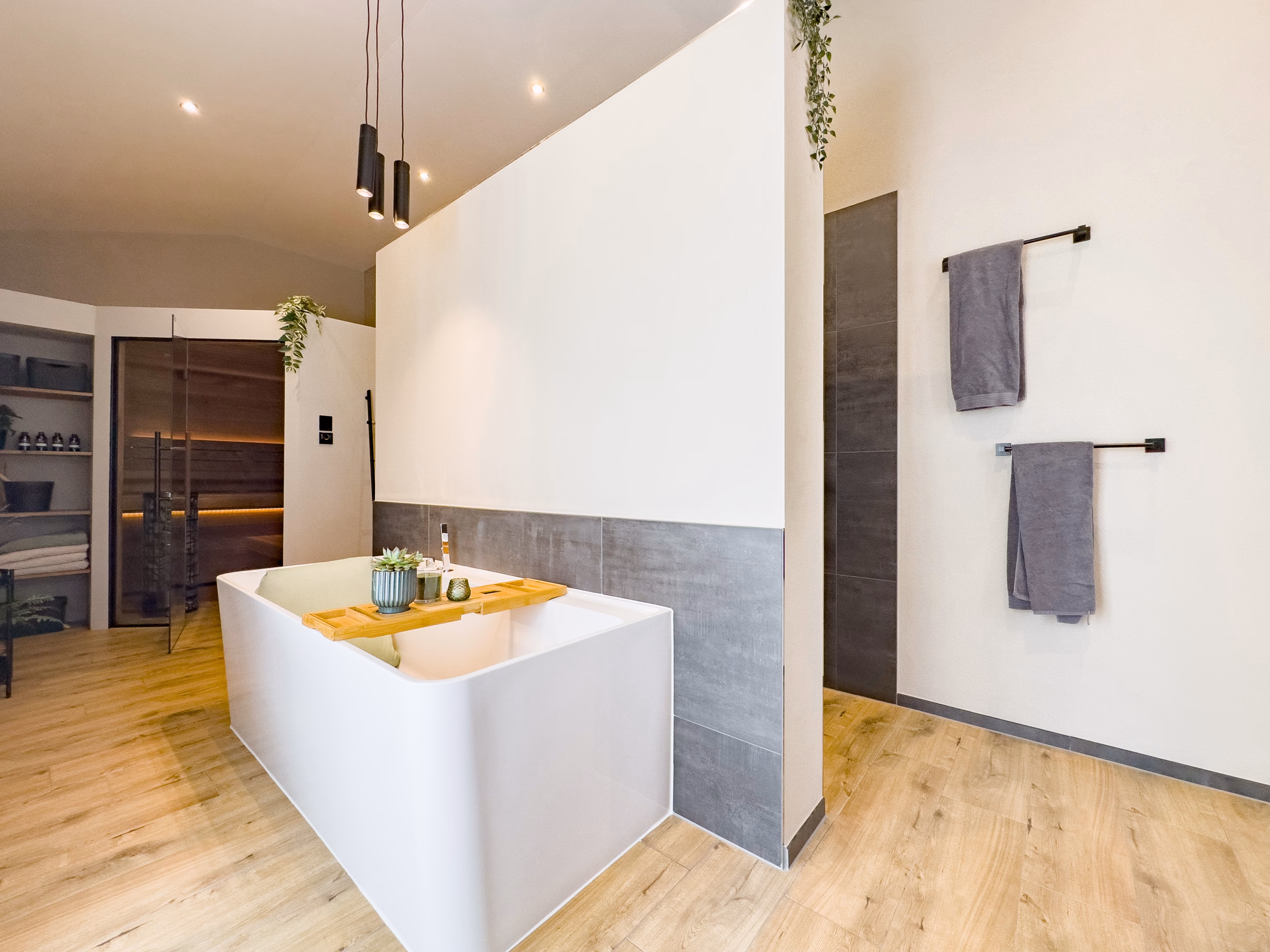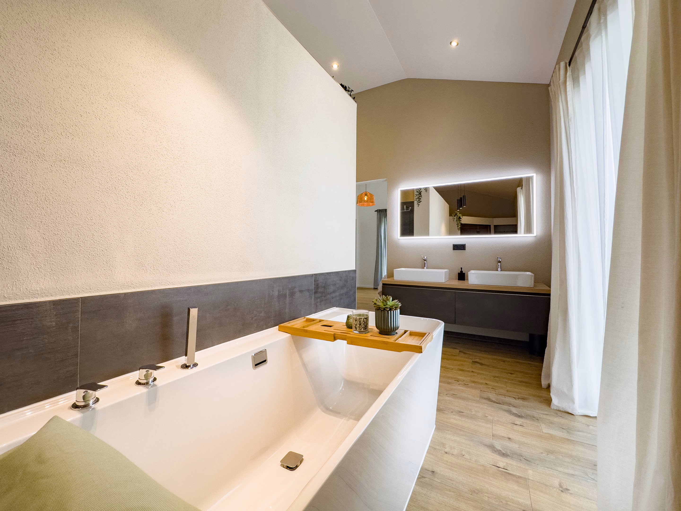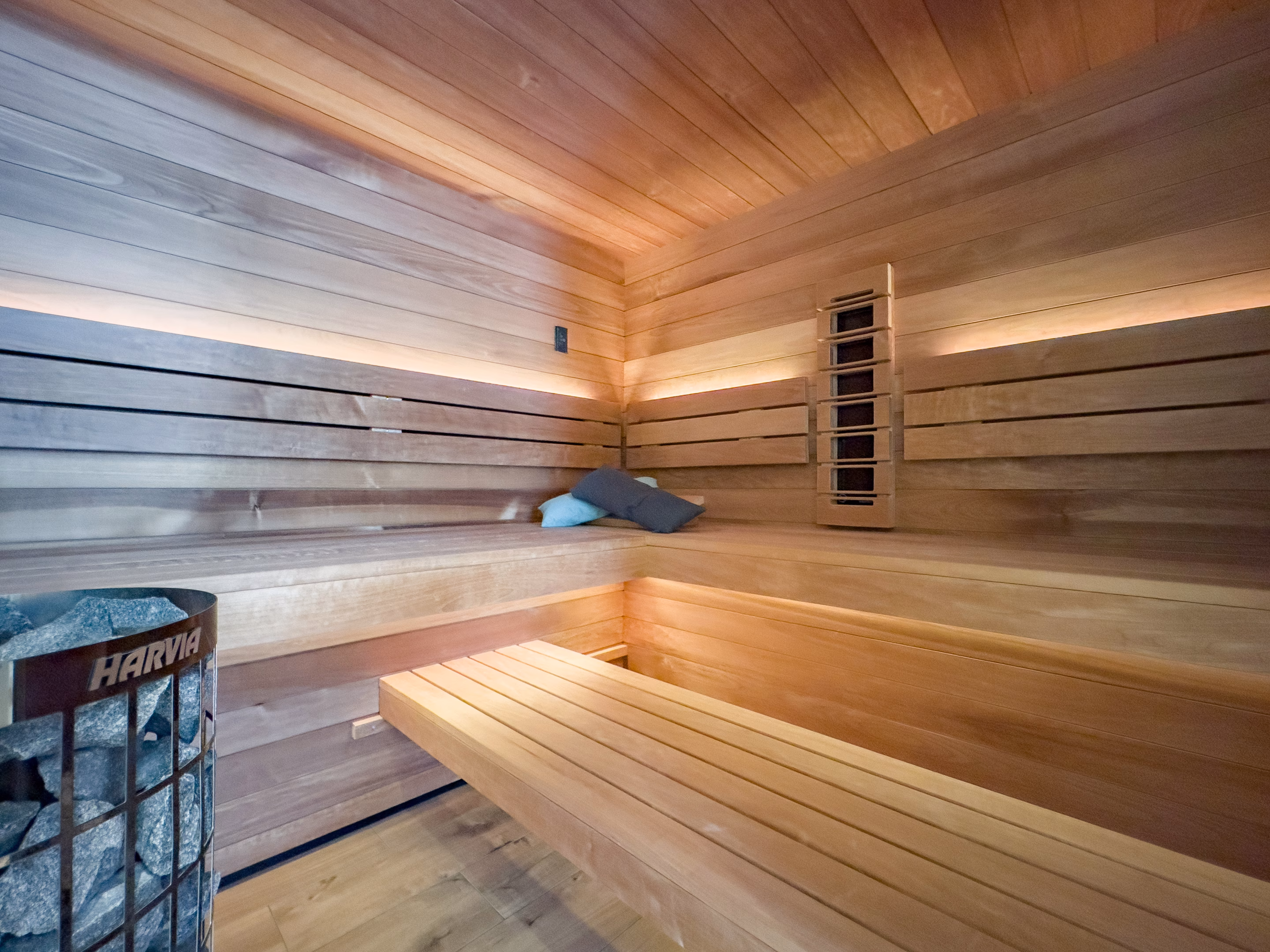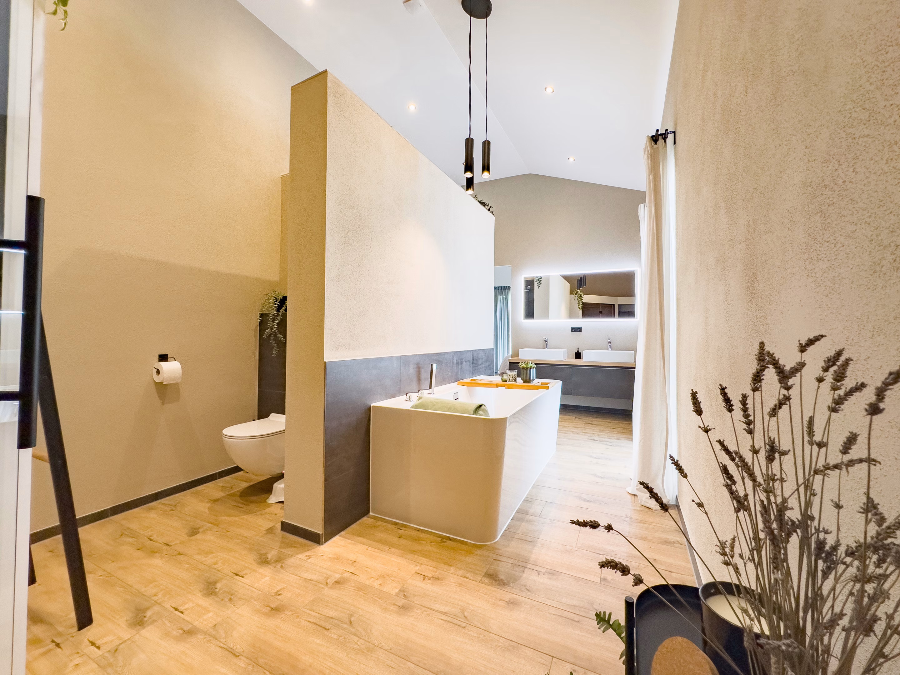 – das Hauptbadezimmer ist ausgestattet mit einer Regendusche, einer halb freistehenden Badewanne, einem Doppelwaschtisch und einer finnischen Sauna