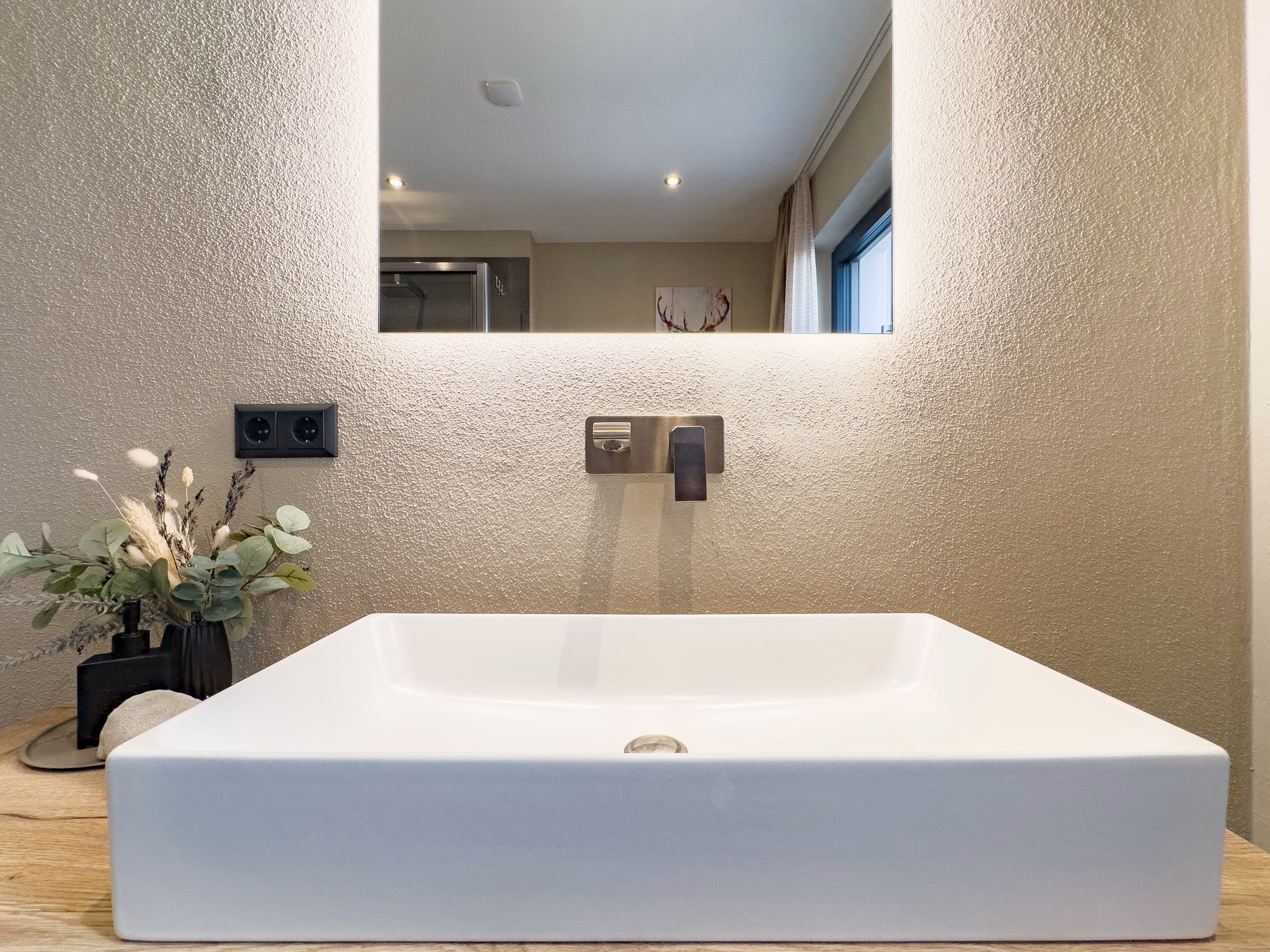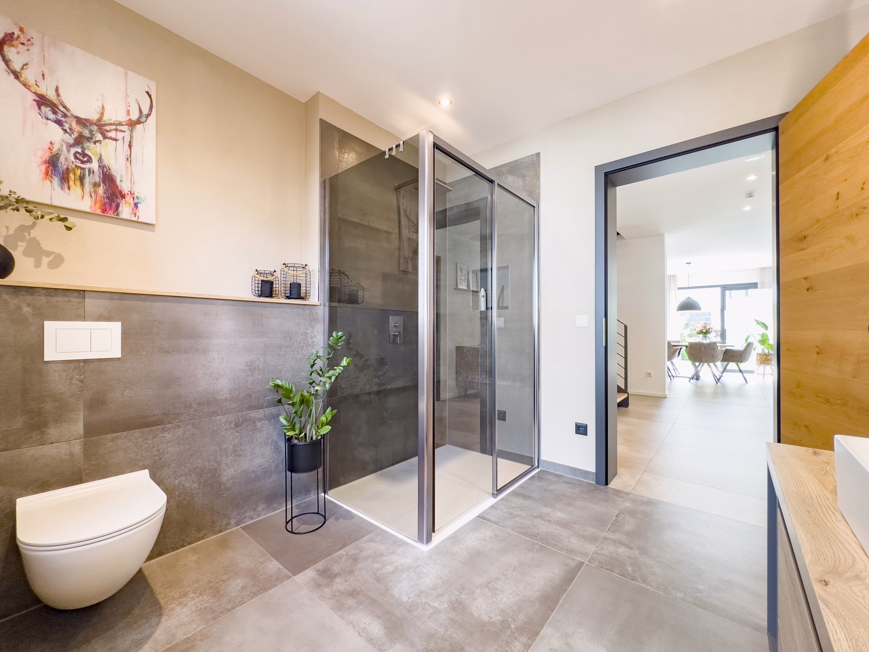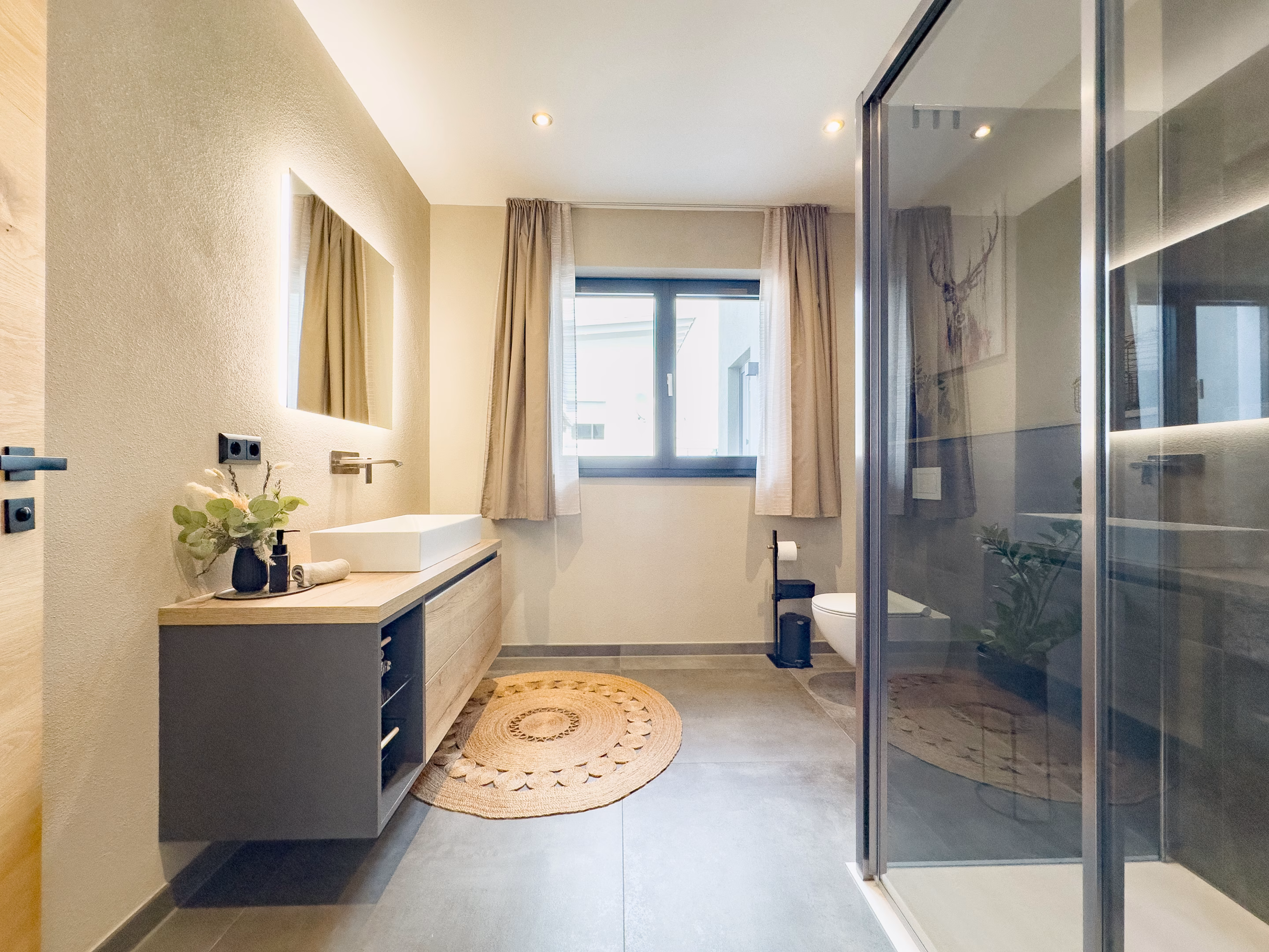 – hochwertig ausgestattetes Gäste-Bad mit gebürsteten Edelstahl Armaturen, matter Keramik, großformatigen Anti-Rutsch-Fliesen, ebenerdiger XXL-Regendusche, WC, und Waschbecken mit Wandauslauf und Unterschrank