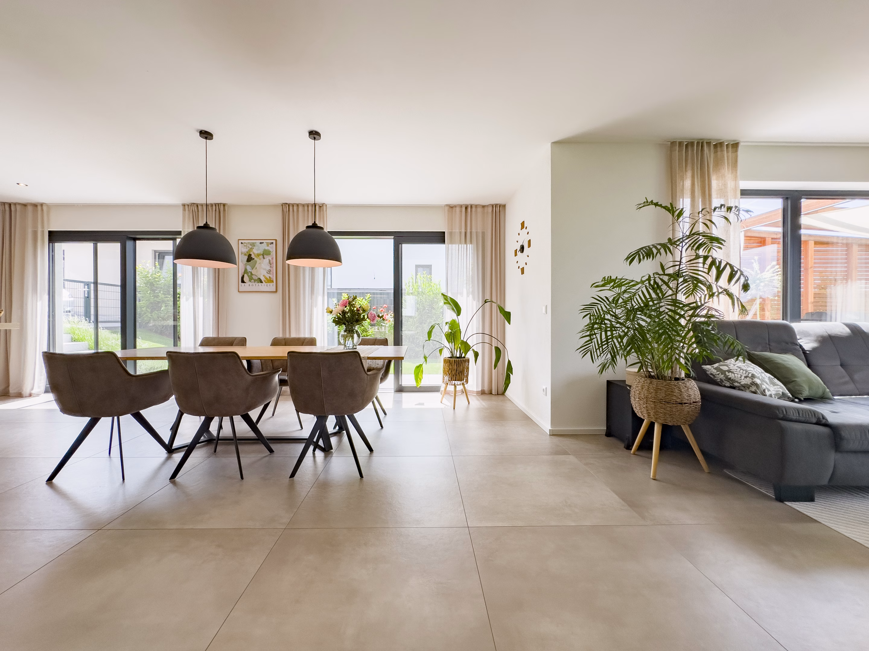 – edle, großformatige Fliesen (90×90 cm) im Wohn- Essbereich
