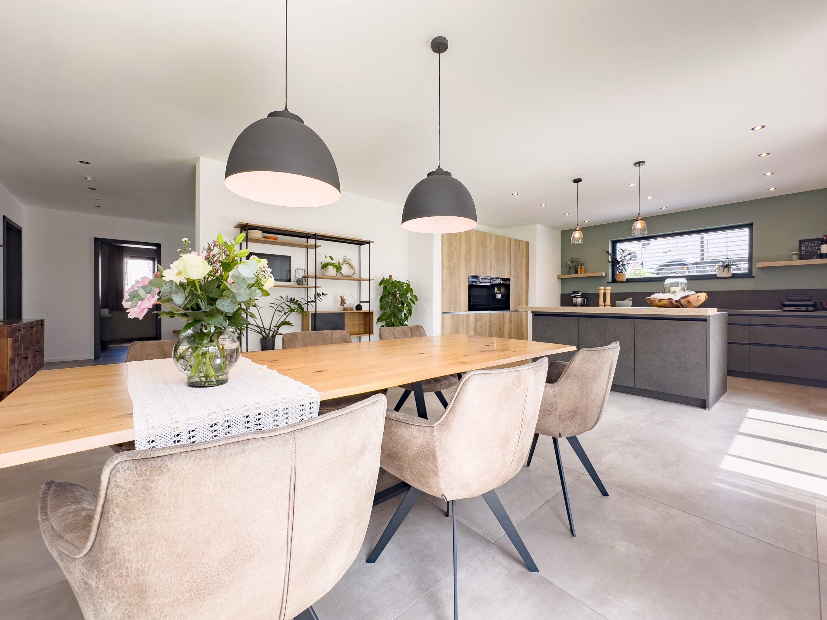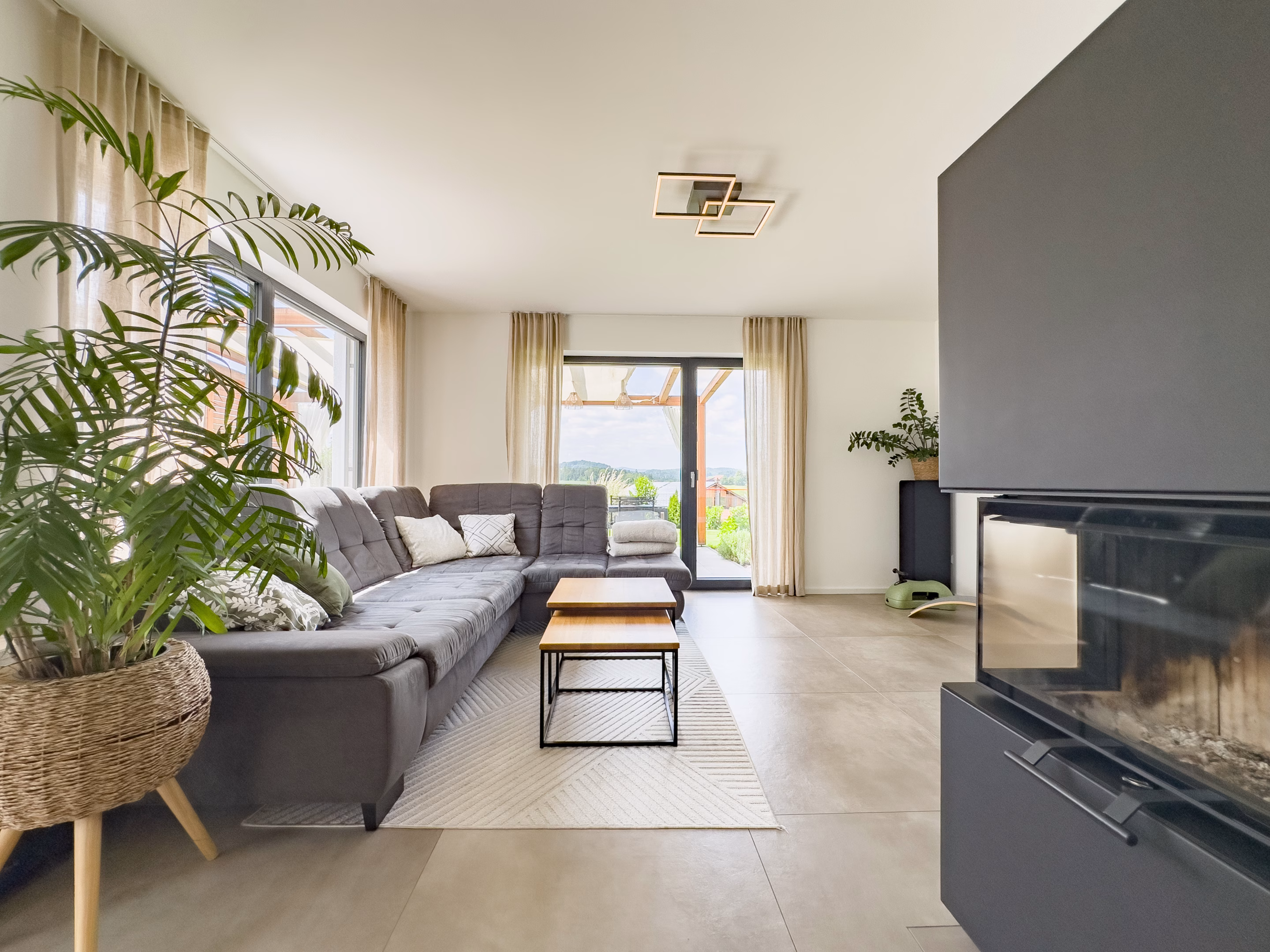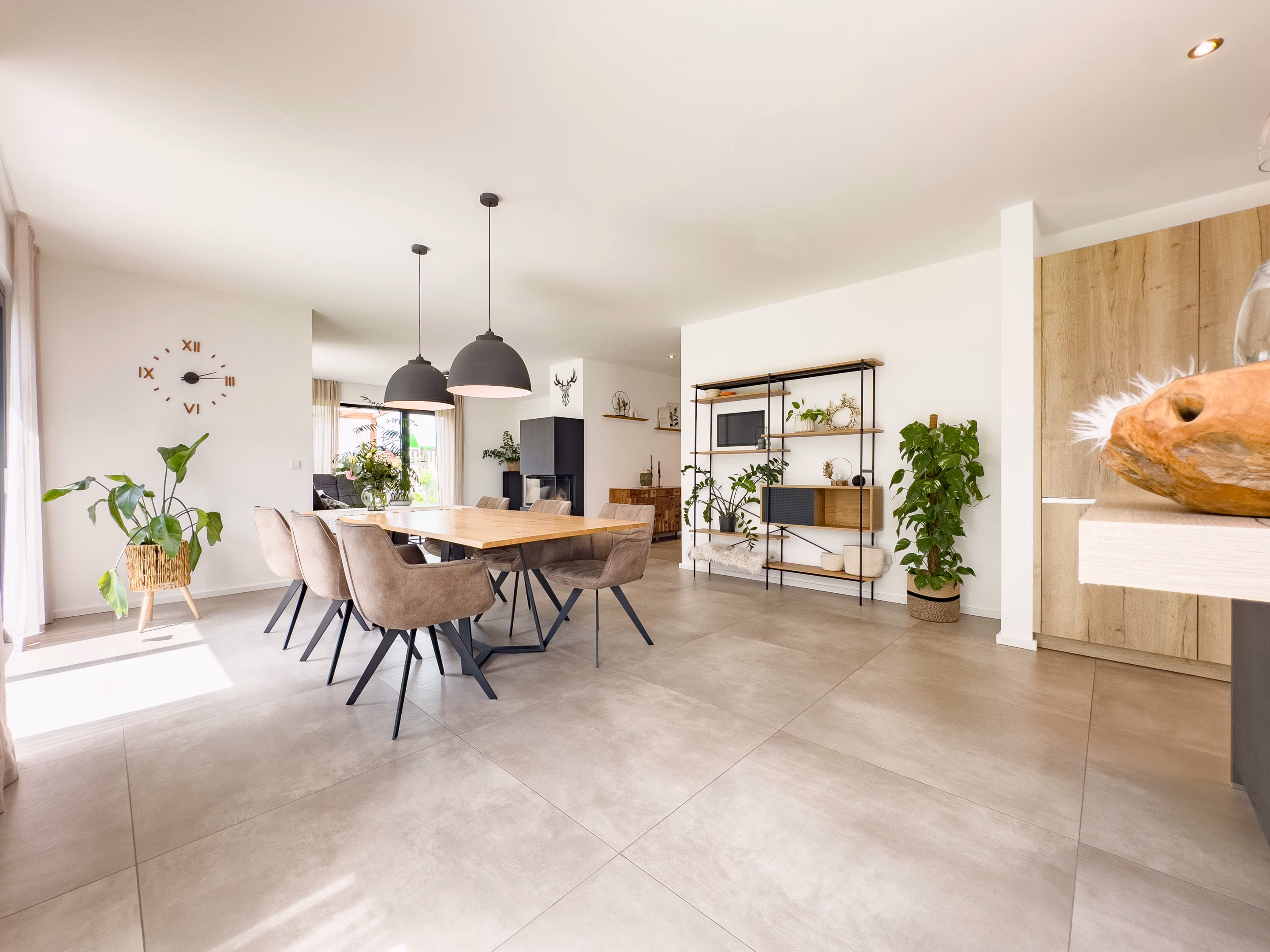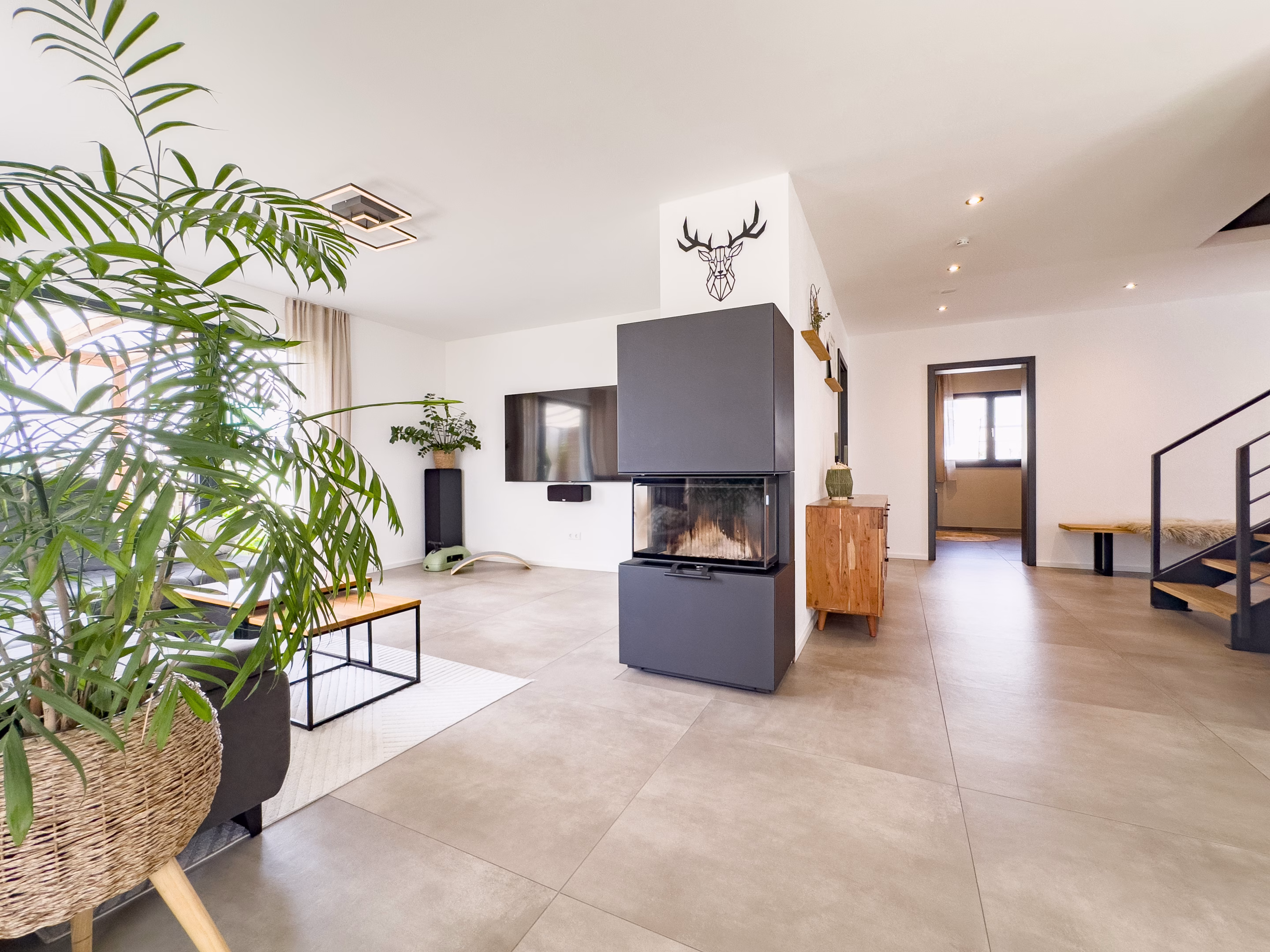 – geräumiger, moderner Wohn-, Essbereich mit Kamin
