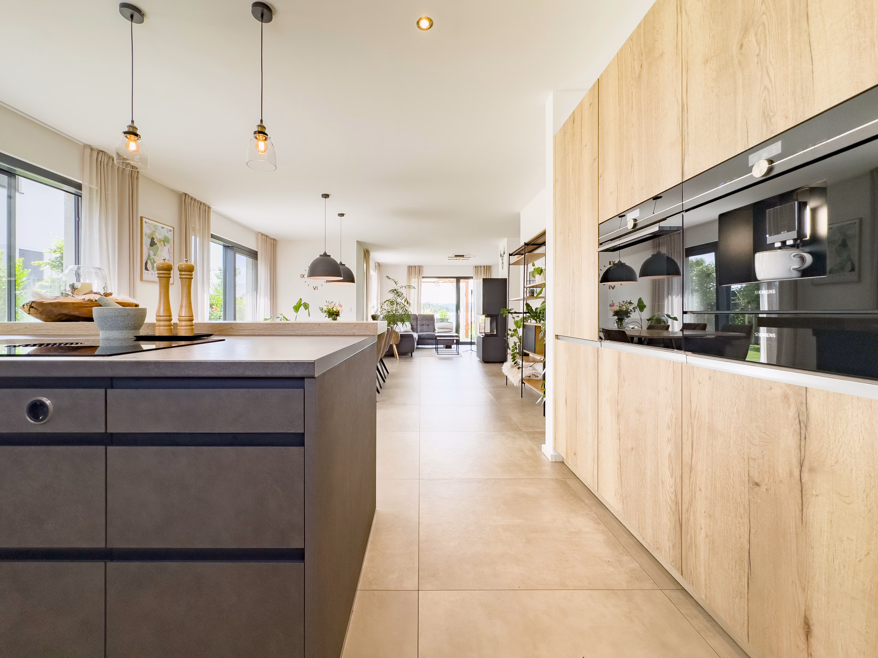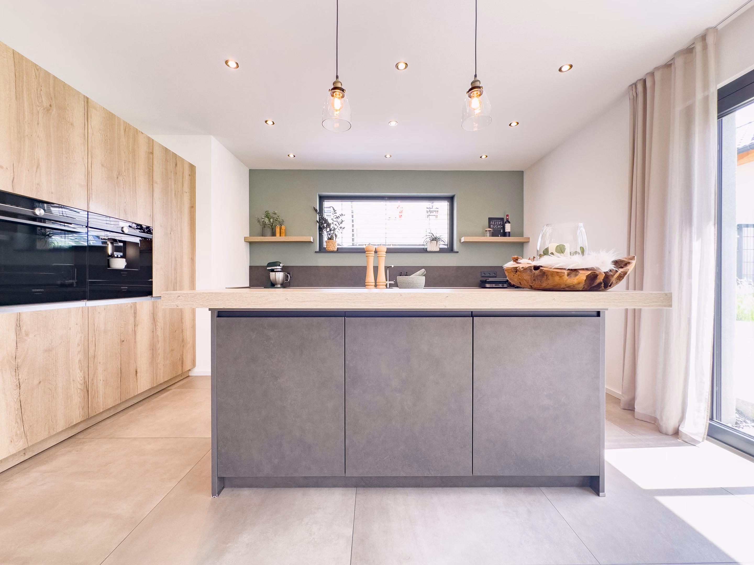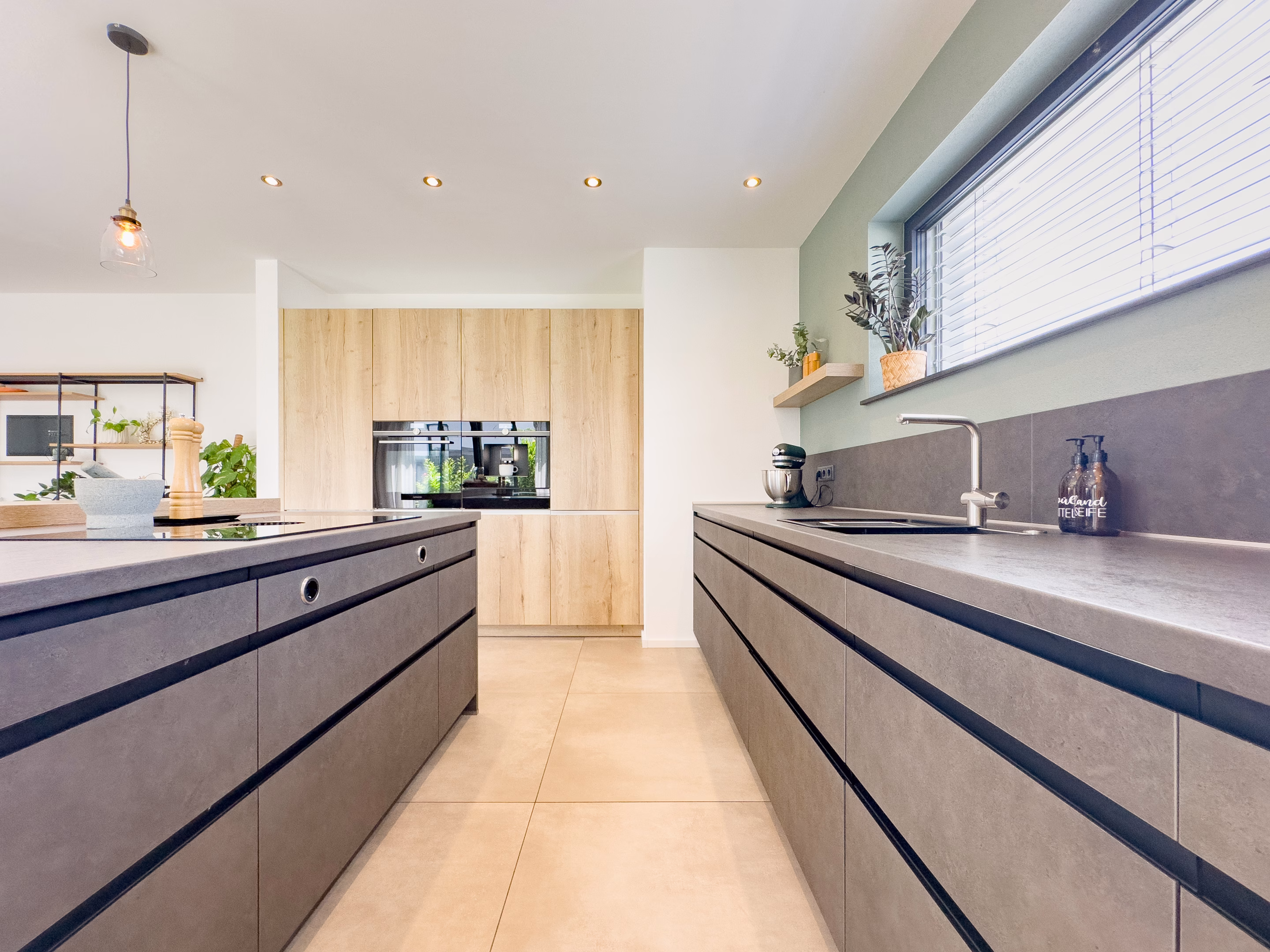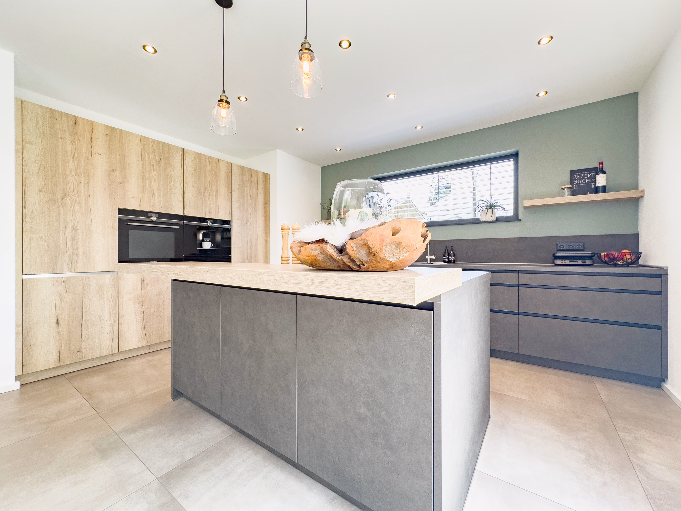 Der Wohn- und Essbereich im Erdgeschoss ist ein echtes Statement in Sachen Design und Funktion: Edle, großformatige Fliesen (90×90 cm), ein stylischer Kaminofen und ein integriertes Surround-System schaffen eine Atmosphäre, die Behaglichkeit mit technischer Raffinesse verbindet. Der offene Raum fließt nahtlos in die Küche über – eine Maßanfertigung, die selbst passionierte Hobbyköche begeistert. Von der eleganten Kücheninsel mit Bora X Pure Induktionskochfeld bis hin zu eingebauter Kaffeemaschine, Pyrolyse-Backofen, Wärmeschublade und Siemens Studioline sowie Miele Geräten wurde hier auf absolute Spitzenqualität gesetzt. Jeder Handgriff sitzt, jede Funktion begeistert.