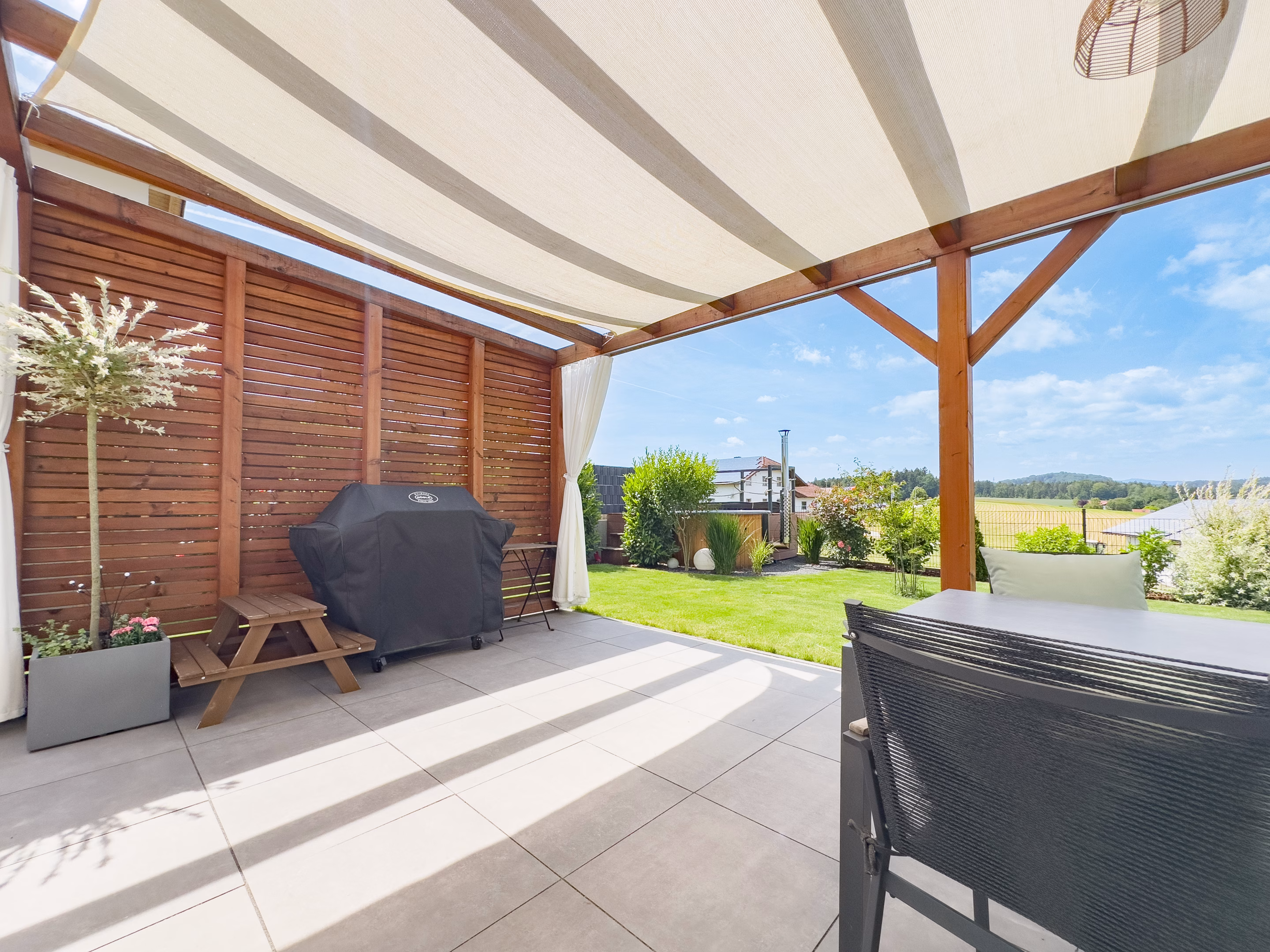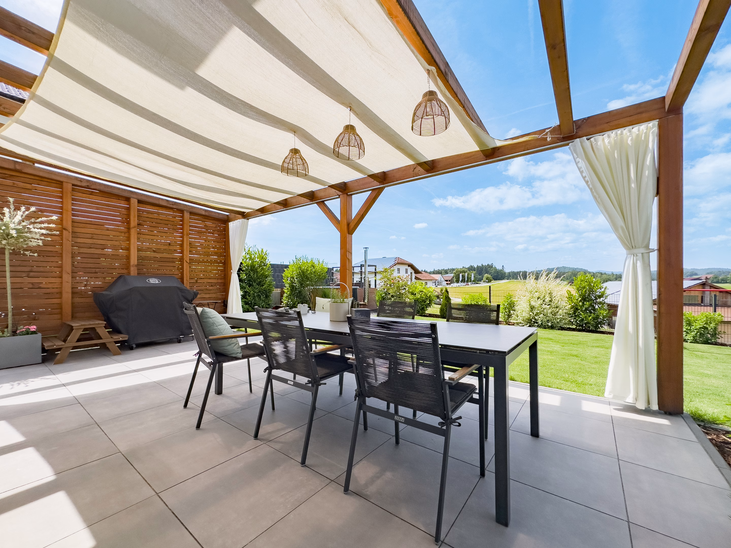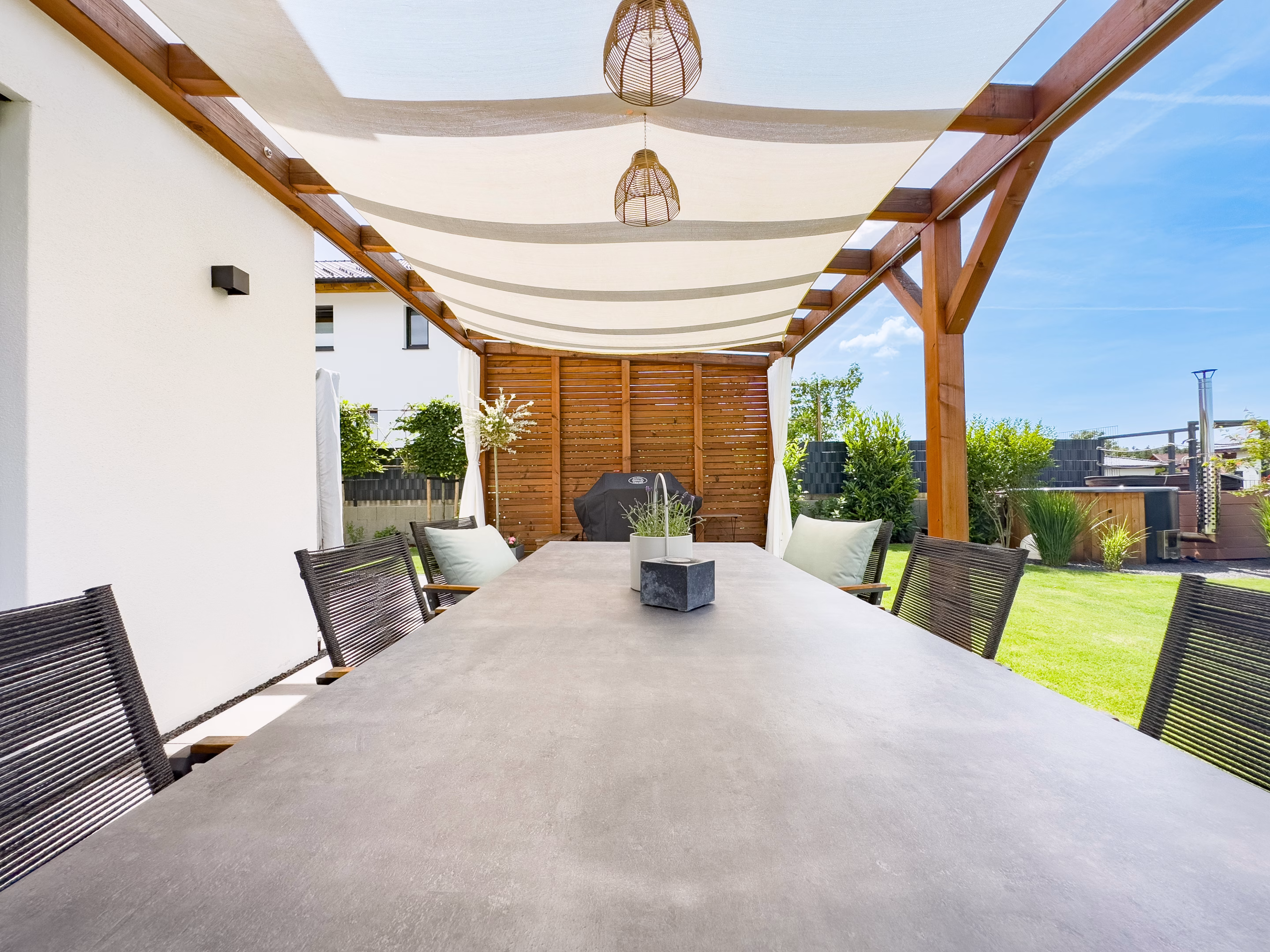 – gemütliche L-förmige Terrasse mit Holz-Pergola (7 x 3,70 Meter)
