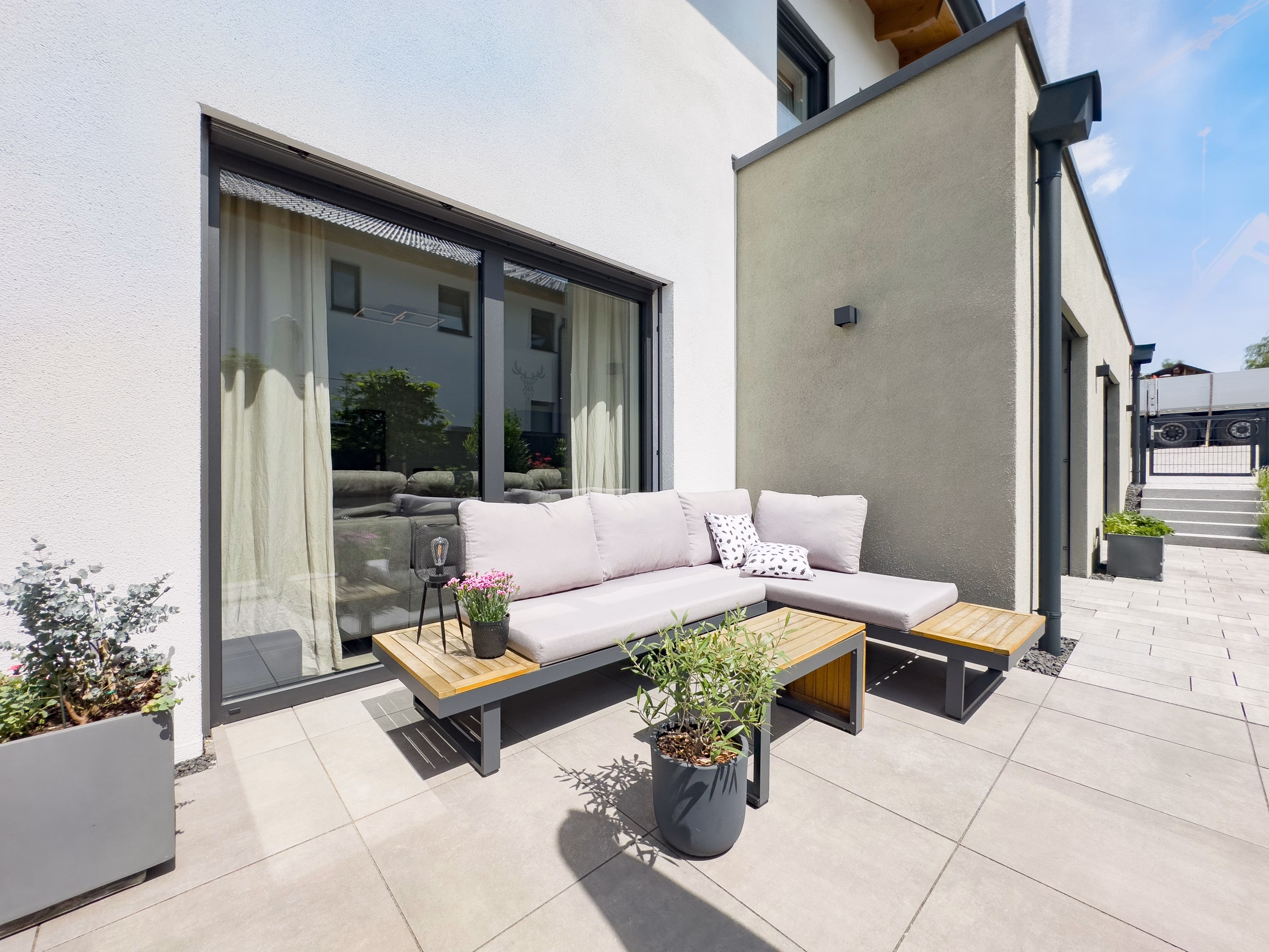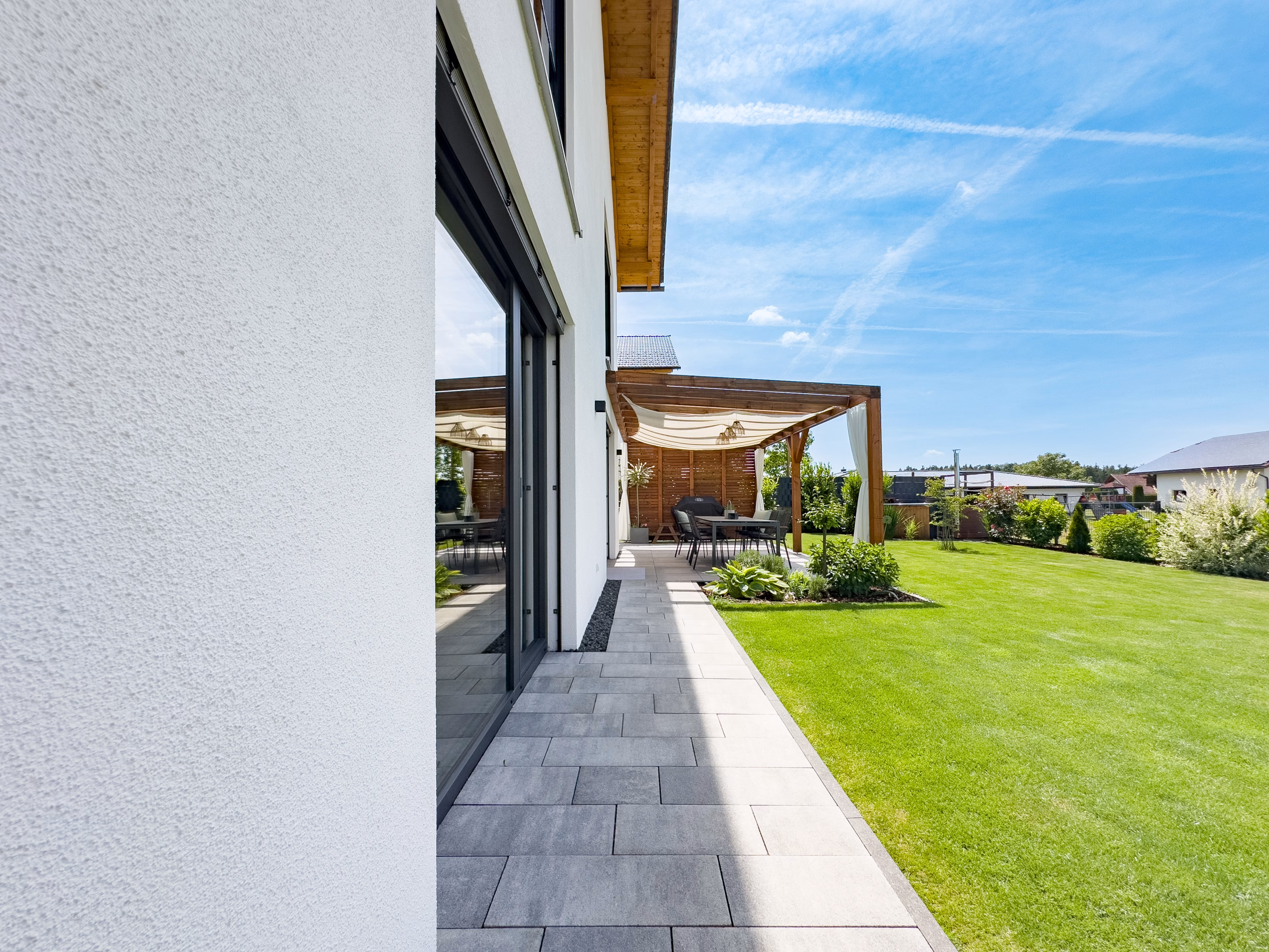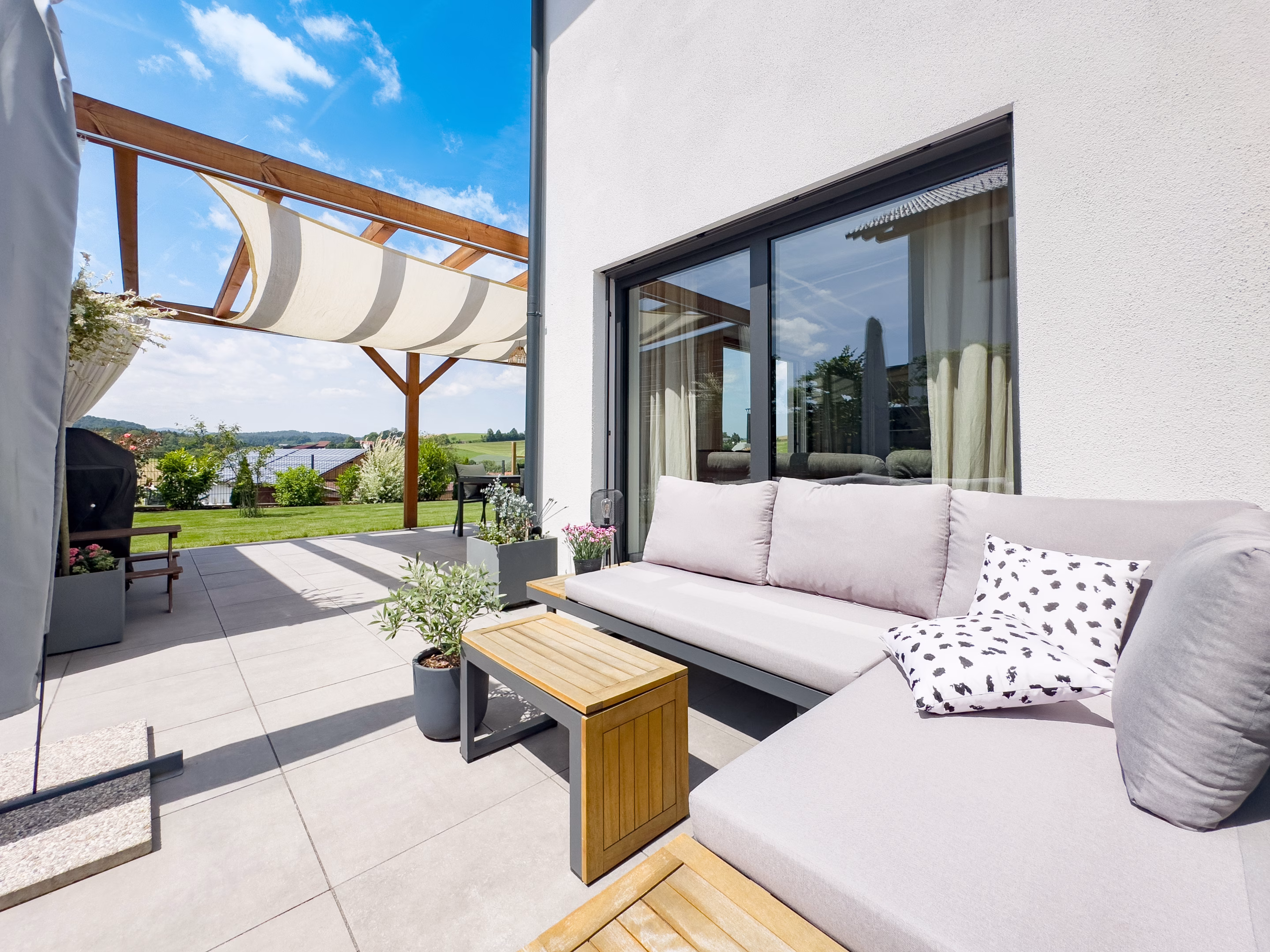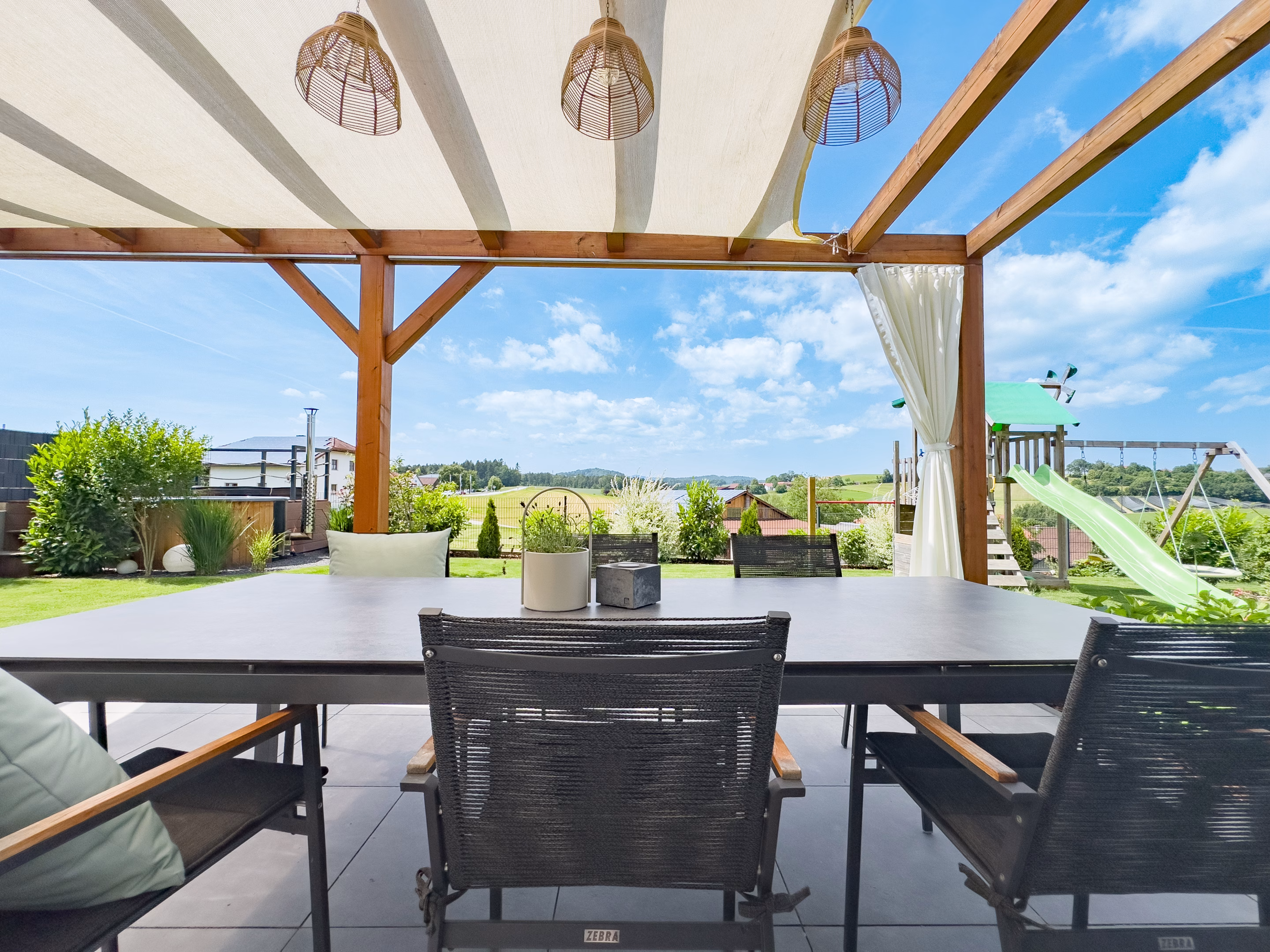 – gemütliche L-förmige Terrasse mit Holz-Pergola (7 x 3,70 Meter)