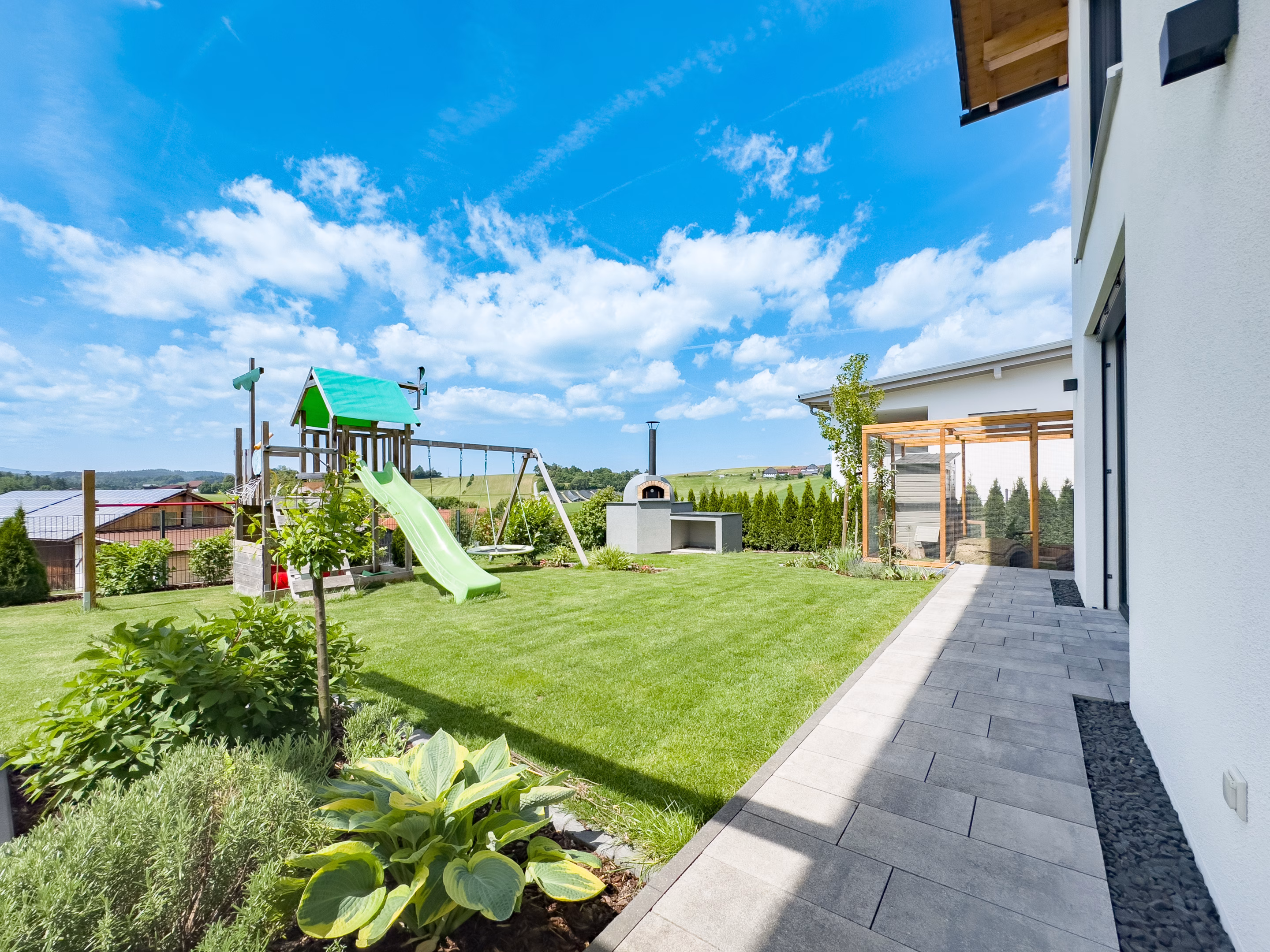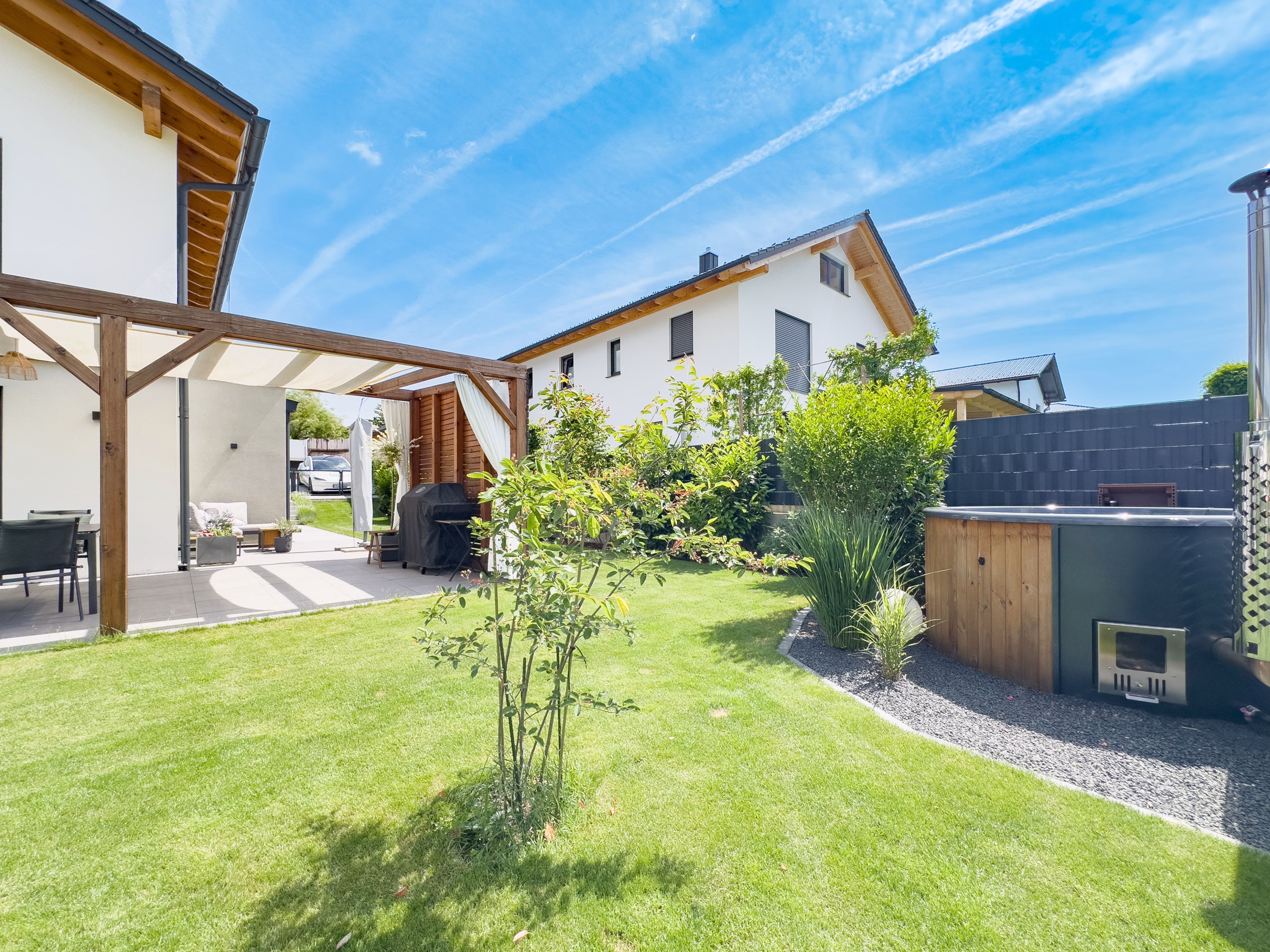 Auch draußen überzeugt das Haus auf ganzer Linie. Der Garten – komplett eingezäunt und nach Südwesten ausgerichtet – wird zum privaten Freizeitparadies: ein hochwertiger Hot Tub mit Sprudelfunktion und Beleuchtung, ein gemauerter Kuppelofen mit Arbeitsfläche, eine gemütliche Holz-Pergola auf der Terrasse, ein Spielturm für Kinder und ein liebevoll angelegter Hasenstall mit Freilauf zeigen, wie viel Liebe in jedem Detail steckt. Die Pflanzenvielfalt, Beerensträucher und das gepflegte Grün unterstreichen die besondere Atmosphäre.