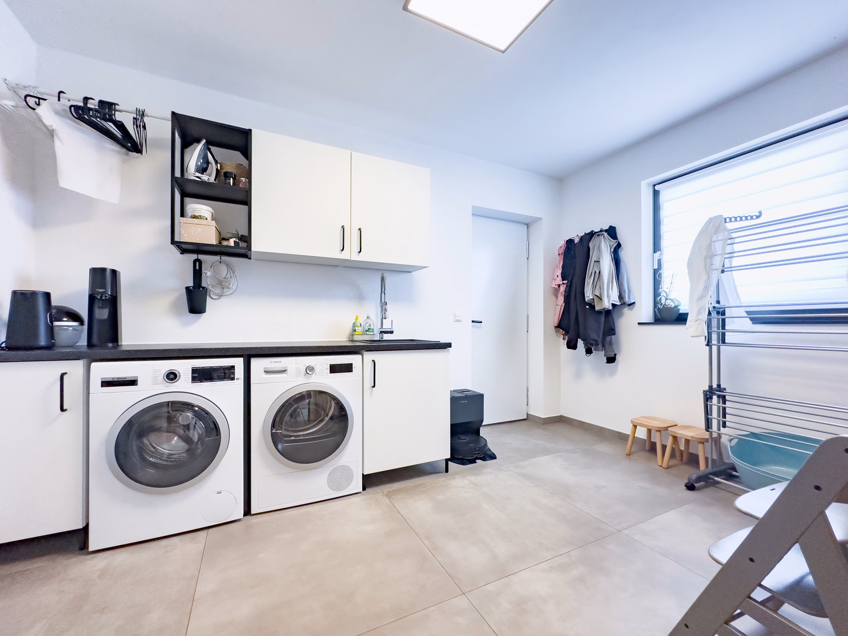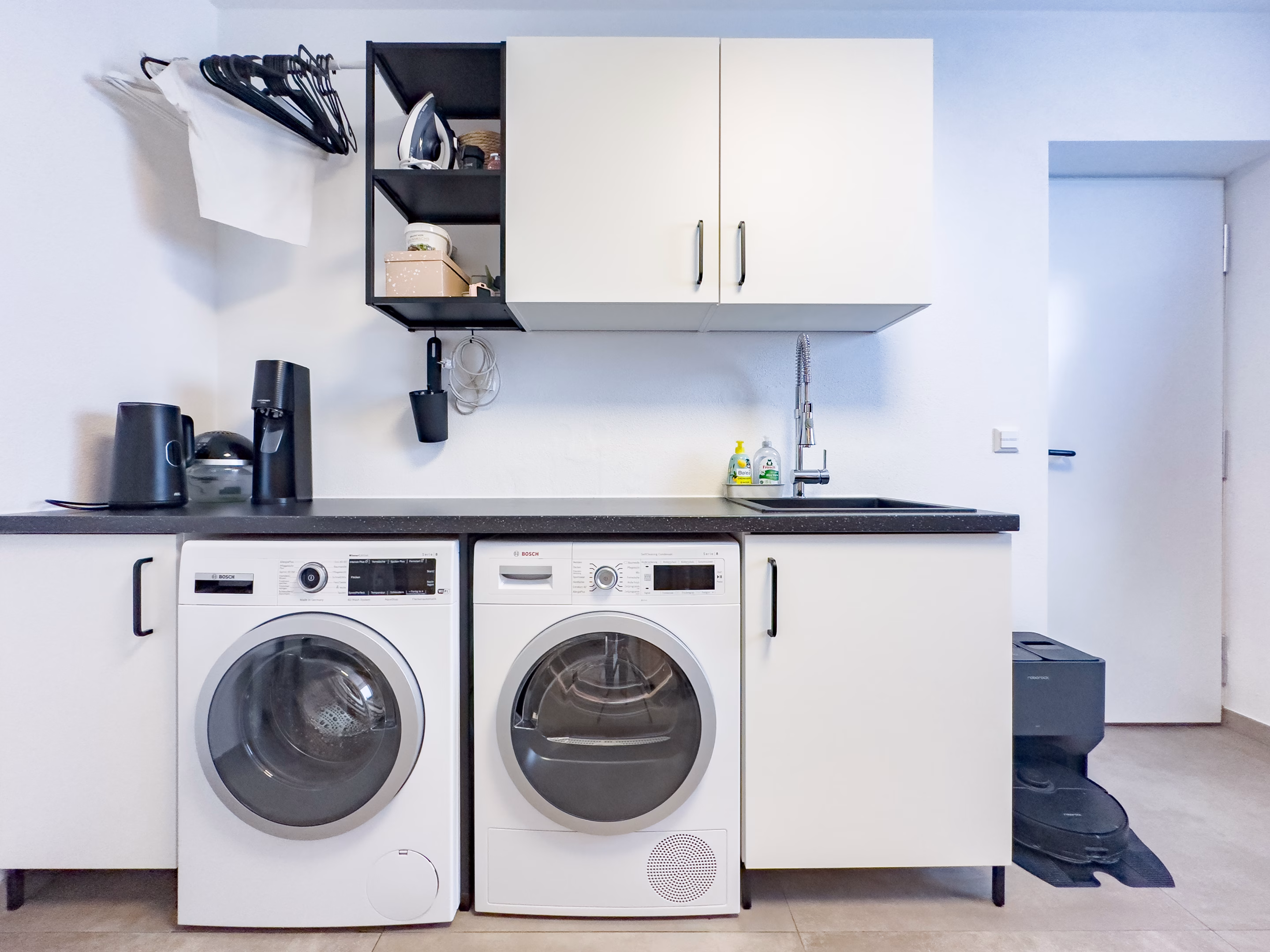 – Hauswirtschaftsraum mit Platz für Waschmaschine, Trockner und Regale als Durchgangszimmer Richtung Technikraum
