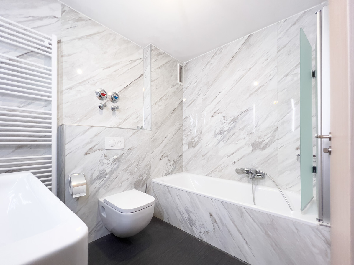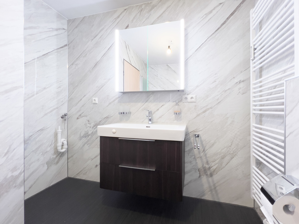 Das Badezimmer präsentiert sich ebenfalls im neuen Glanz und bietet mit Badewanne, Waschbecken, WC und Waschmaschinenanschluss eine durchdachte Ausstattung. Ergänzt wird es durch ein separates Gäste-WC – praktisch und komfortabel zugleich. Neue Böden, moderne Türen sowie erneuerte Schalter und Steckdosen verleihen der Wohnung ein stimmiges Gesamtbild und unterstreichen die Qualität der Sanierung.