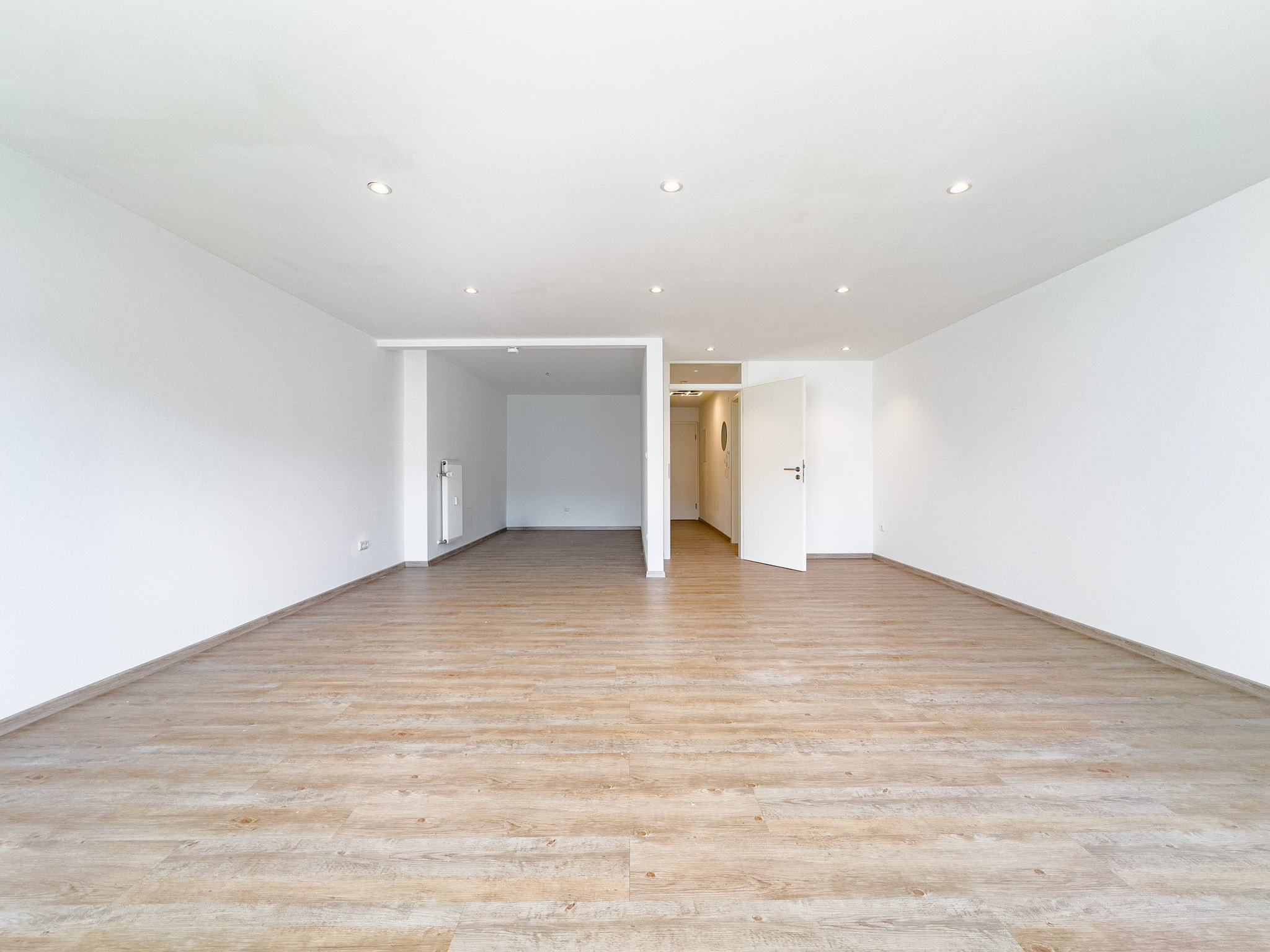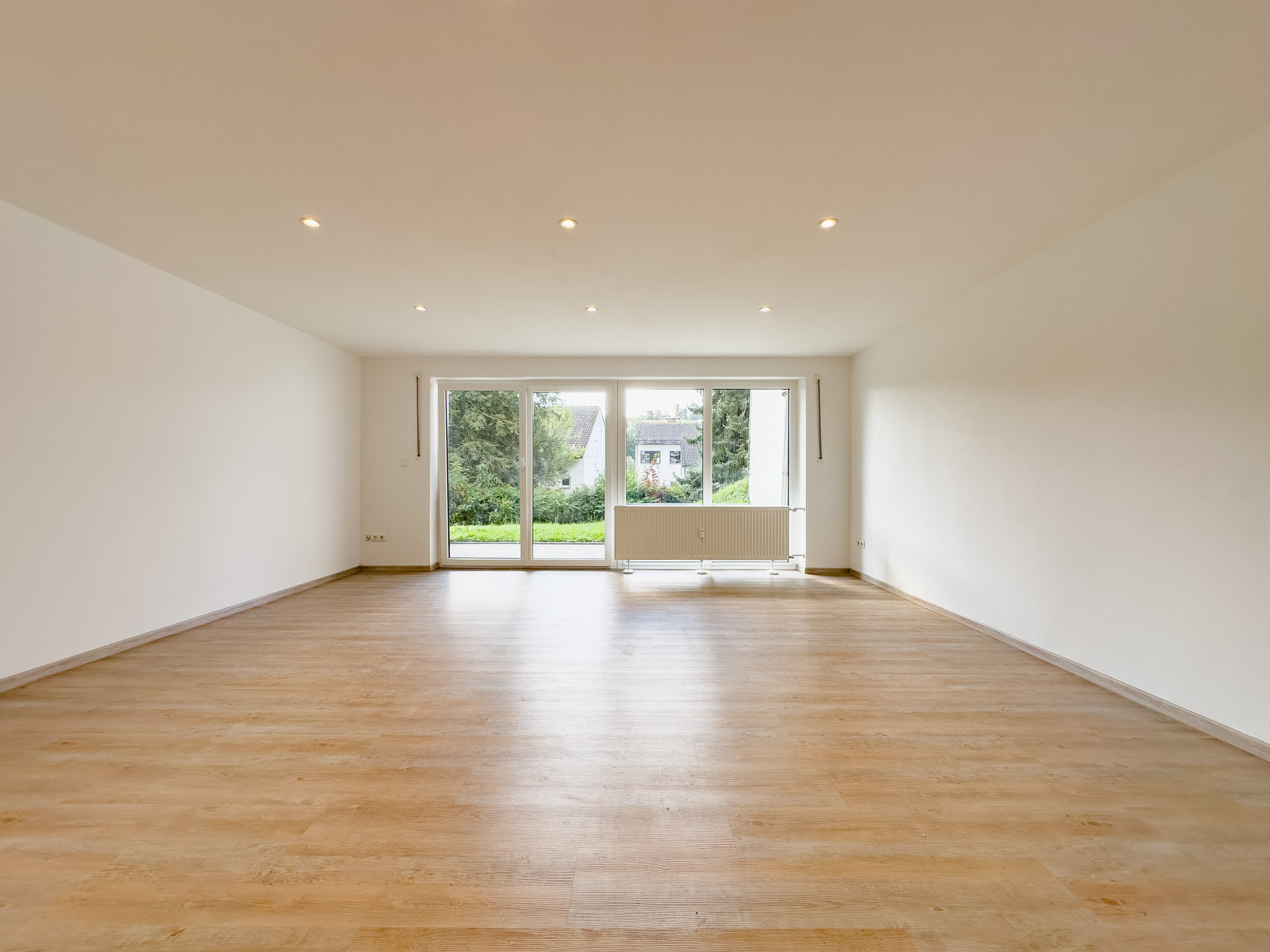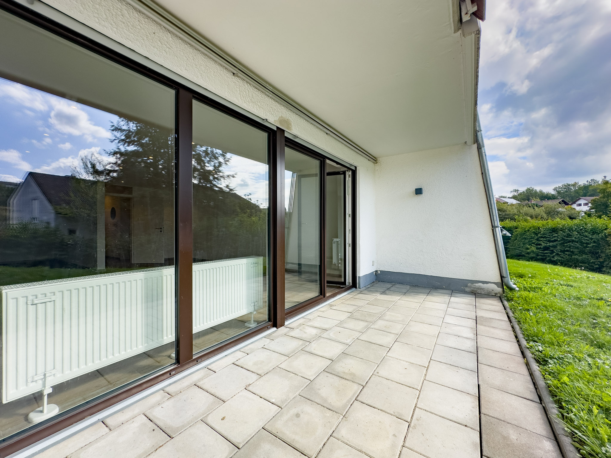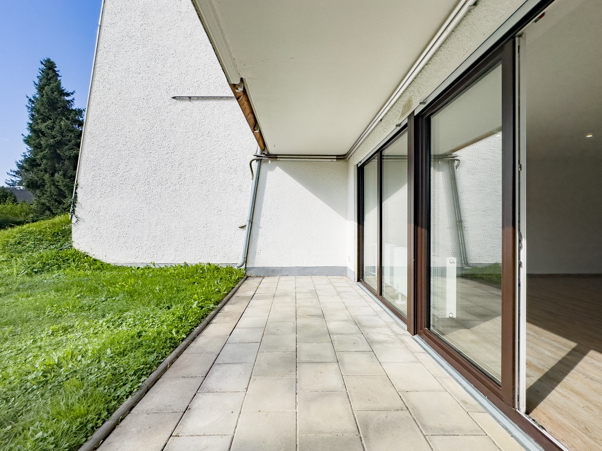 Der zentrale Wohnbereich ist offen gestaltet und bietet dank einer separaten Nische eine ideale Möglichkeit zur Abtrennung eines Schlafbereiches. Eine große Fensterfront sorgt für viel Tageslicht und eröffnet den Blick ins Grüne. Von hier aus gelangt man direkt auf die rund 10 m² große, überdachte Terrasse mit Südausrichtung – ein Platz zum Entspannen, der die Wohnqualität erheblich steigert. Auch der Garten steht den Bewohnern zur Nutzung zur Verfügung.