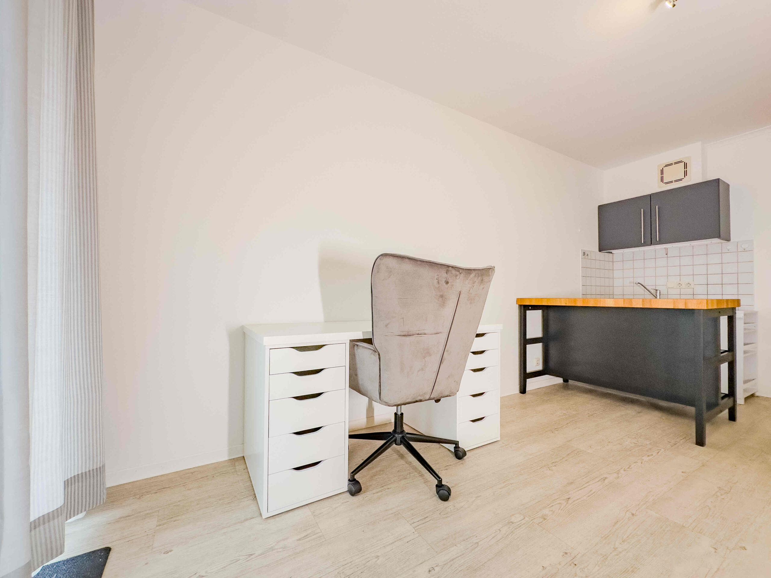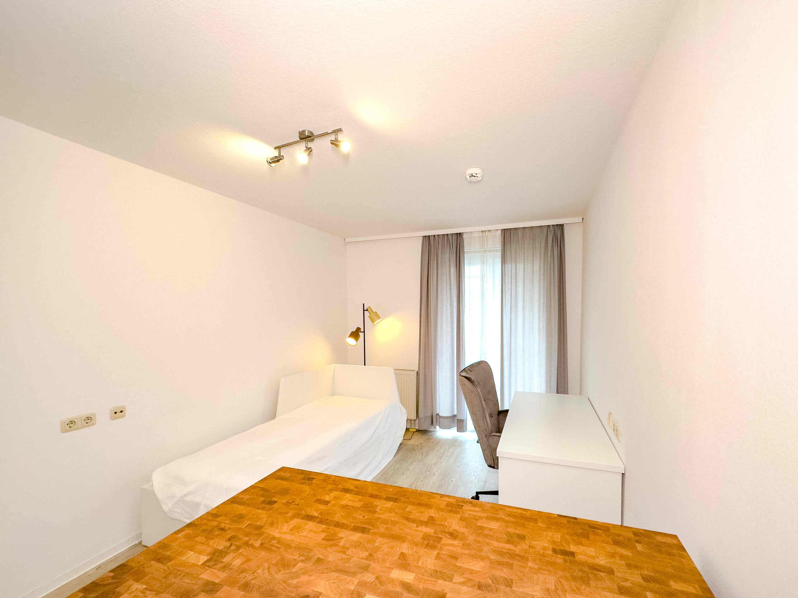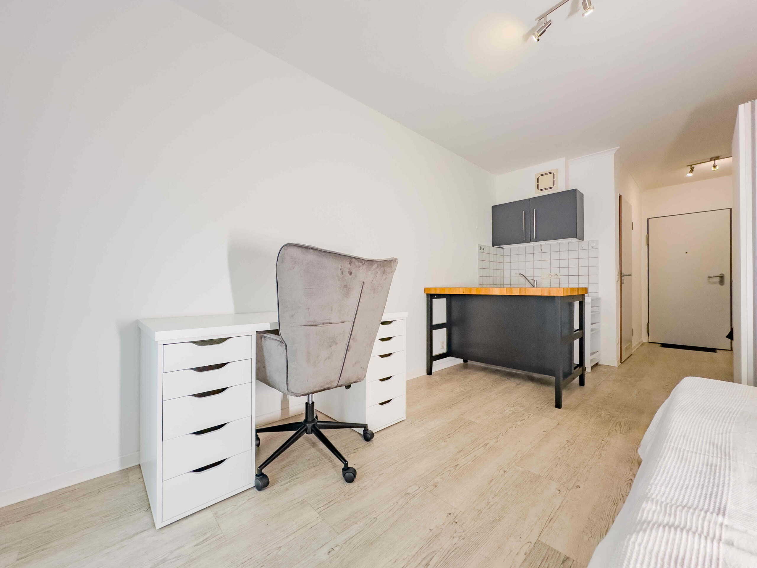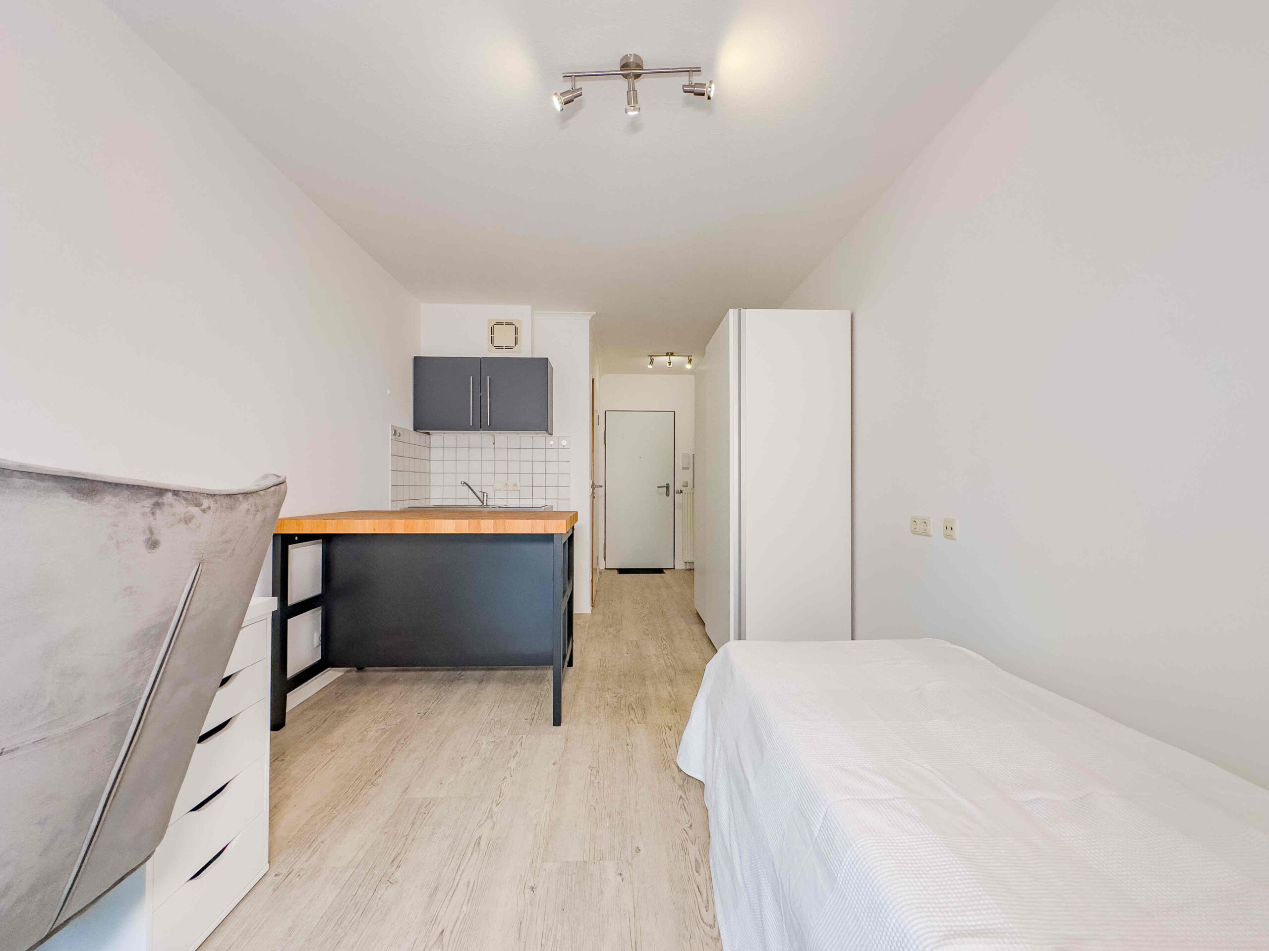 Die Einrichtung lässt keine Wünsche offen: Ein neuer Kleiderschrank, ein modernes Bett und ein praktischer Schreibtisch in zeitlosem Weiß machen das Wohnen hier besonders angenehm. Die Single-Küche ist perfekt ausgestattet – inklusive Kühl-/Gefrierkombi und Cerankochfeld – und bereit für alles, vom schnellen Frühstück bis zur Mitternachts-Pasta. Das Bad mit Dusche und WC bietet alles, was du brauchst, um dich frisch und startklar zu fühlen.